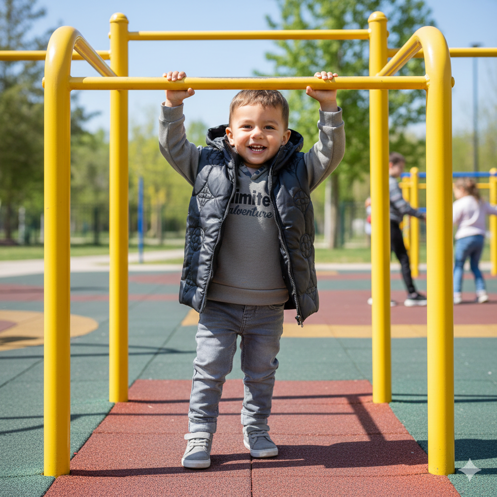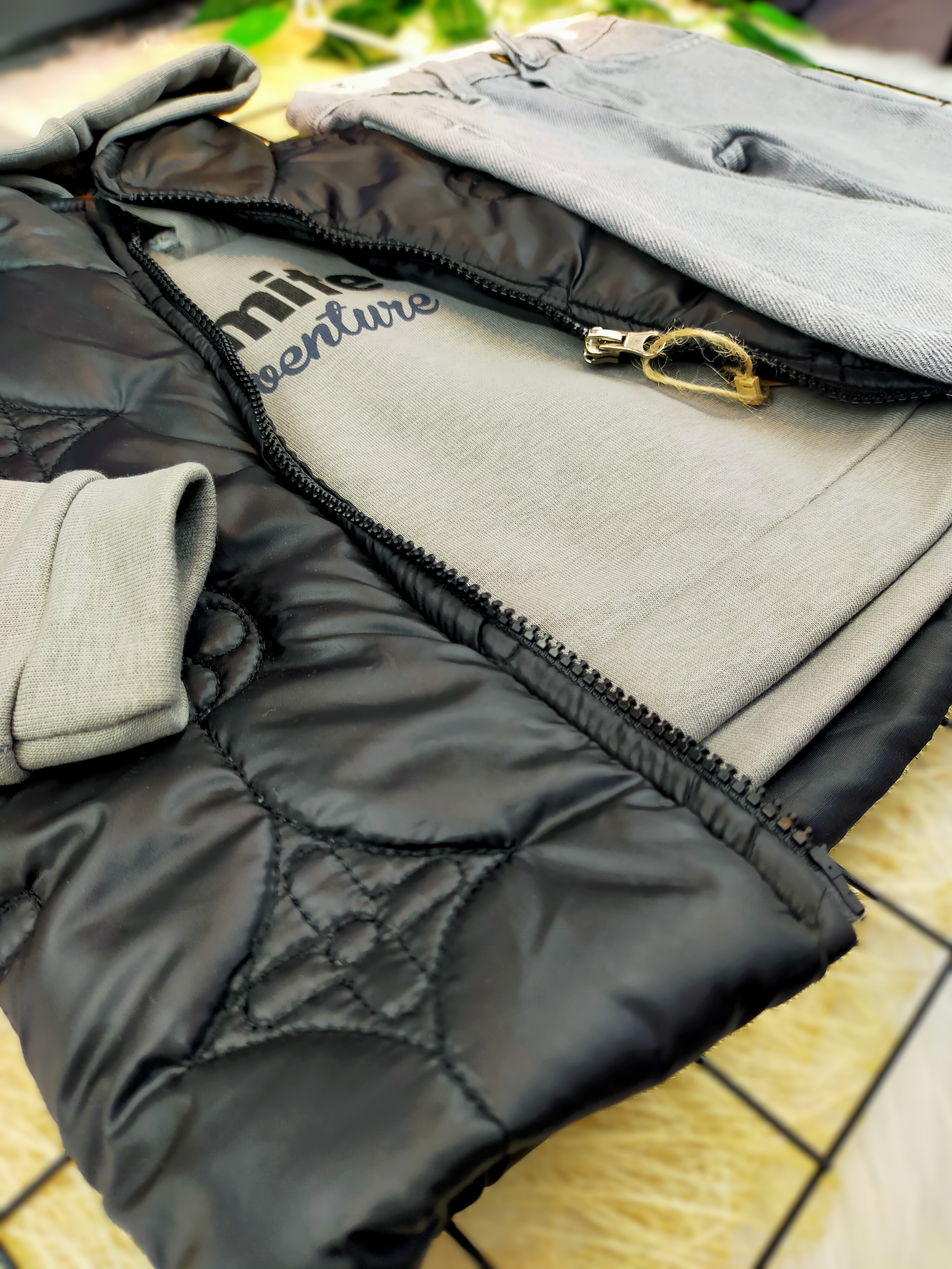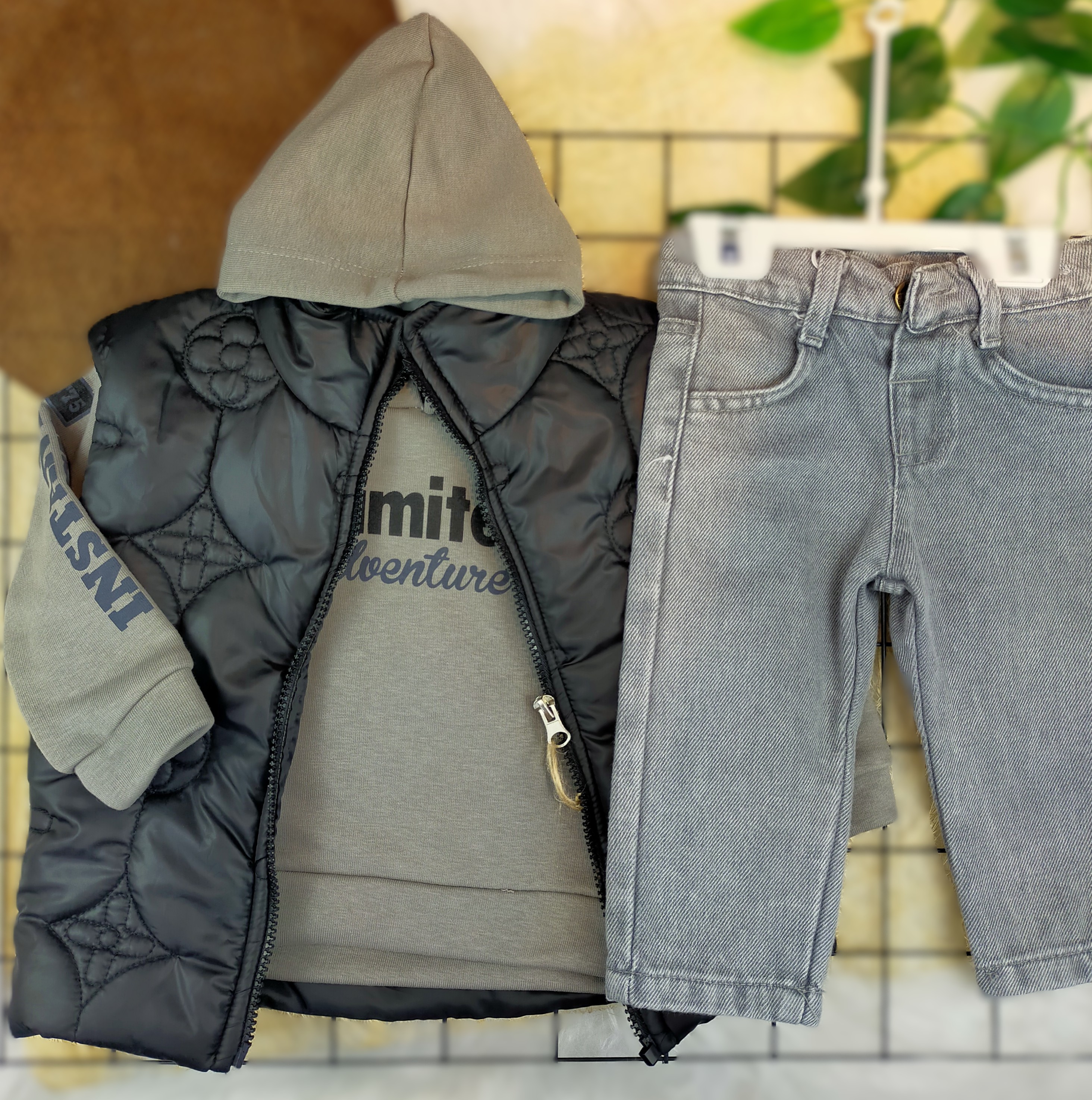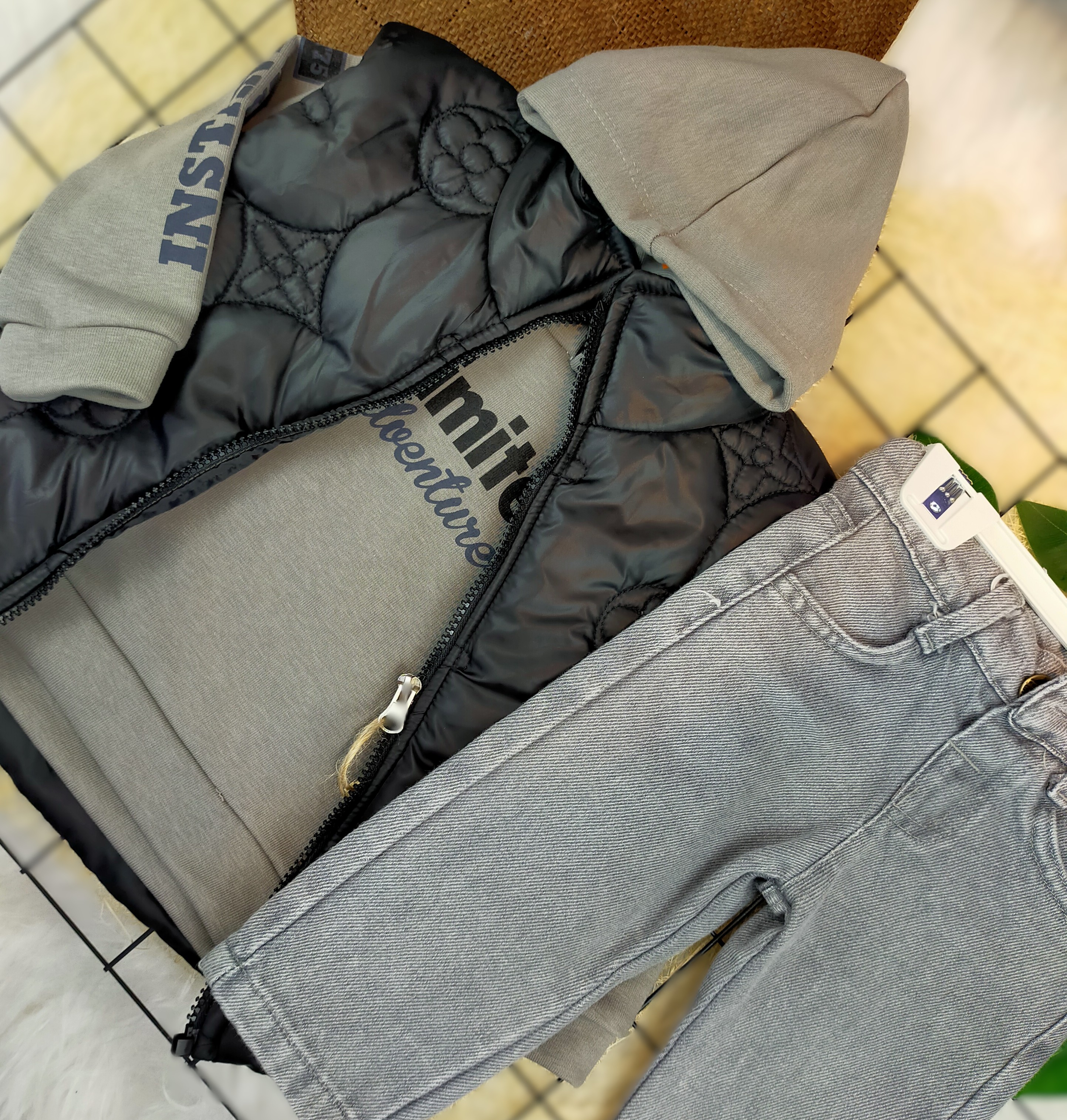 Çocuk modasında rahat ve zarif seçimler arayan ebeveynler için mükemmel bir seçenek! 1 - 4 yaş arasındaki küçük yavrularınız için tasarlanmış olan bu şişme yelek, kapşonlu sweat ve kot pantolon kombinasyonu, hem şıklığı hem de konforu bir arada sunuyor.