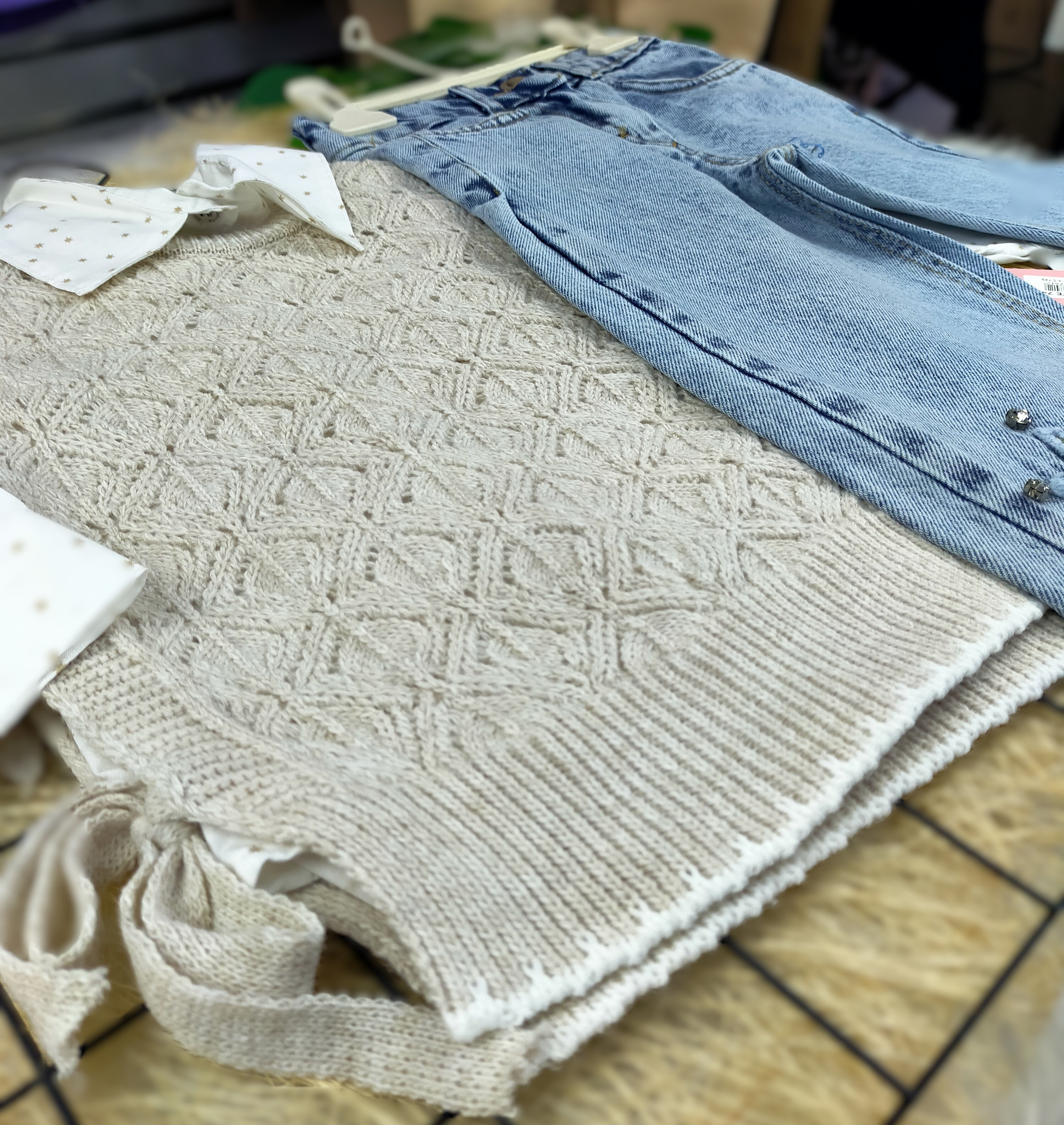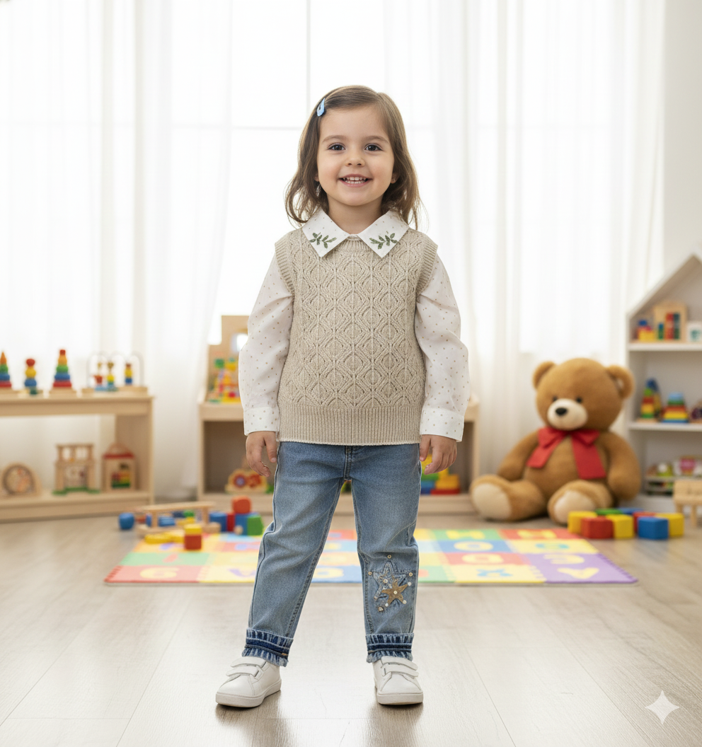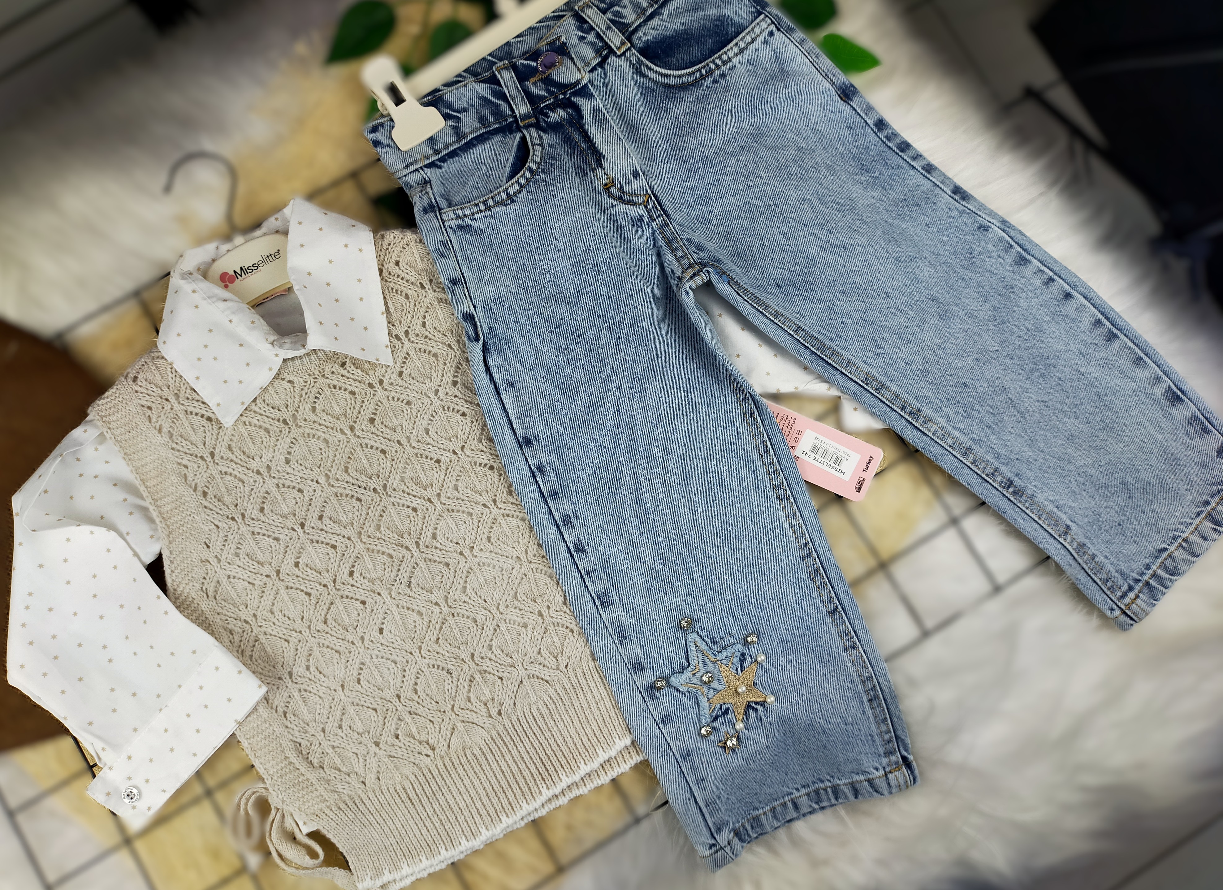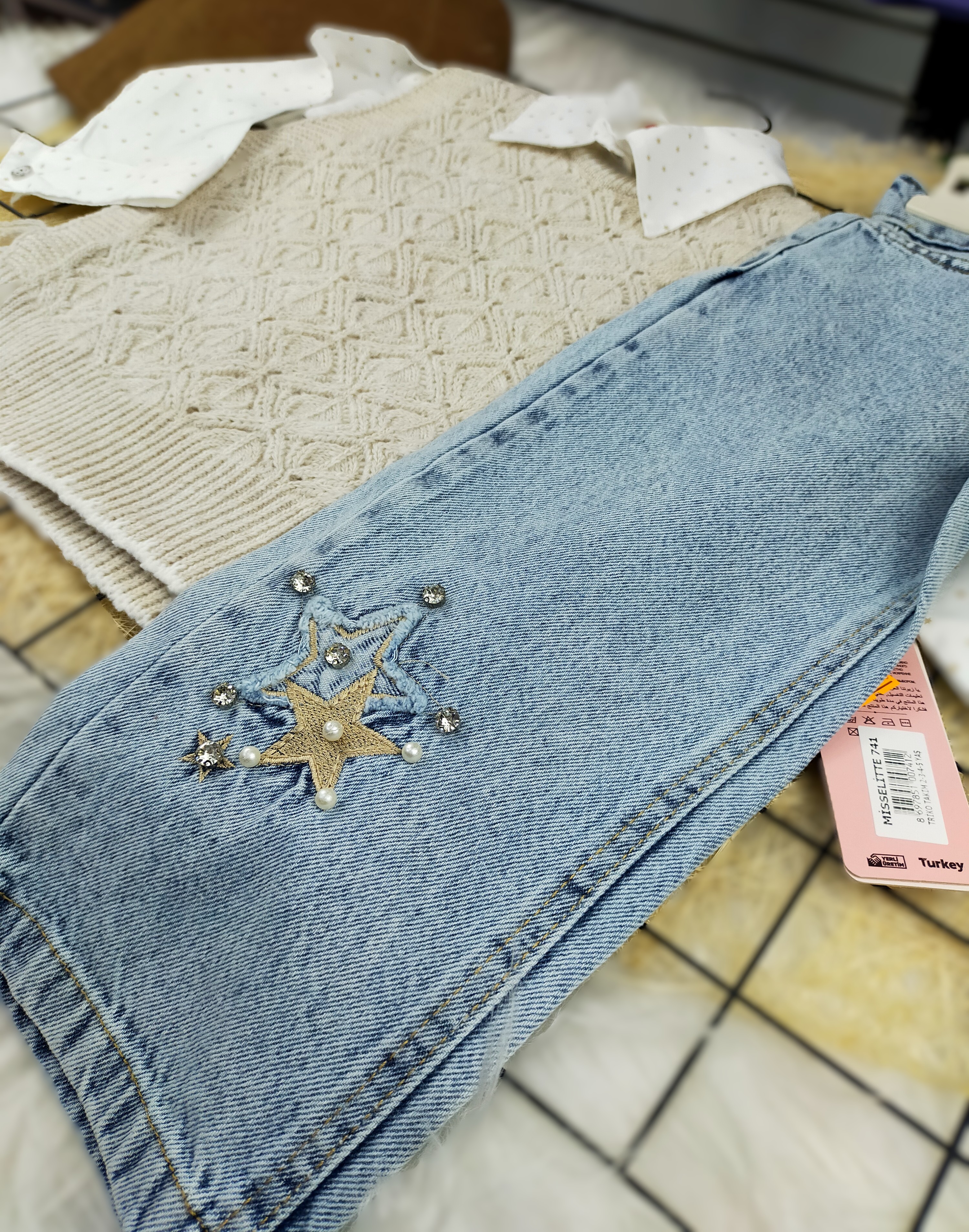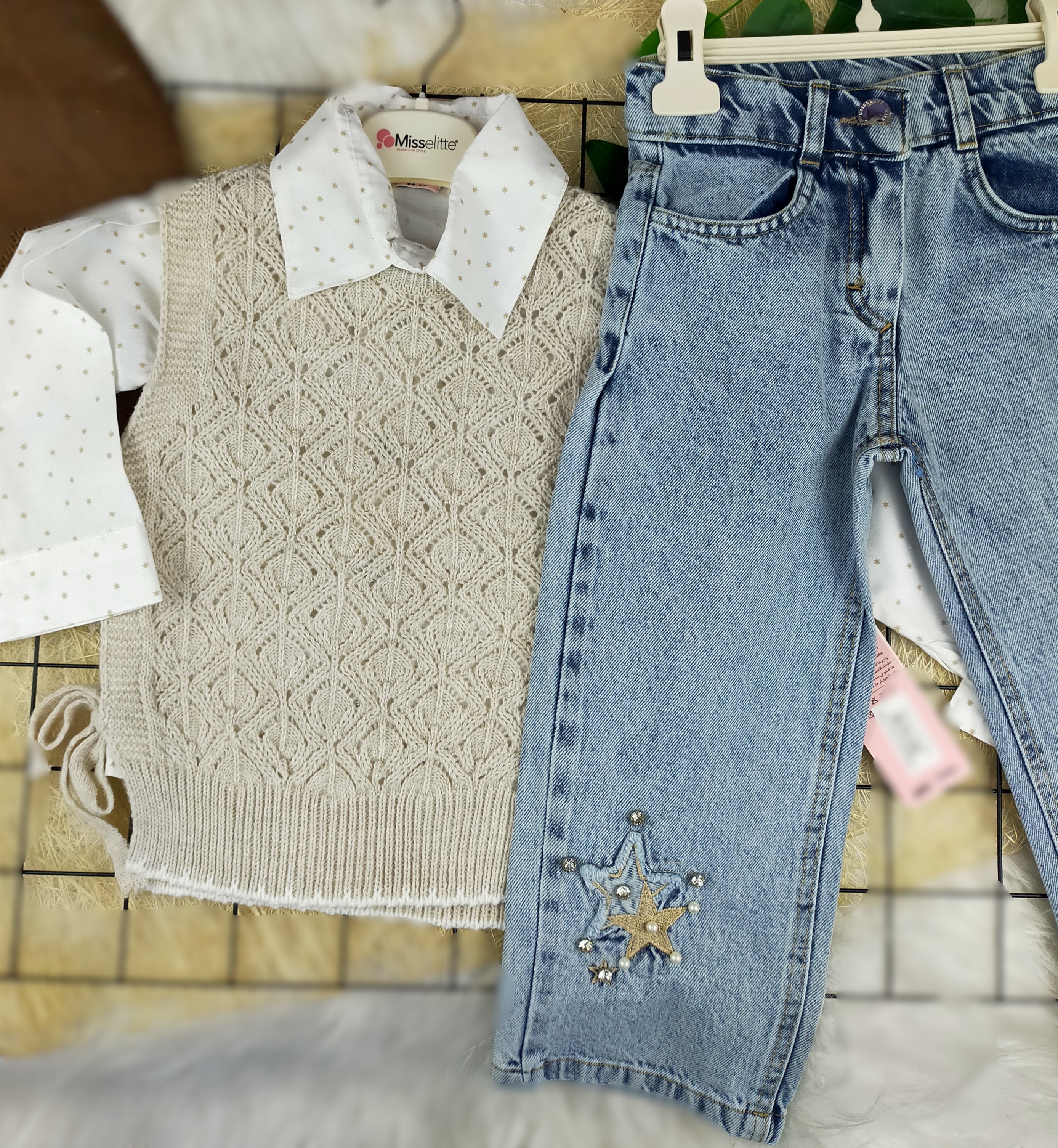 2 - 5 yaş arası dokuma süveter, gömlek ve kot pantolonlu üçlü kız çocuk takım, pratiklik, konfor ve şıklığı bir arada sunan vazgeçilmez bir üründür. Ebeveynler, çocuklarının hem şık görünmesini hem de rahat hissetmesini sağlayacak bu takımı kaçırmamalıdır. Her küçük kızın dolabında bulunması gereken bu set, ona neşeli ve özgüvenli bir görünüm kazandıracak.