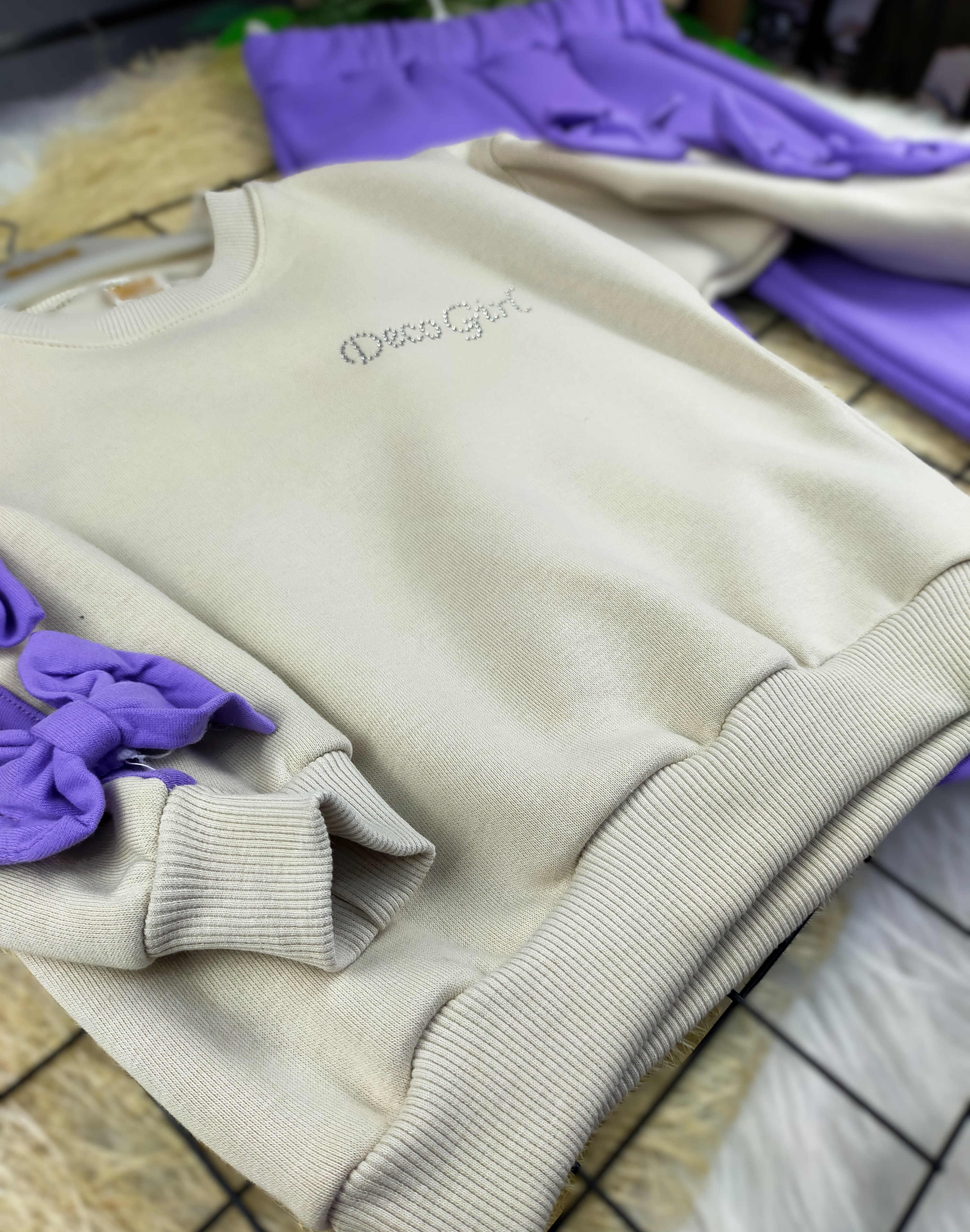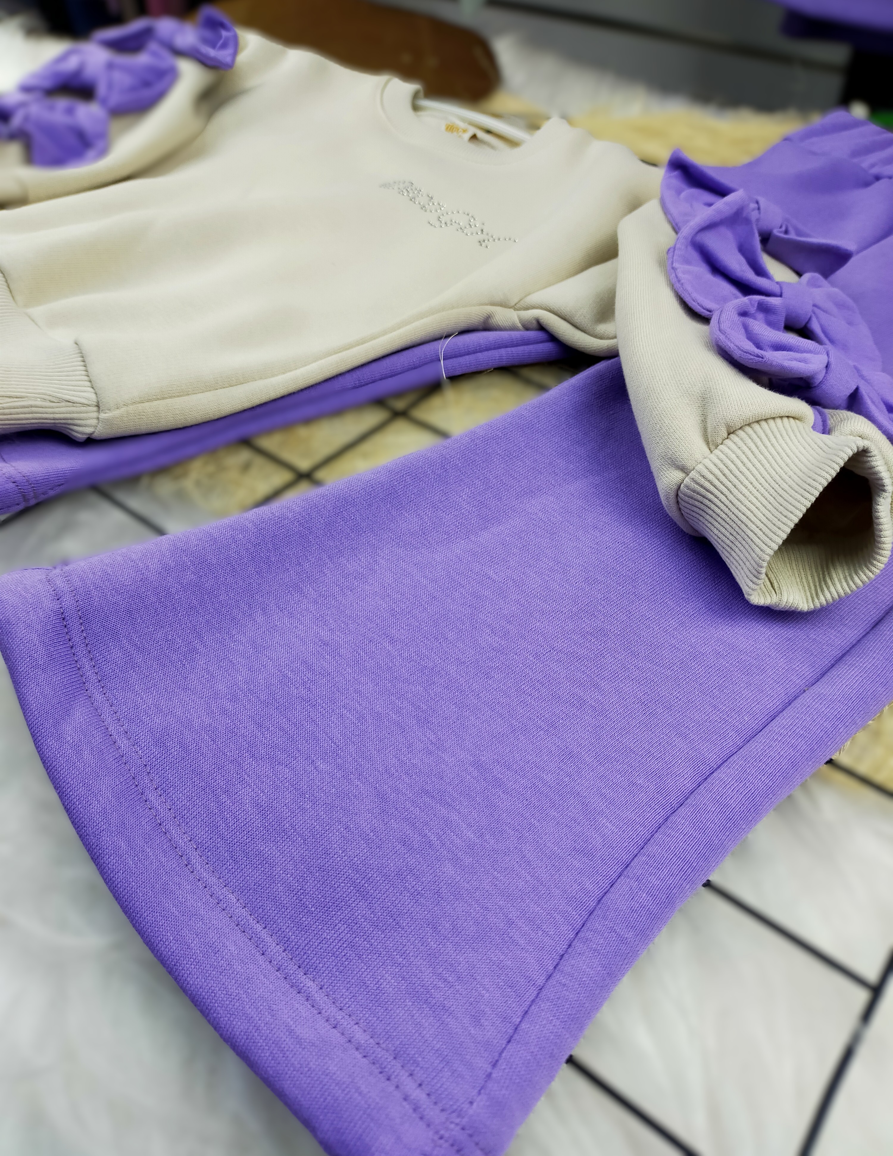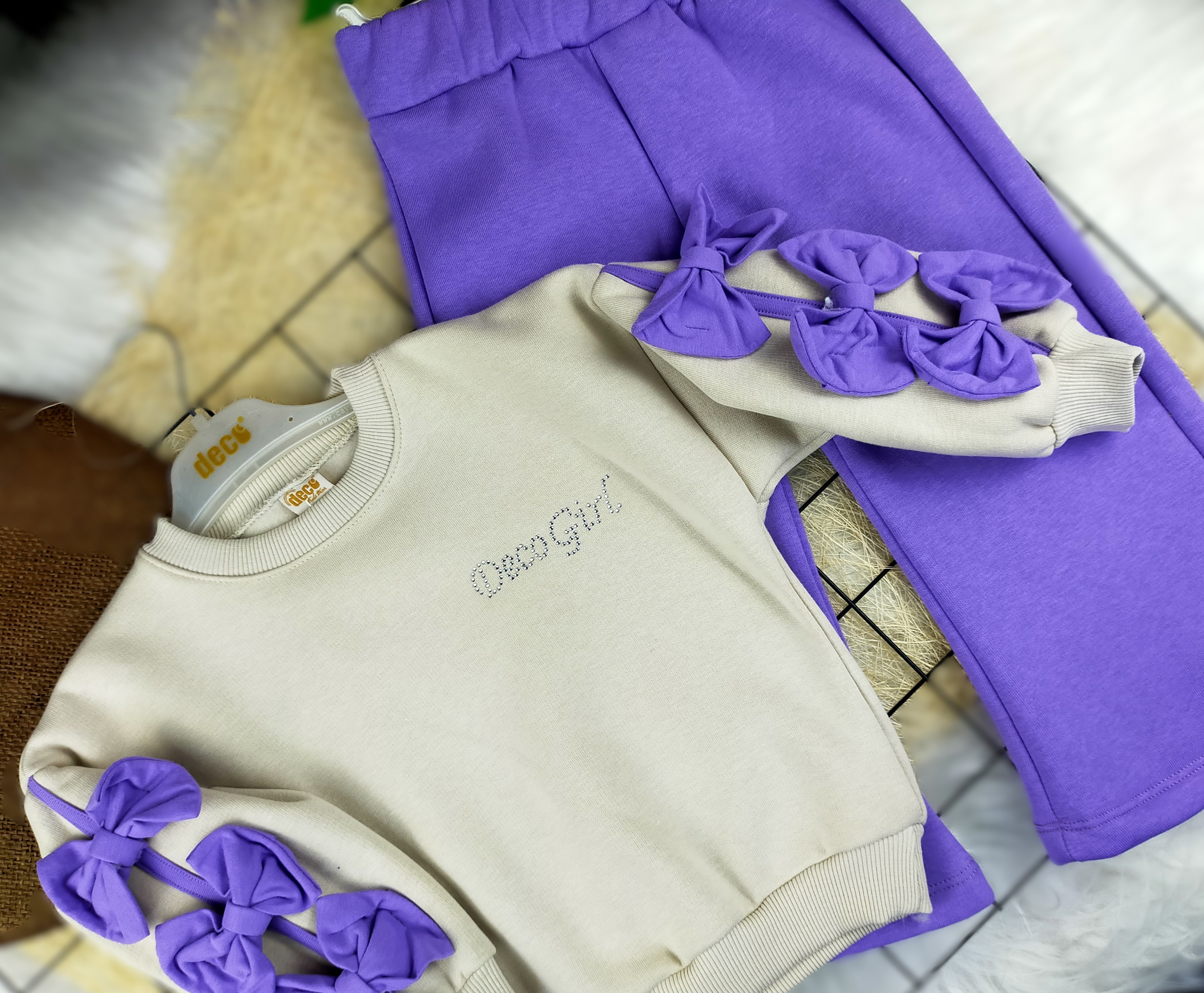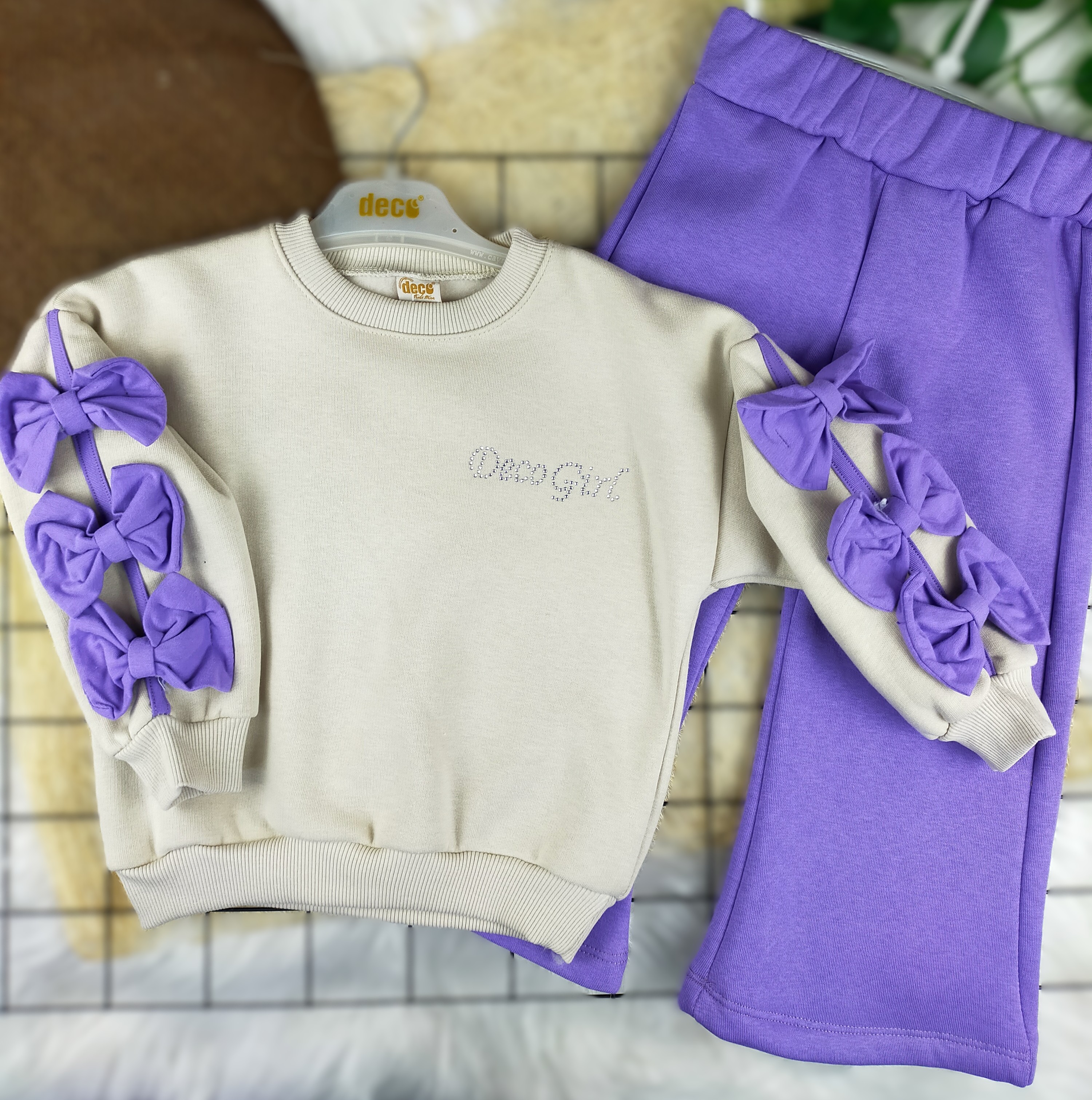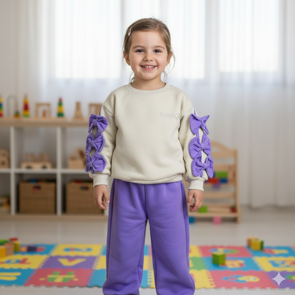 Bu şık takım; bir oversize üst ve bol paça pantolondan oluşmaktadır. Üst kısım, sevimli bir fiyonk detayı ile çocuklarınıza zarif bir görünüm kazandırırken, bol paça pantolon ise hareket kabiliyetlerini kısıtlamadan rahat bir şekilde oynamalarına olanak tanır.