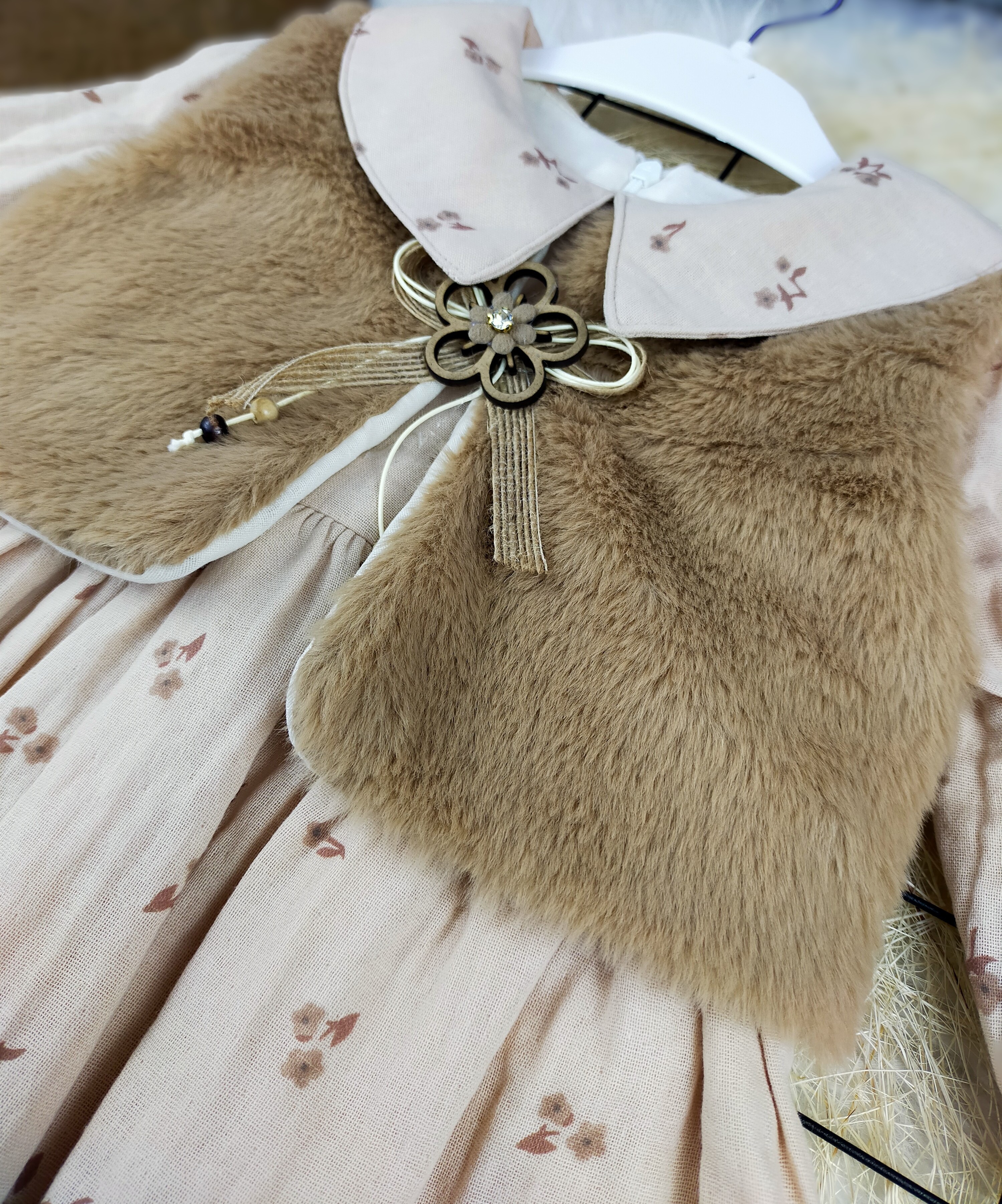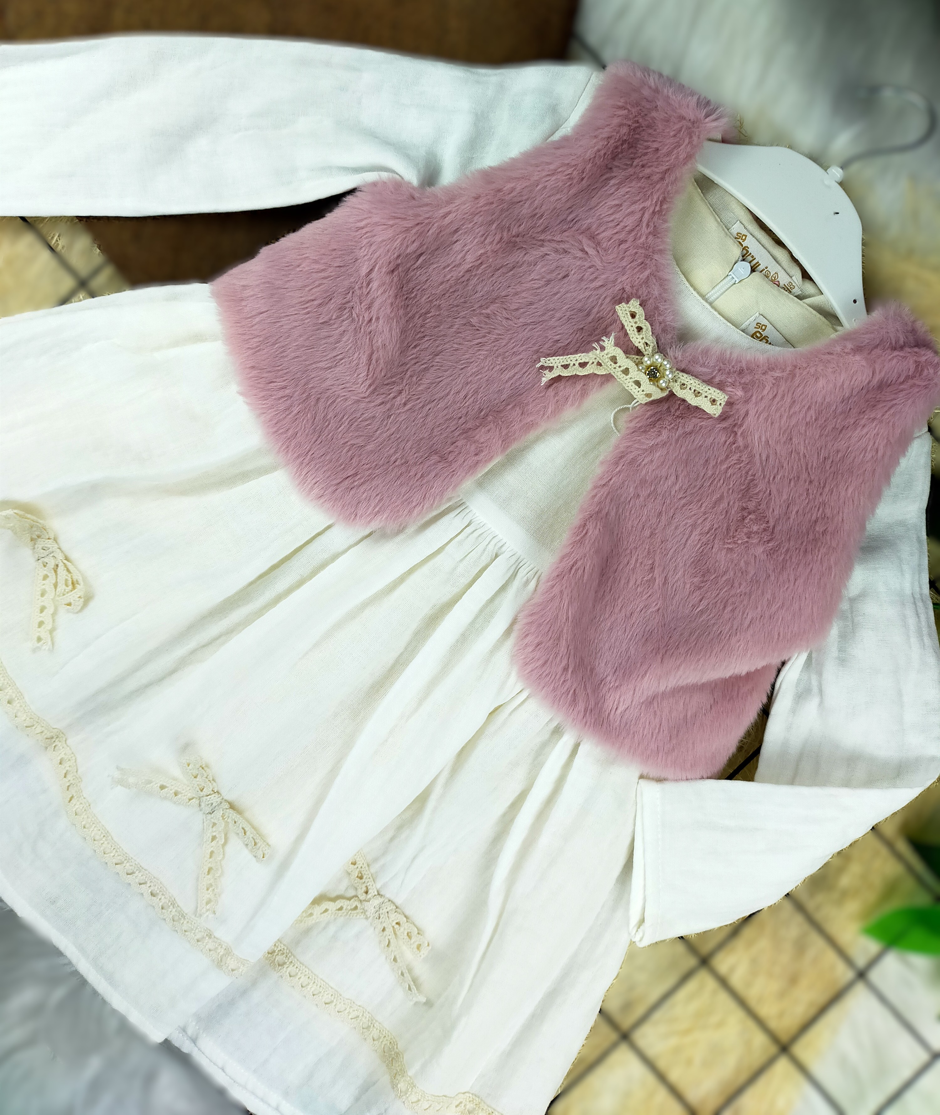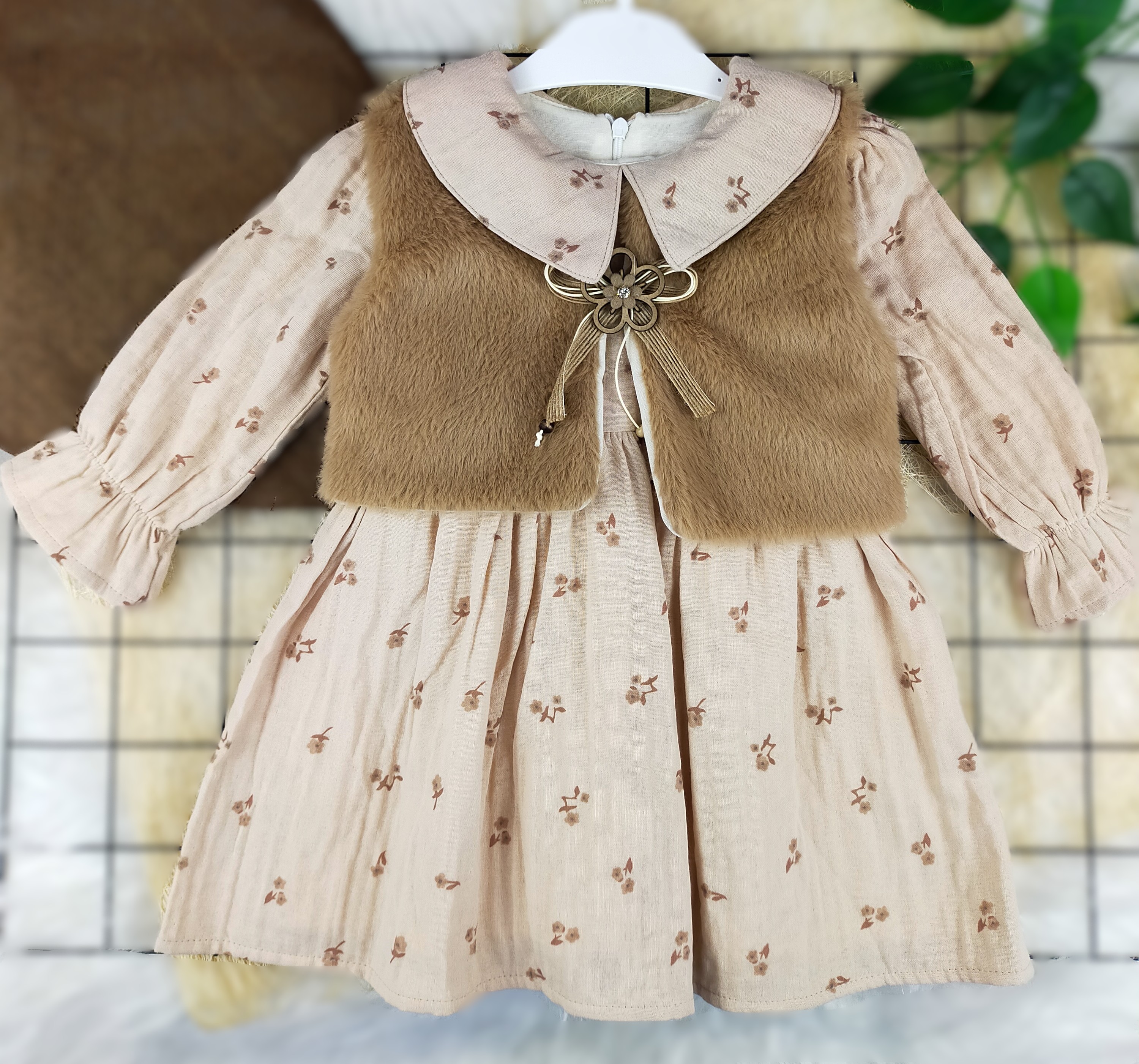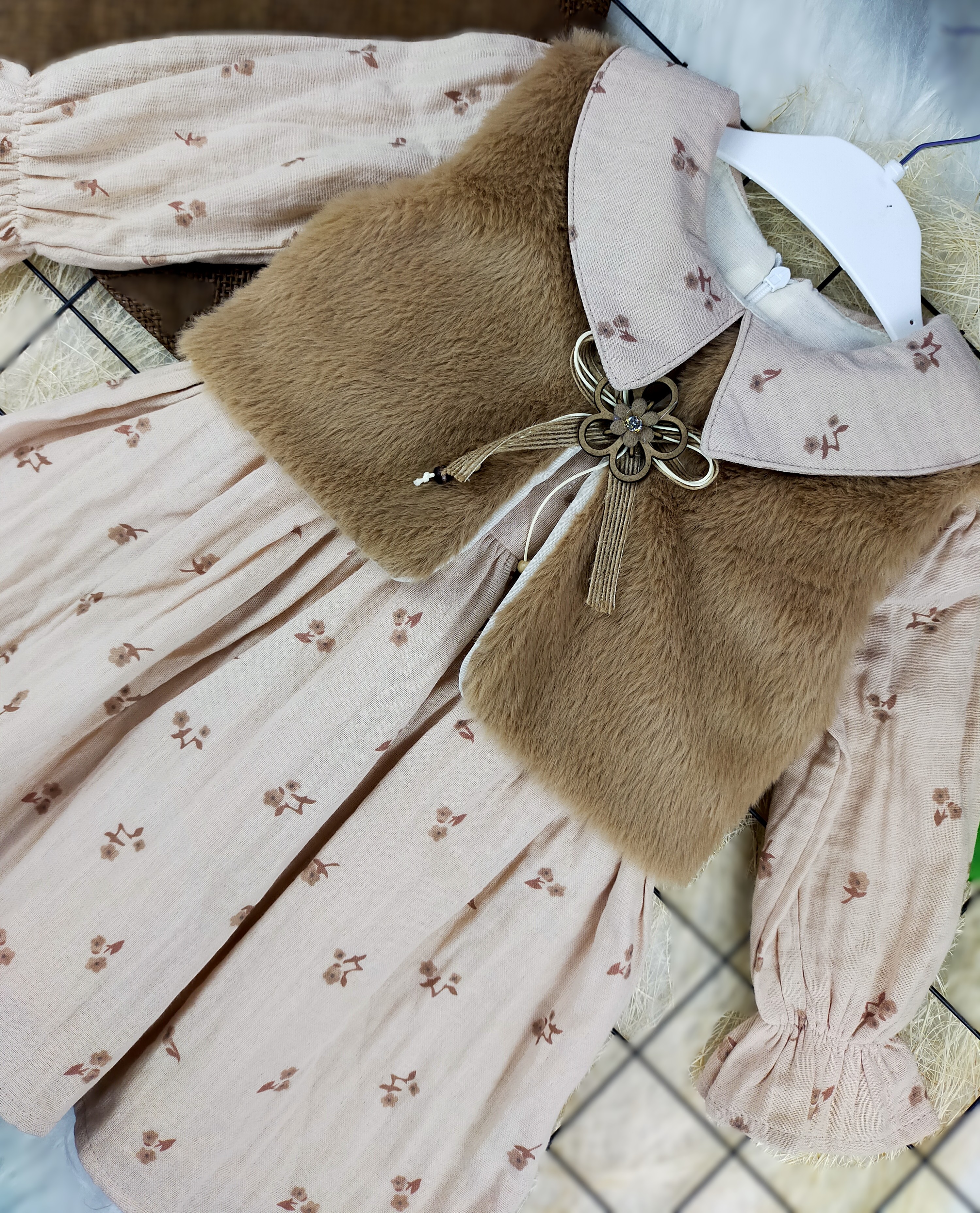 Çocuk modasında şıklığı ve rahatlığı bir araya getiren peluş yelekli müslin elbise, 2 ile 5 yaş arasındaki küçük hanımlar için özel olarak tasarlanmıştır. Bu elbise, hem günlük kullanım hem de özel günler için mükemmel bir seçenektir.