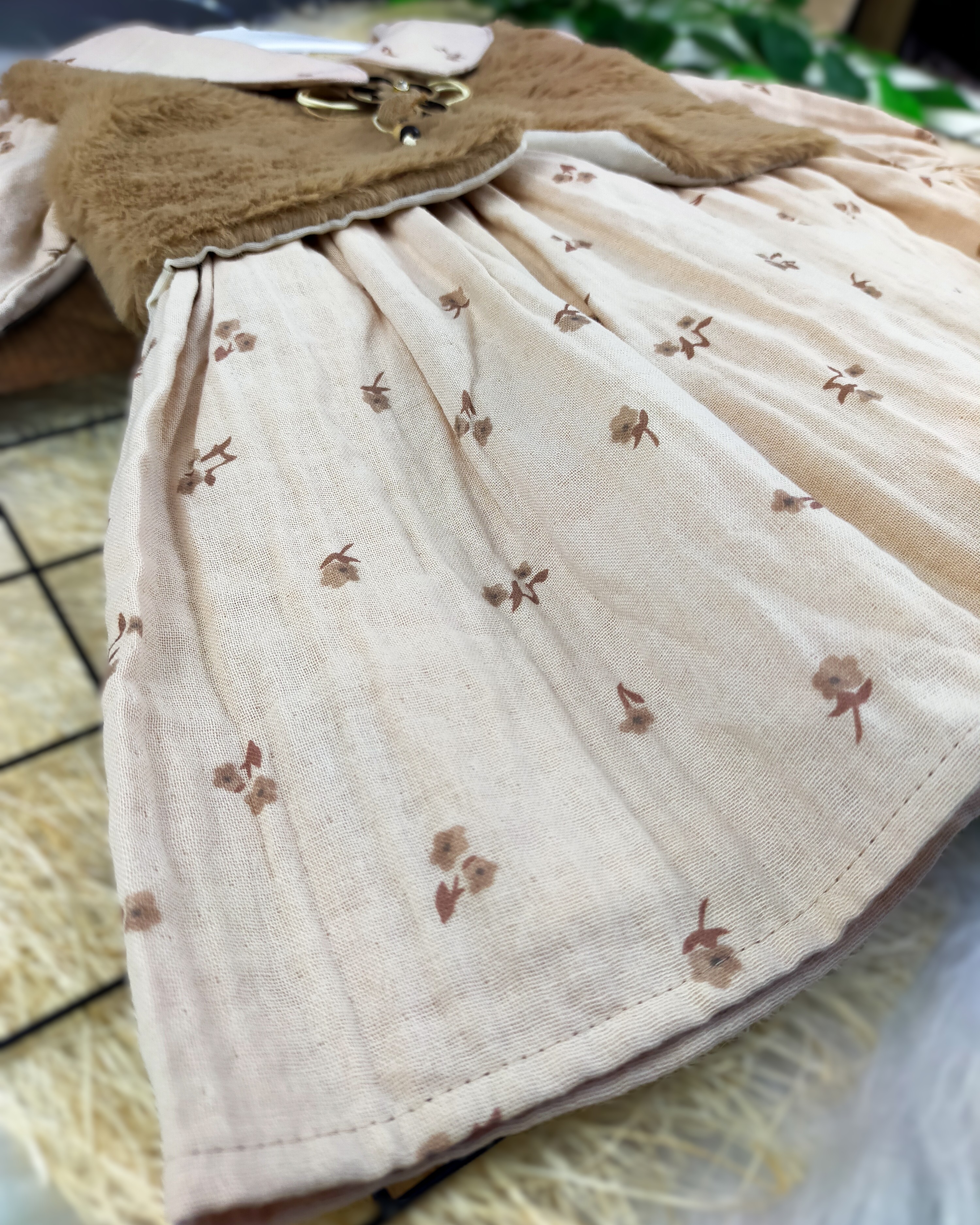 - Şık Peluş Yelek: Elbisenin üst kısmında bulunan peluş yelek, onu sıradan elbiselerden ayıran zarif bir dokunuş sunar. Yumuşak peluş malzeme, çocuğunuzu rahat tutarken ayrıca şık bir görünüm sağlar.