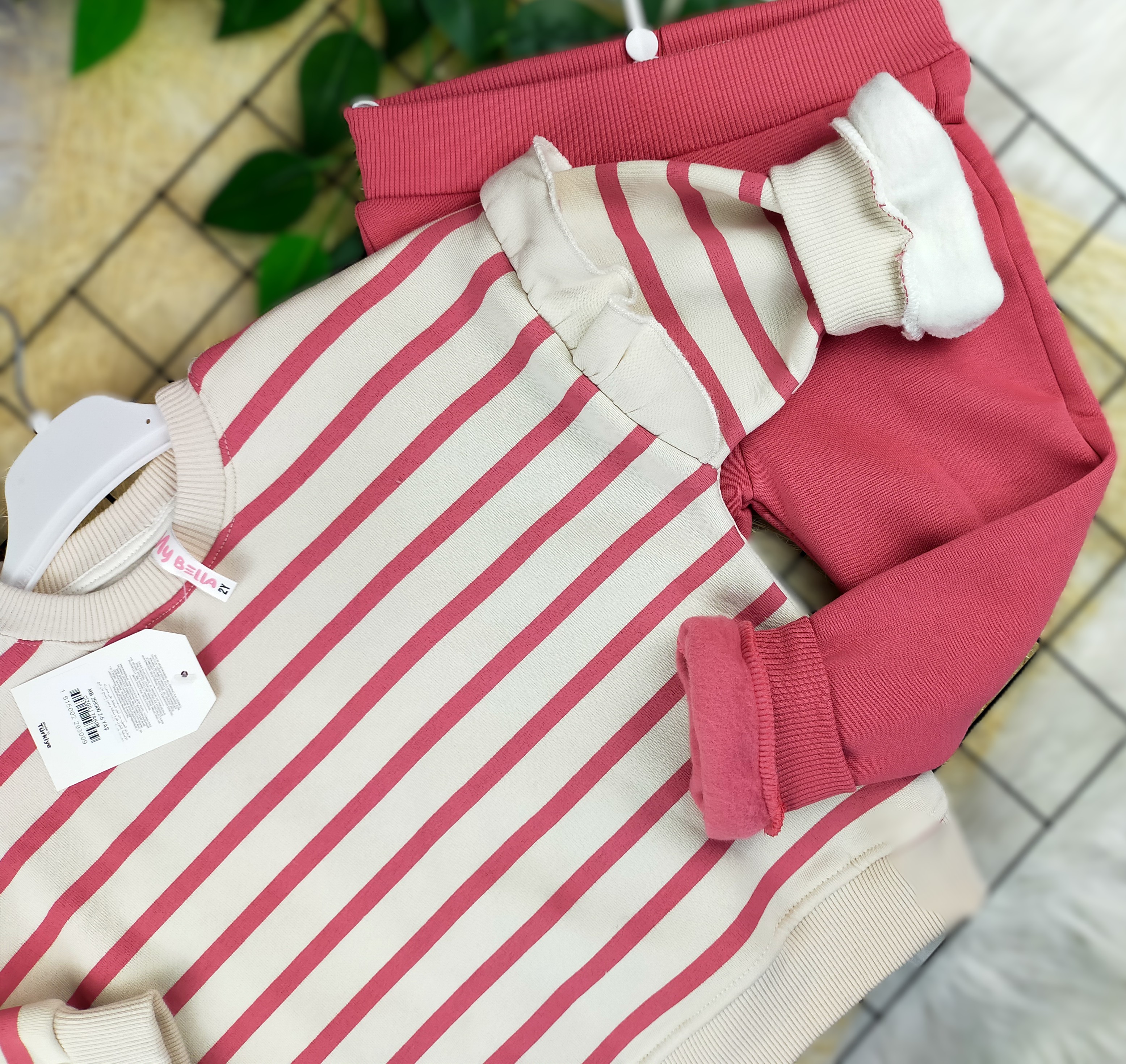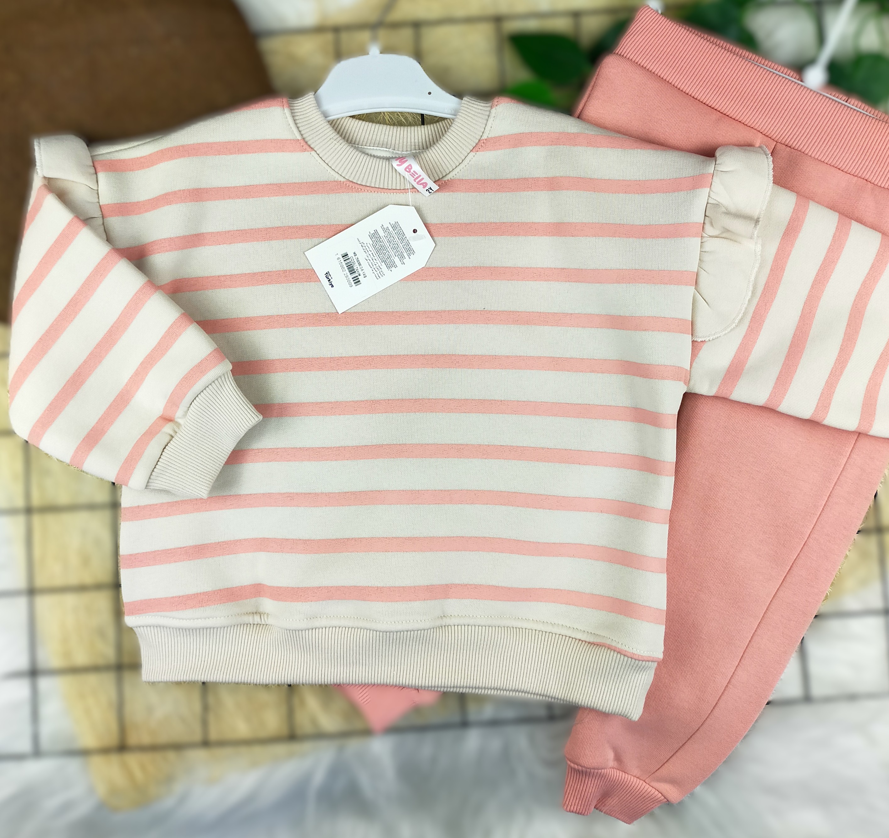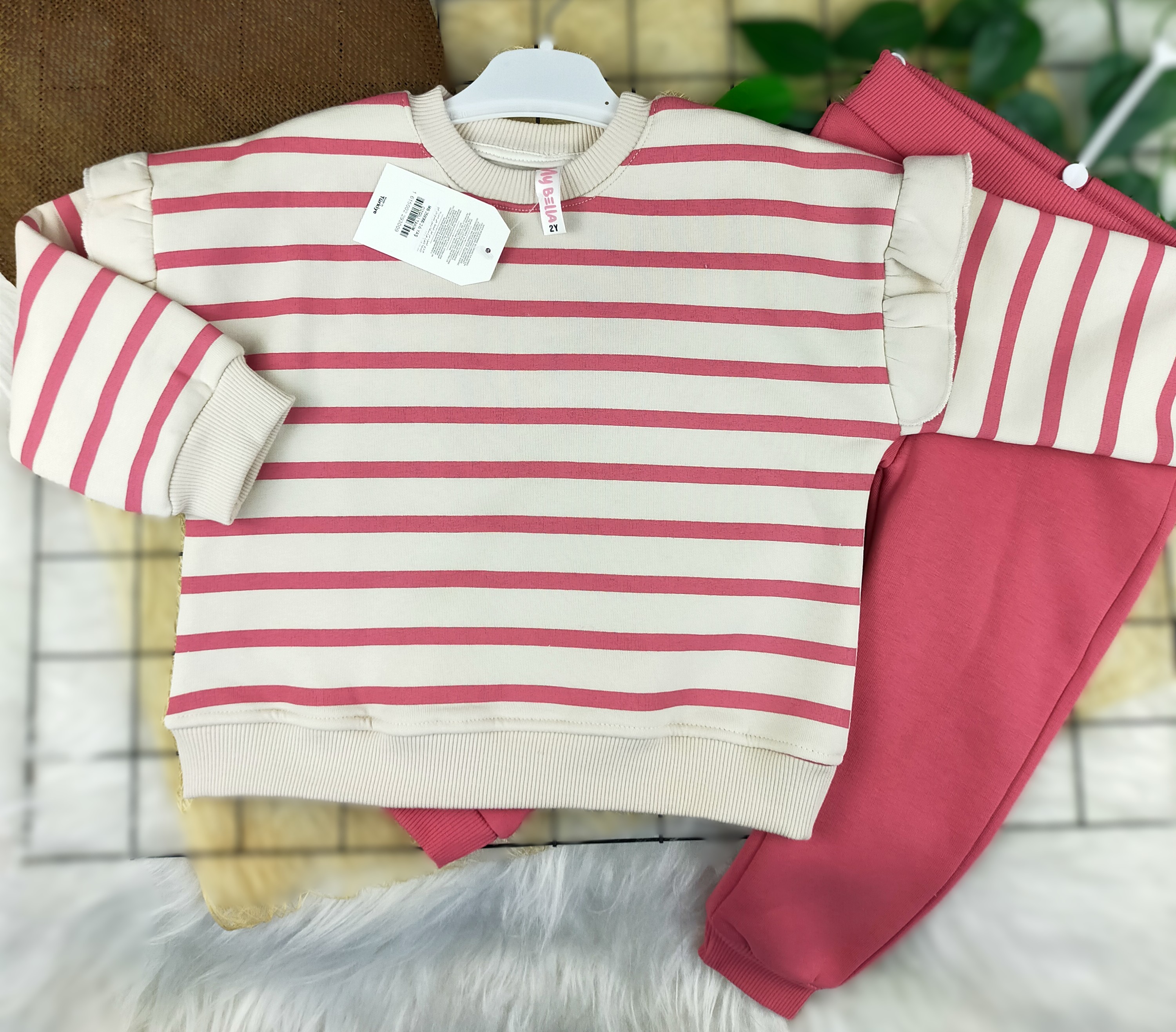 2 - 5 Yaş Arası Üç İplik Şardonlu Çizgi Desenli Oversize Kalıp Kışlık Kız Çocuk Takım