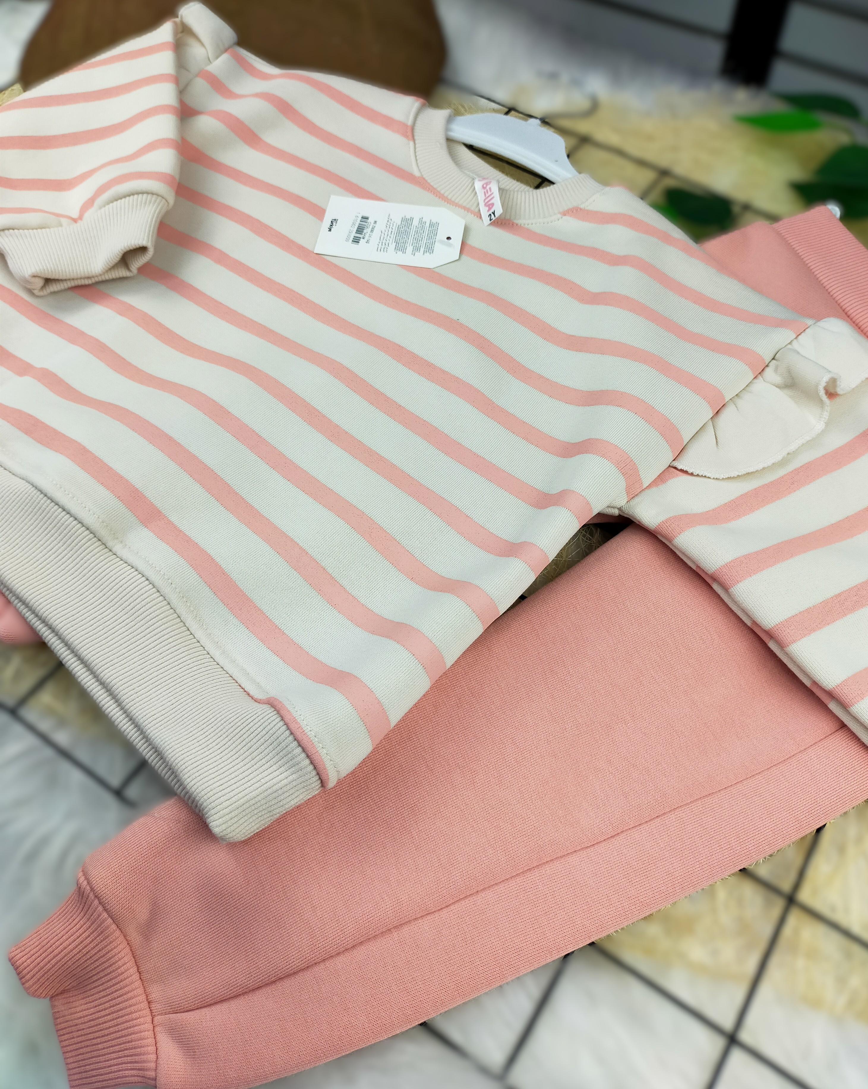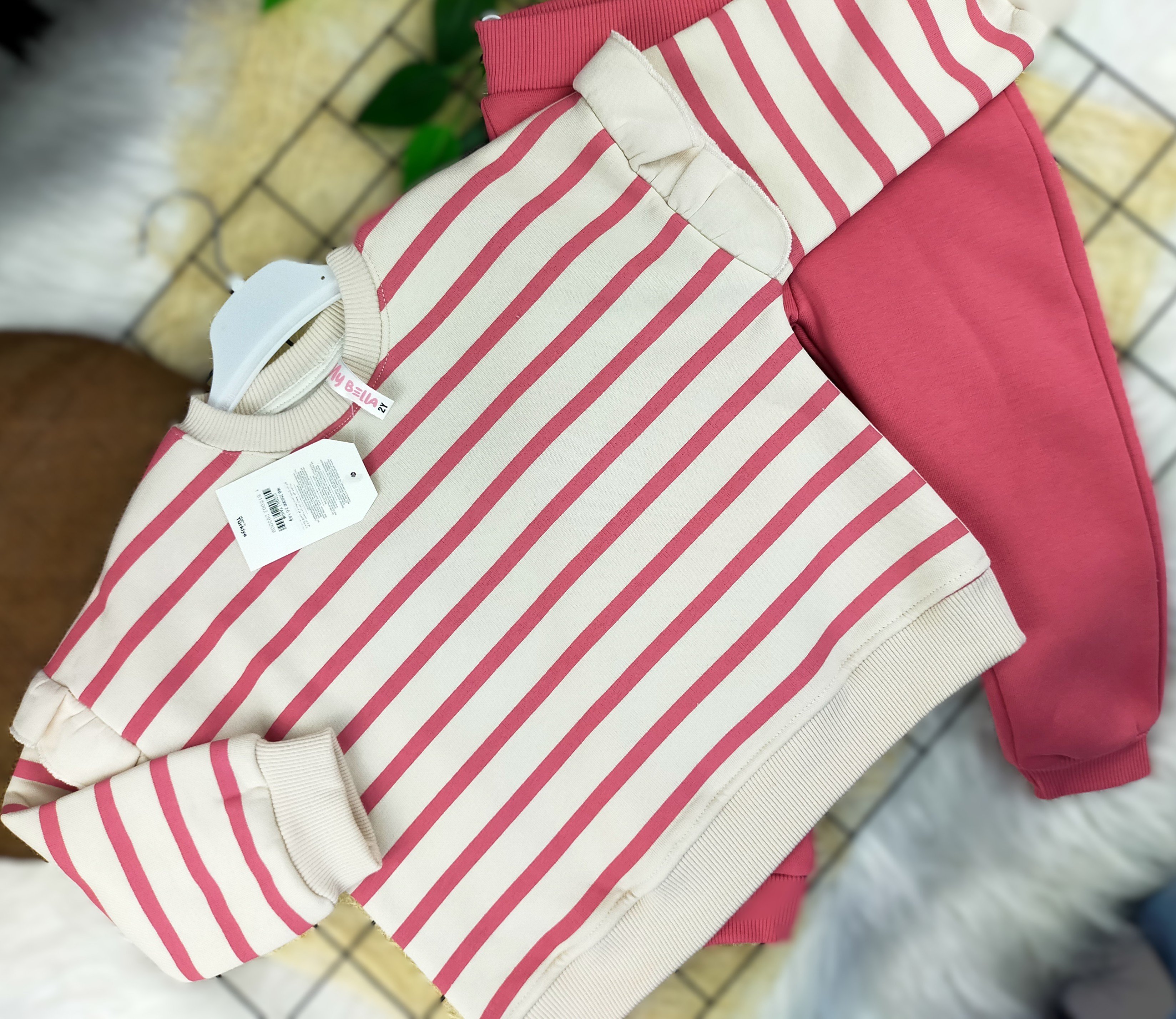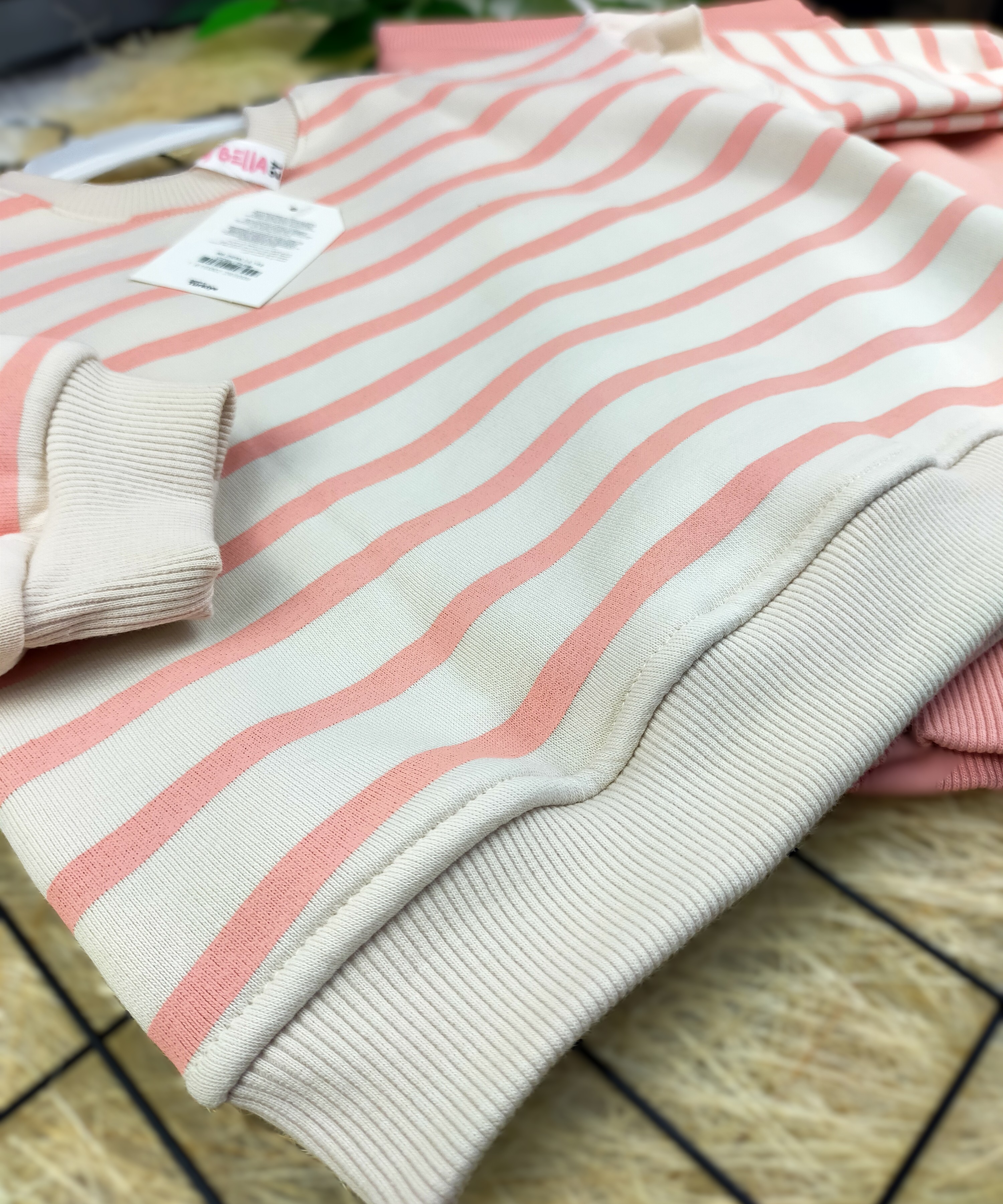 2 - 5 Yaş Arası Üç İplik Şardonlu Çizgi Desenli Oversize Kalıp Kışlık Kız Çocuk Takım