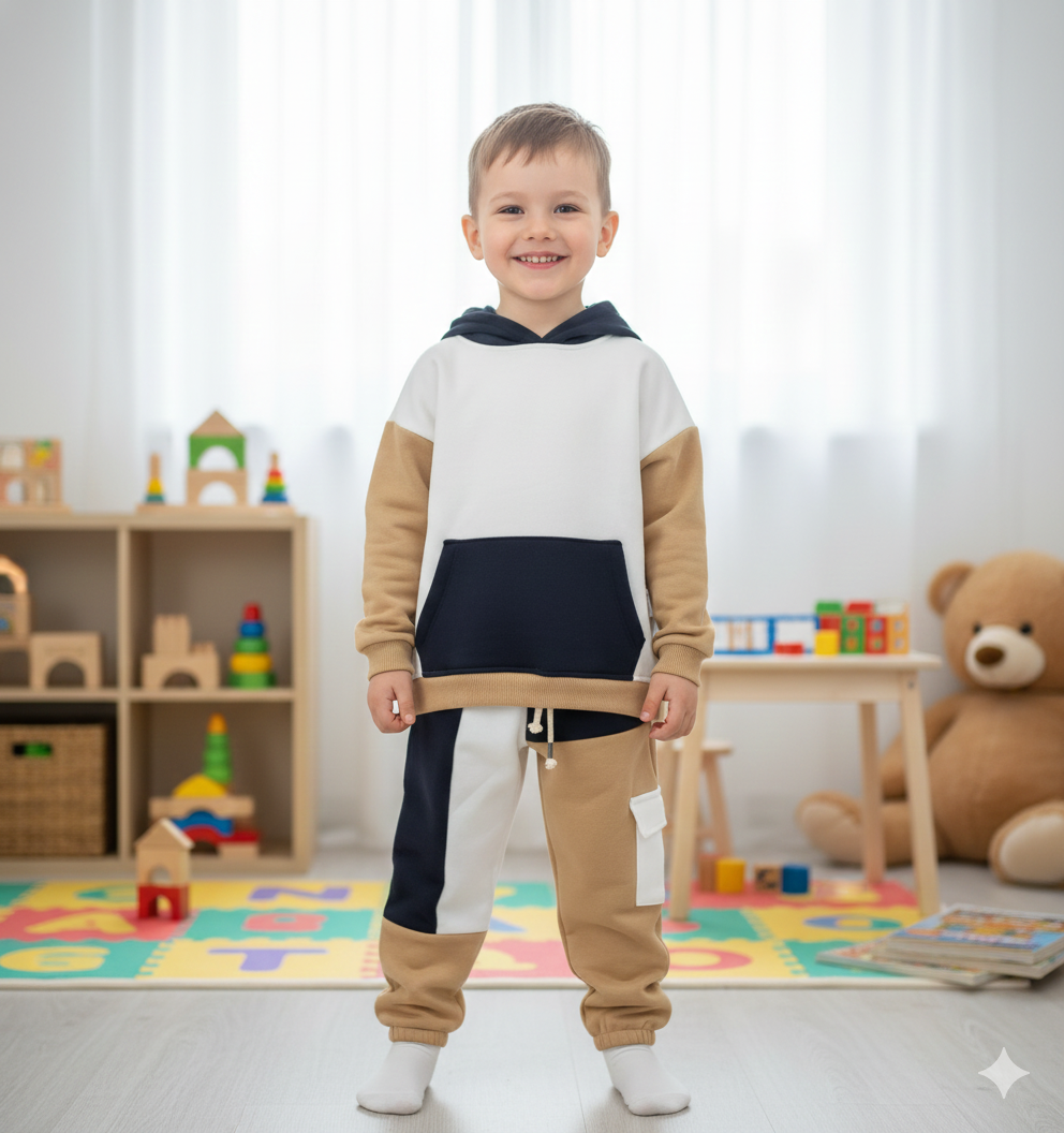 Çocuklarınızın keyifli ve rahat bir şekilde vakit geçirmesini sağlamak için tasarlanmış olan 2 - 5 yaş arası Yıldız Kapşonlu Üçiplik Şardonlu Erkek Çocuk Takımı, hem kullanışlılığı hem de şıklığıyla dikkat çekiyor.