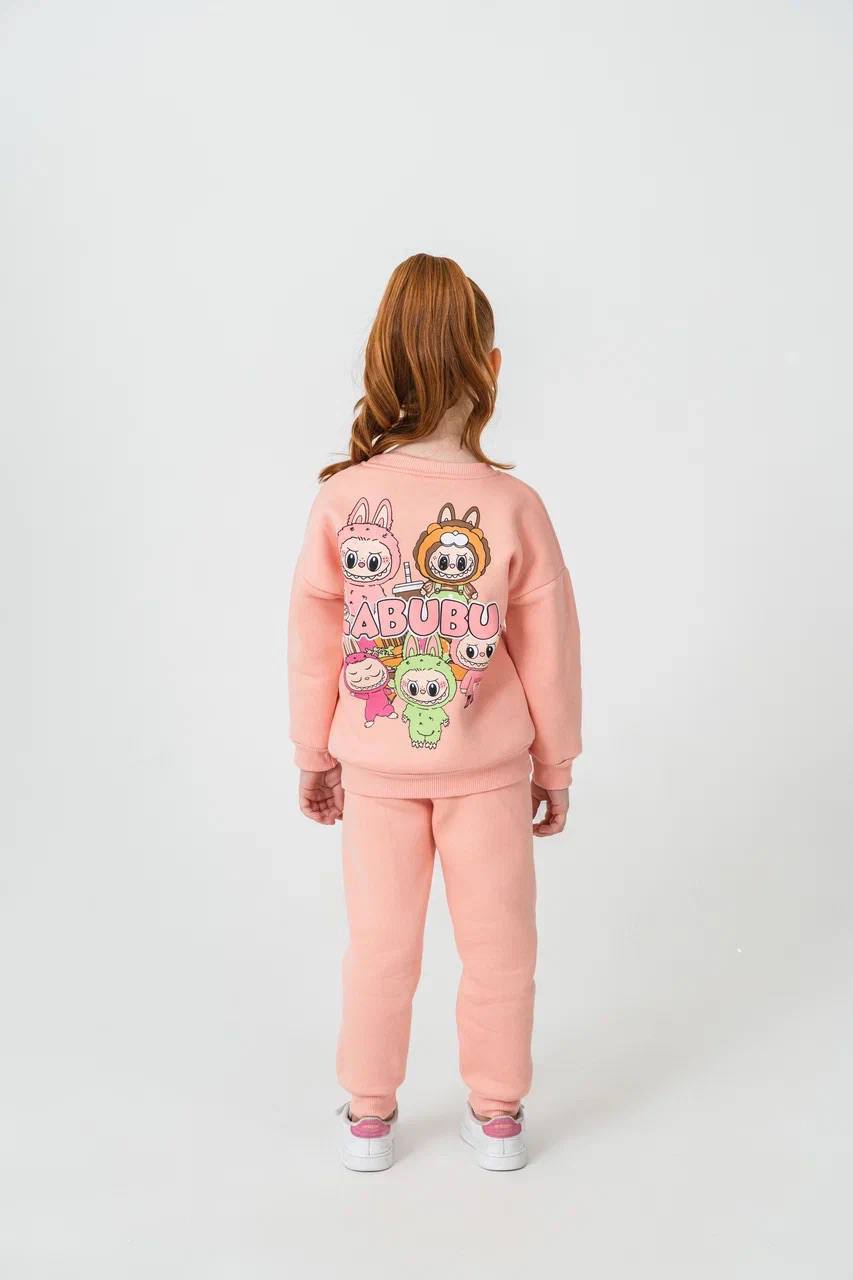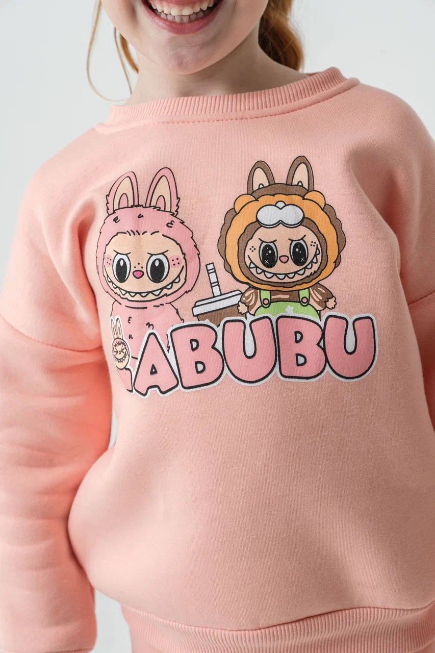 3 - 10 Yaş Arası Labubu Desenli Üçiplik Şardonlu Oversize Kesim Kız Çocuk Takımları