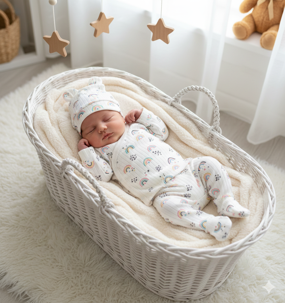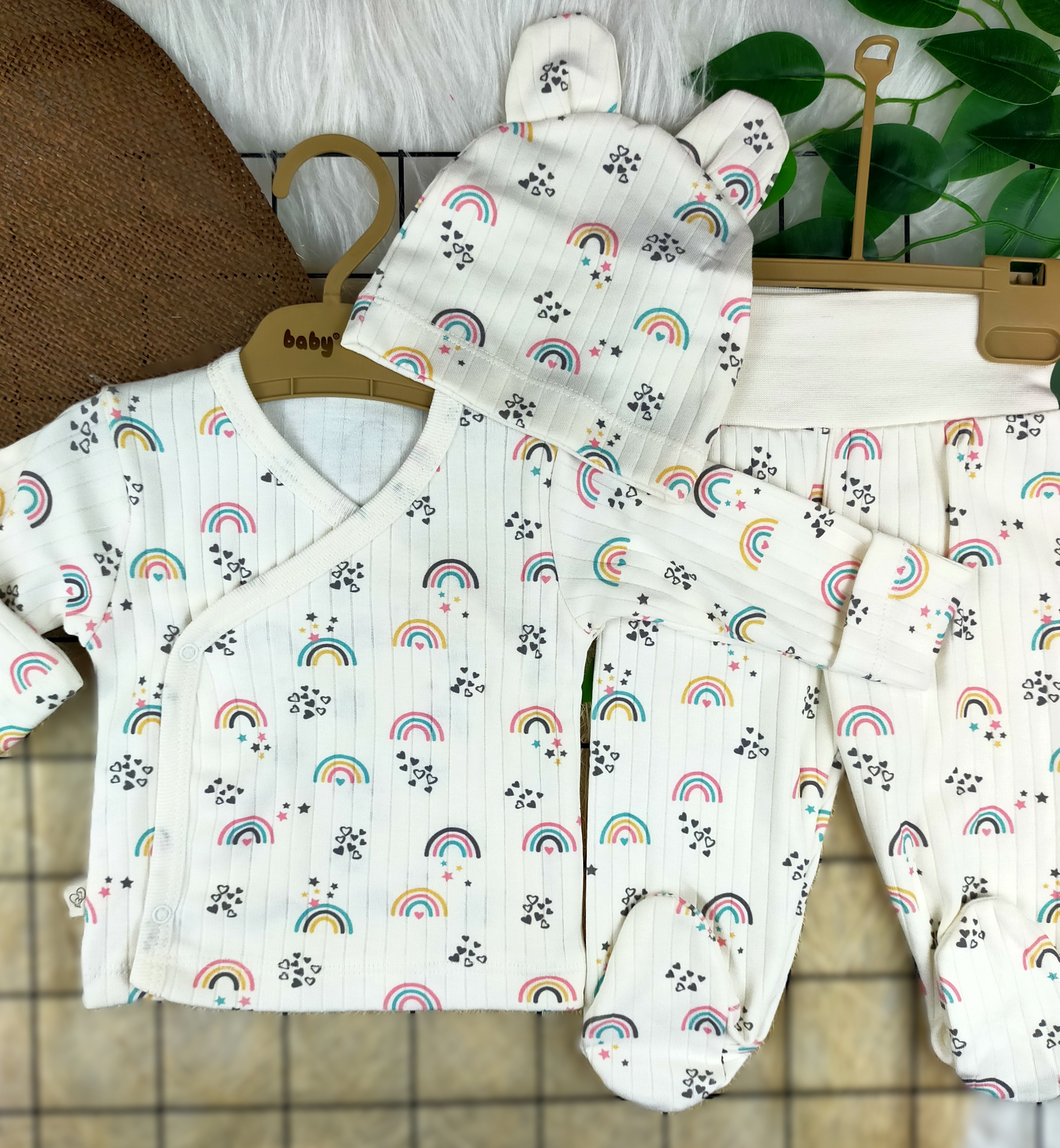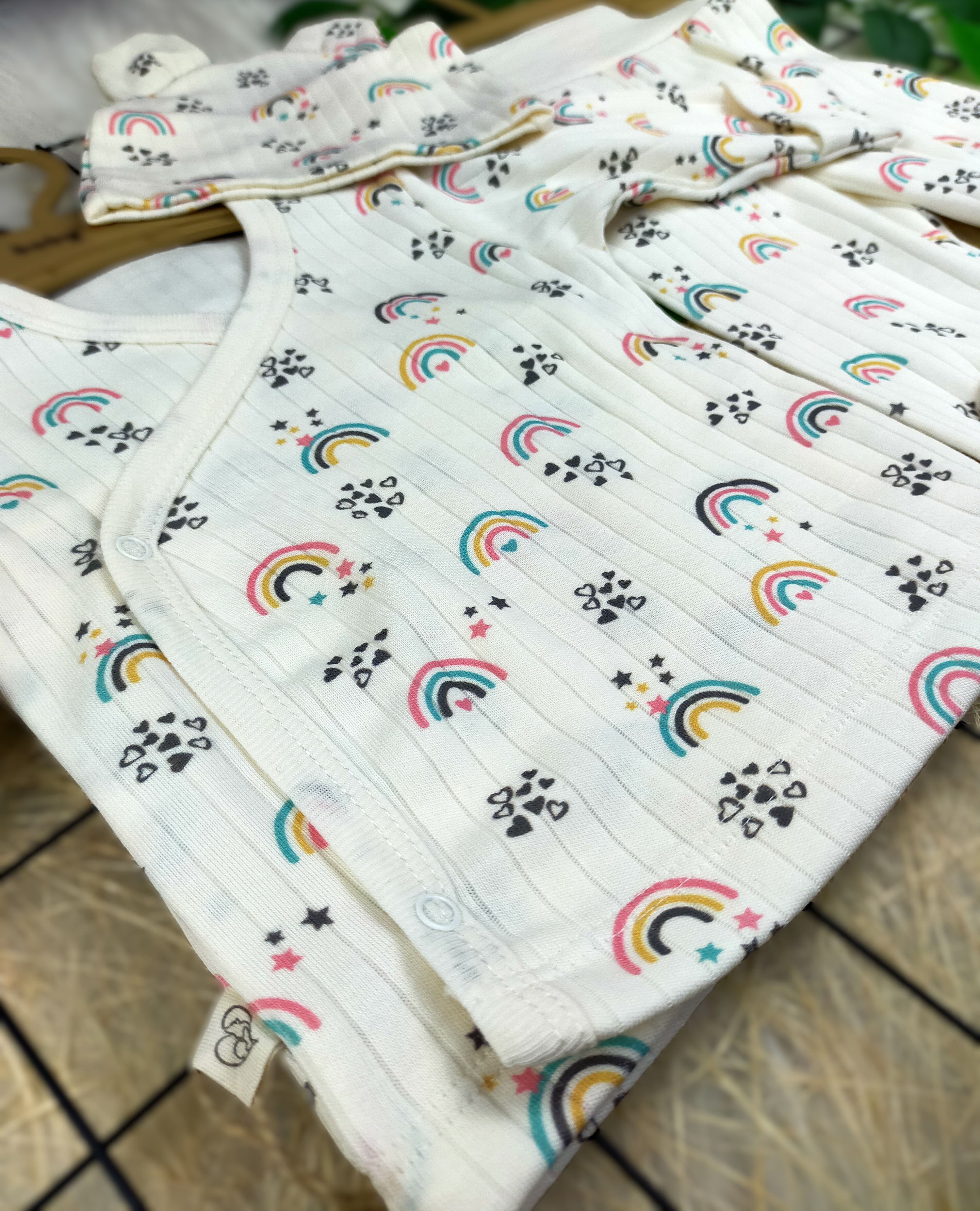 Bebeğinizin konforunu ve şıklığını ön planda tutan 3 Parça Gökkuşağı Desenli Zıbın Takımı, özel tasarımı ve kaliteli malzemesi ile dikkat çekiyor. Bebeğinizin doğduğu andan itibaren rahat hissetmesi için tasarlanan bu zıbın takımı, hem günlük kullanım hem de özel günlerde tercih edilebilecek şıklıkta. Bu set, alt, üst ve şapka olmak üzere üç parçadan oluşmaktadır.