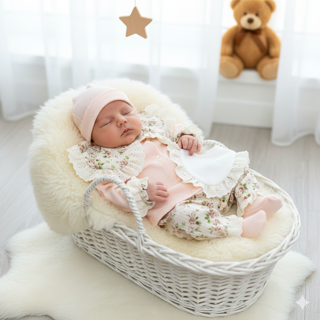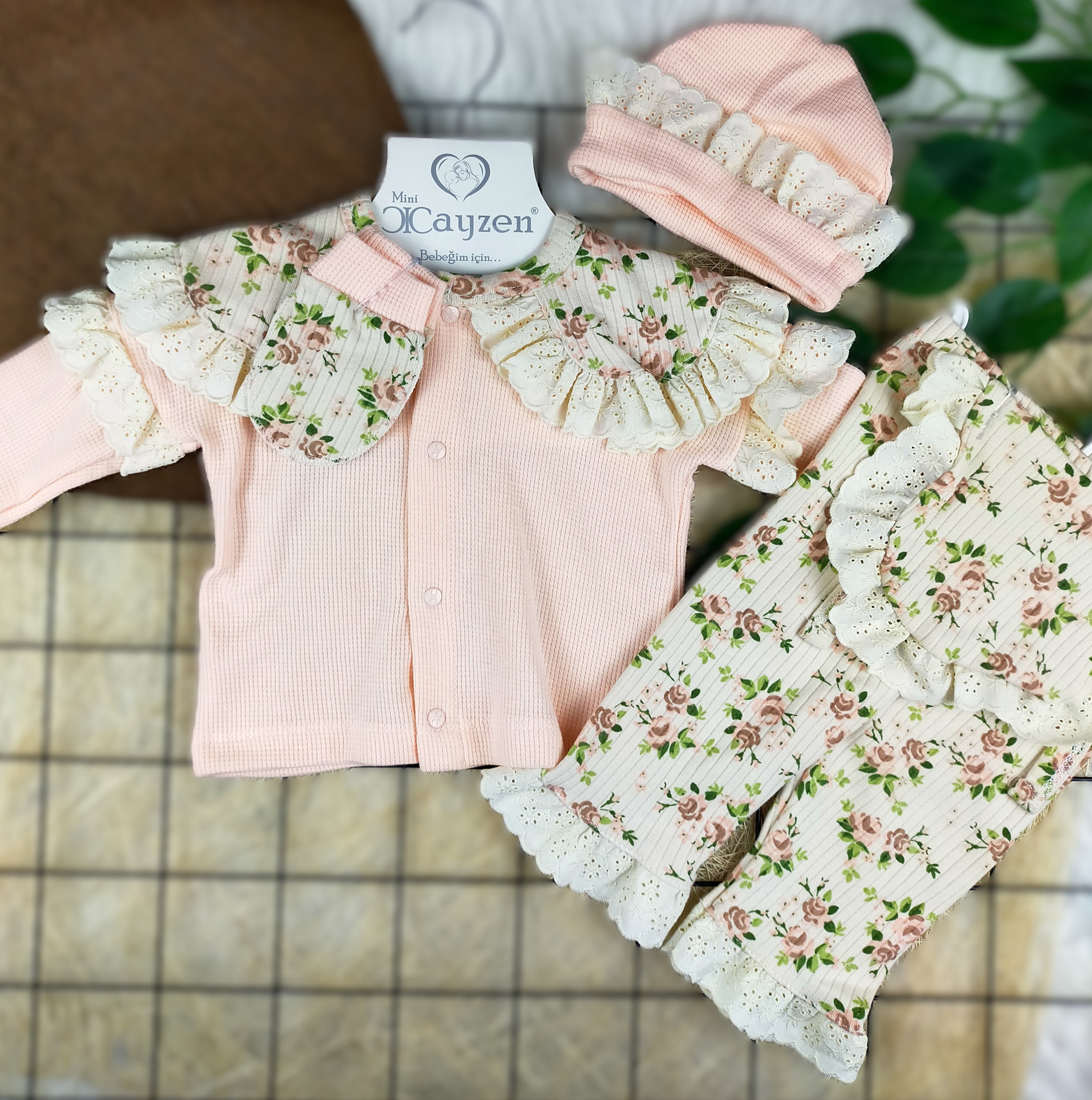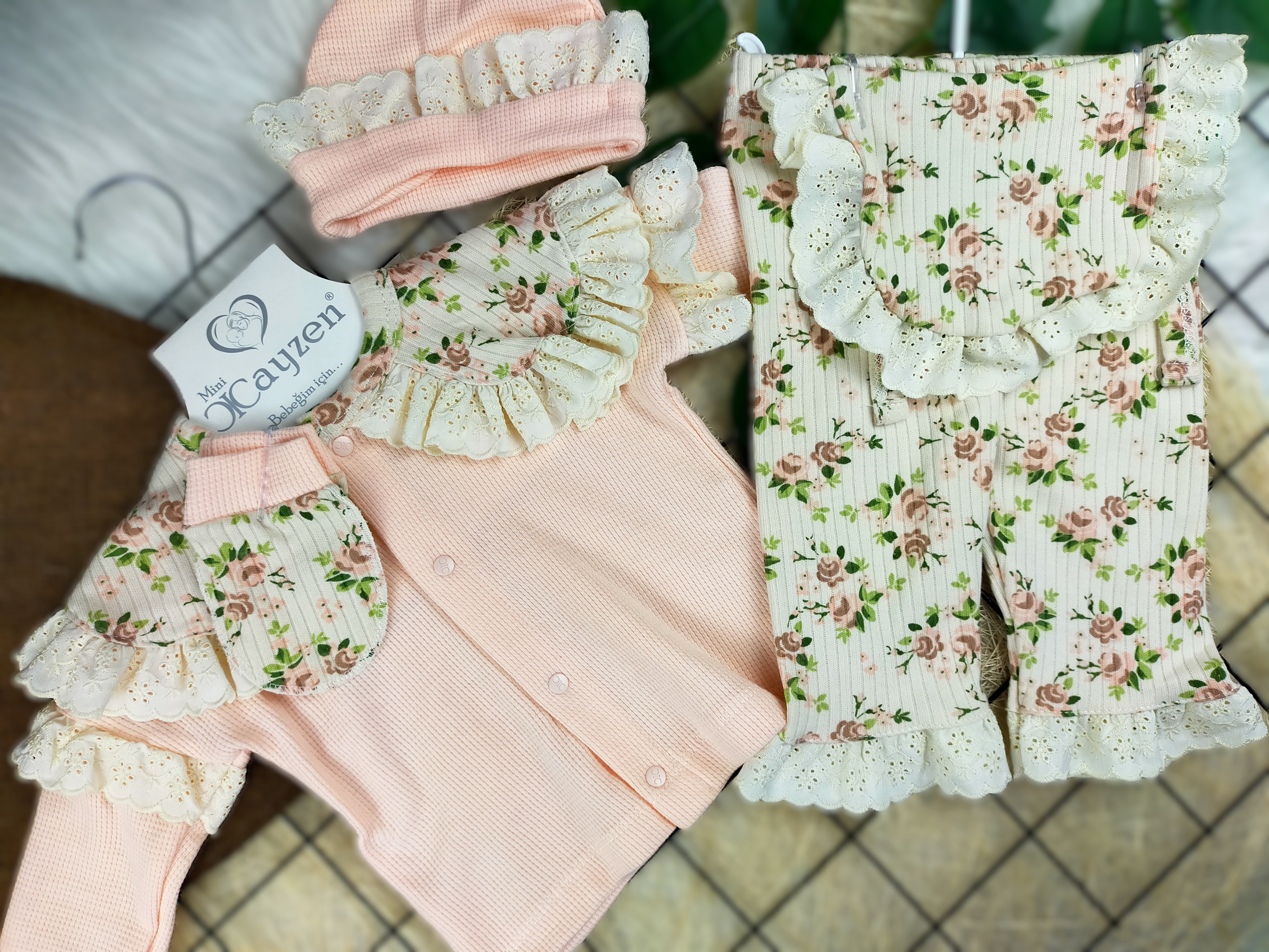 - Şapka: Doğal dokusu ile bebeğinizin başını sıcak tutarken şıklığını tamamlar. Çiçek detayları ile uyumlu bir görünüm sağlar.
