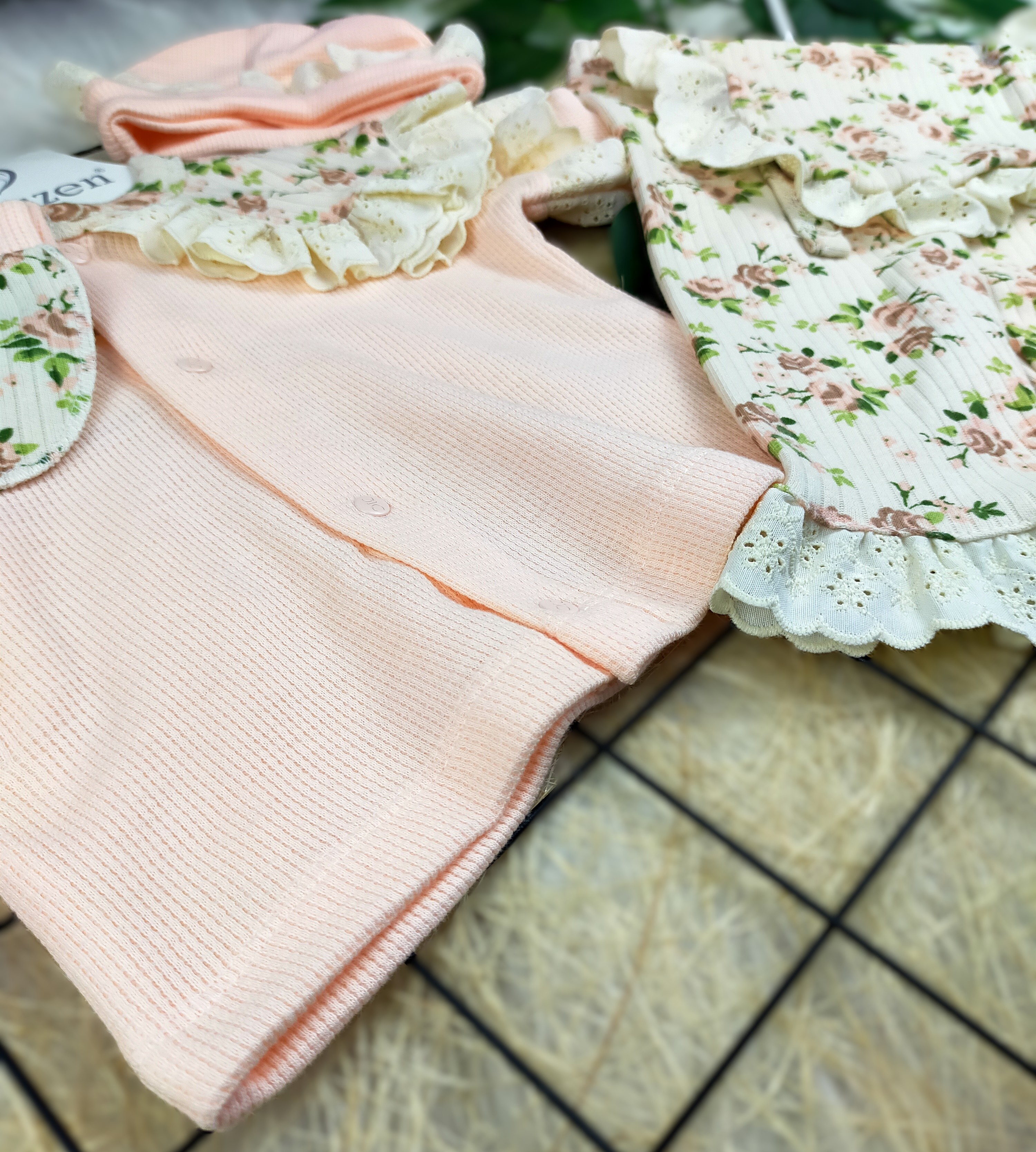 Bu 5 parça zıbın takımı, pratikliği ve şıklığı bir arada sunarak her anınıza eşlik edecek. Bebeğinizin rahat hareket etmesini sağlarken, şık detayları ile de dikkatleri üzerine çeker. Özellikle özel günlerde ya da her türlü günlük kullanımda tercih edebilirsiniz. Çiçek desenleri, doğayla iç içe bir yaşam tarzını yansıtırken, yaz mevsimine de ayrı bir hava katmaktadır.