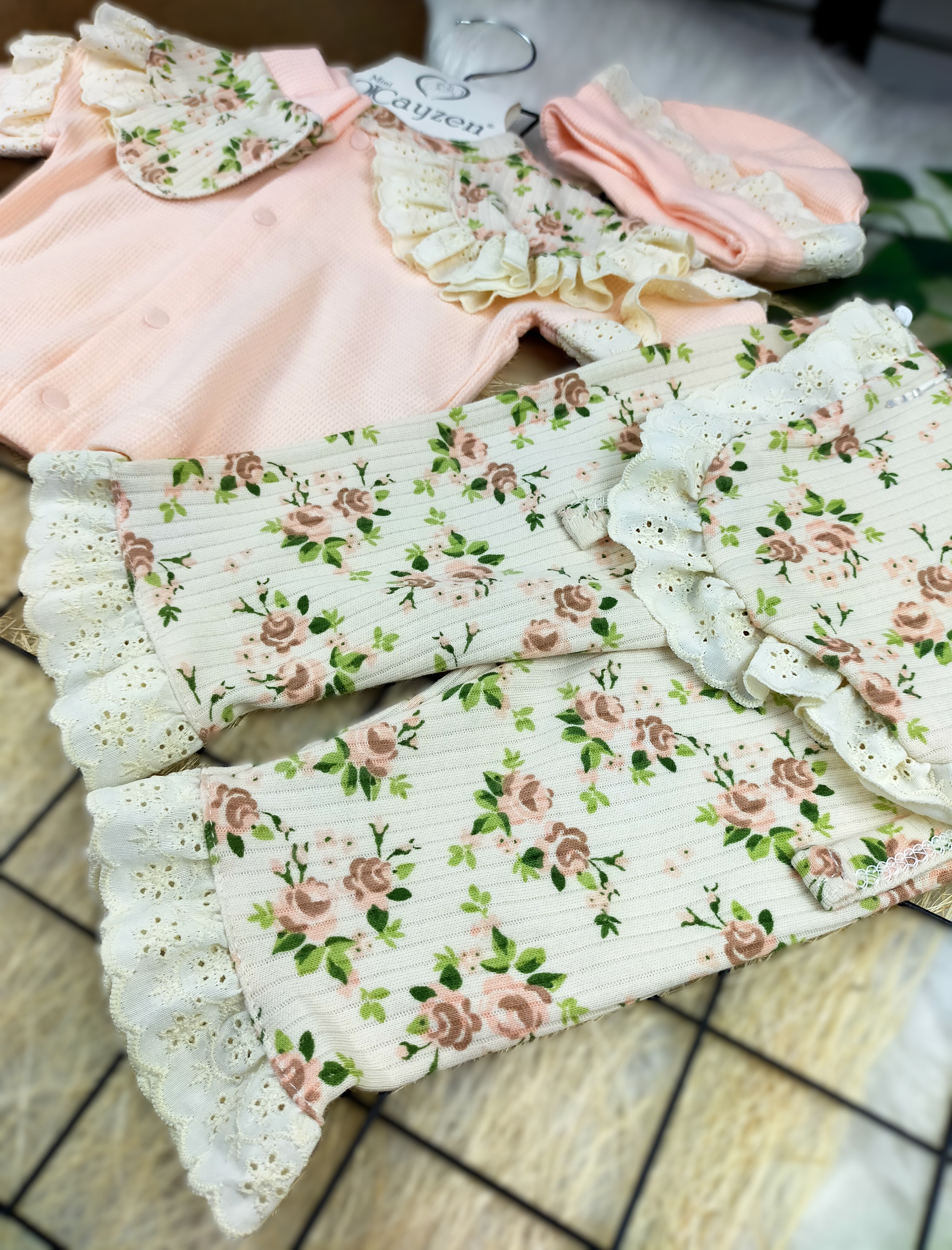 5 Parça Dokuma Kumaş Çiçek Desenli Bol Paça Zıbın Takımı, hem annelerin hem de bebeklerin vazgeçilmezi olacaktır. Hemen sepetinize ekleyin, minik prensesinizin şıklığına şıklık katın!