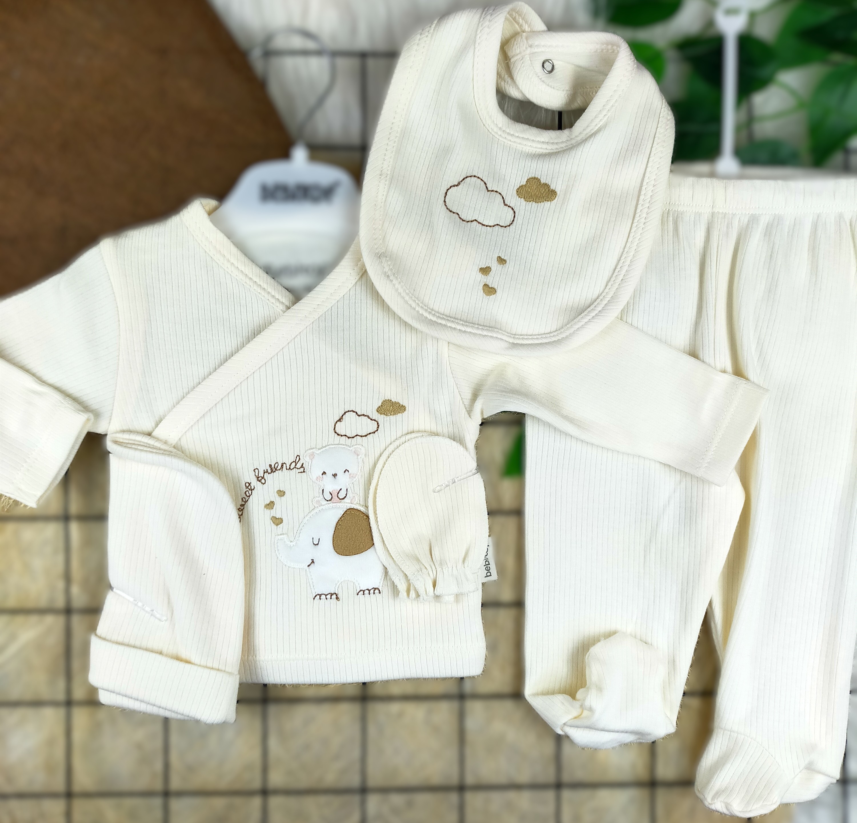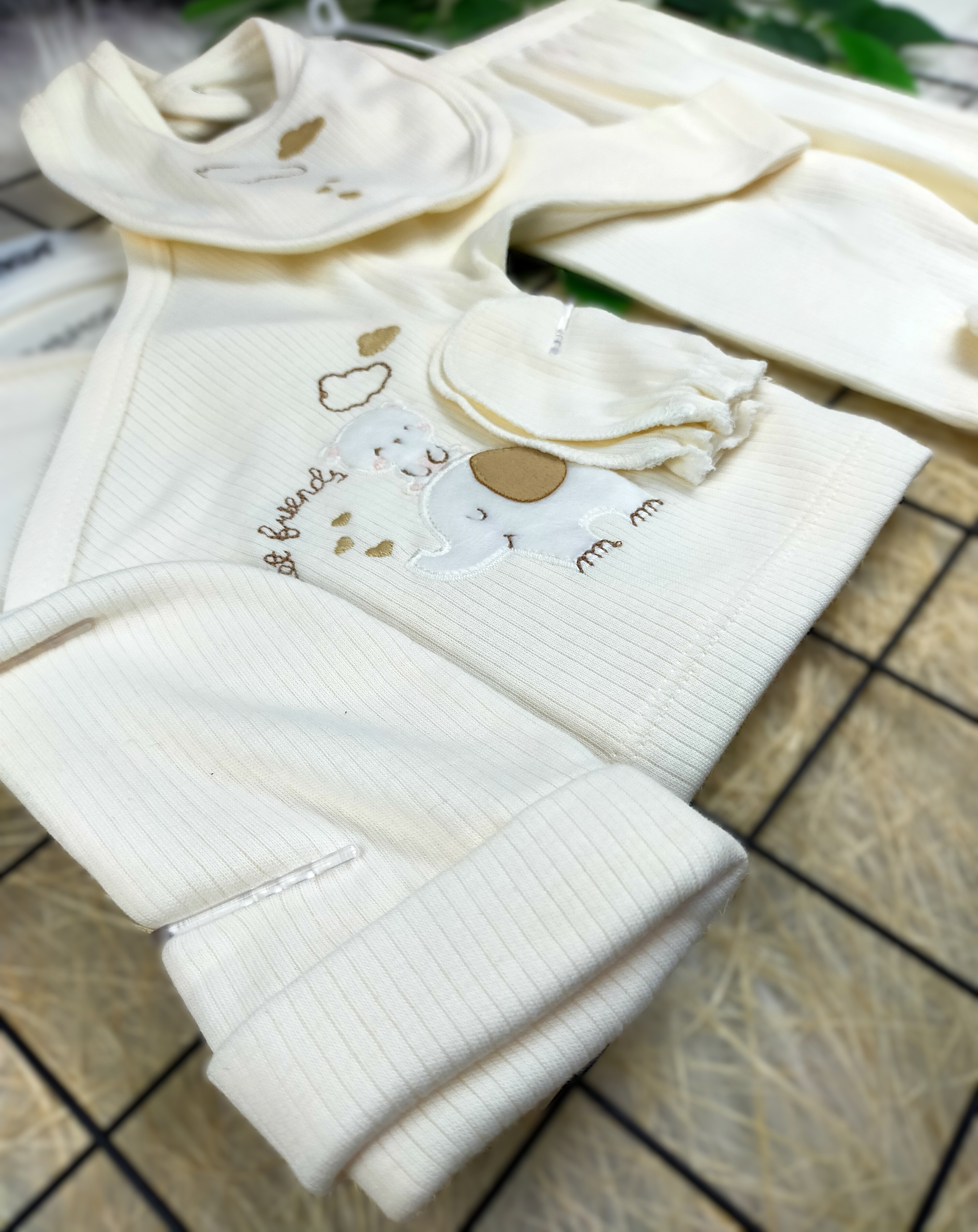 Bebekler için tasarlanmış olan 5 Parça Fil ve Ayıcık Desenli Zıbın Takımı, miniklerin konforunu ve şıklığını bir araya getiriyor. Bu özel zıbın seti, sevimli fil ve ayıcık baskıları ile bezeli, yumuşak kumaşlardan üretilmiştir. Bebeğinizin hem rahat hem de şık görünmesini sağlayacak ideal bir seçimdir.