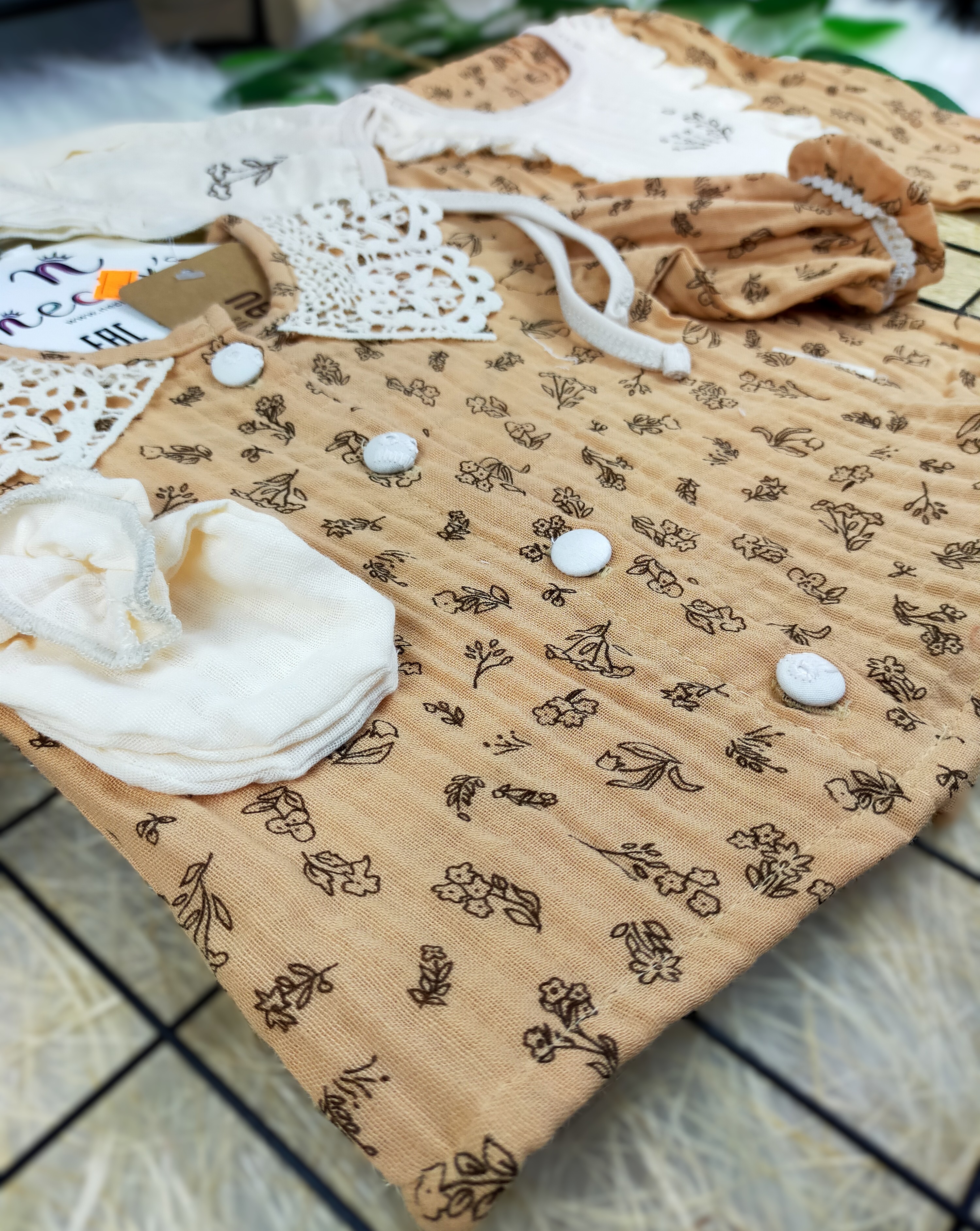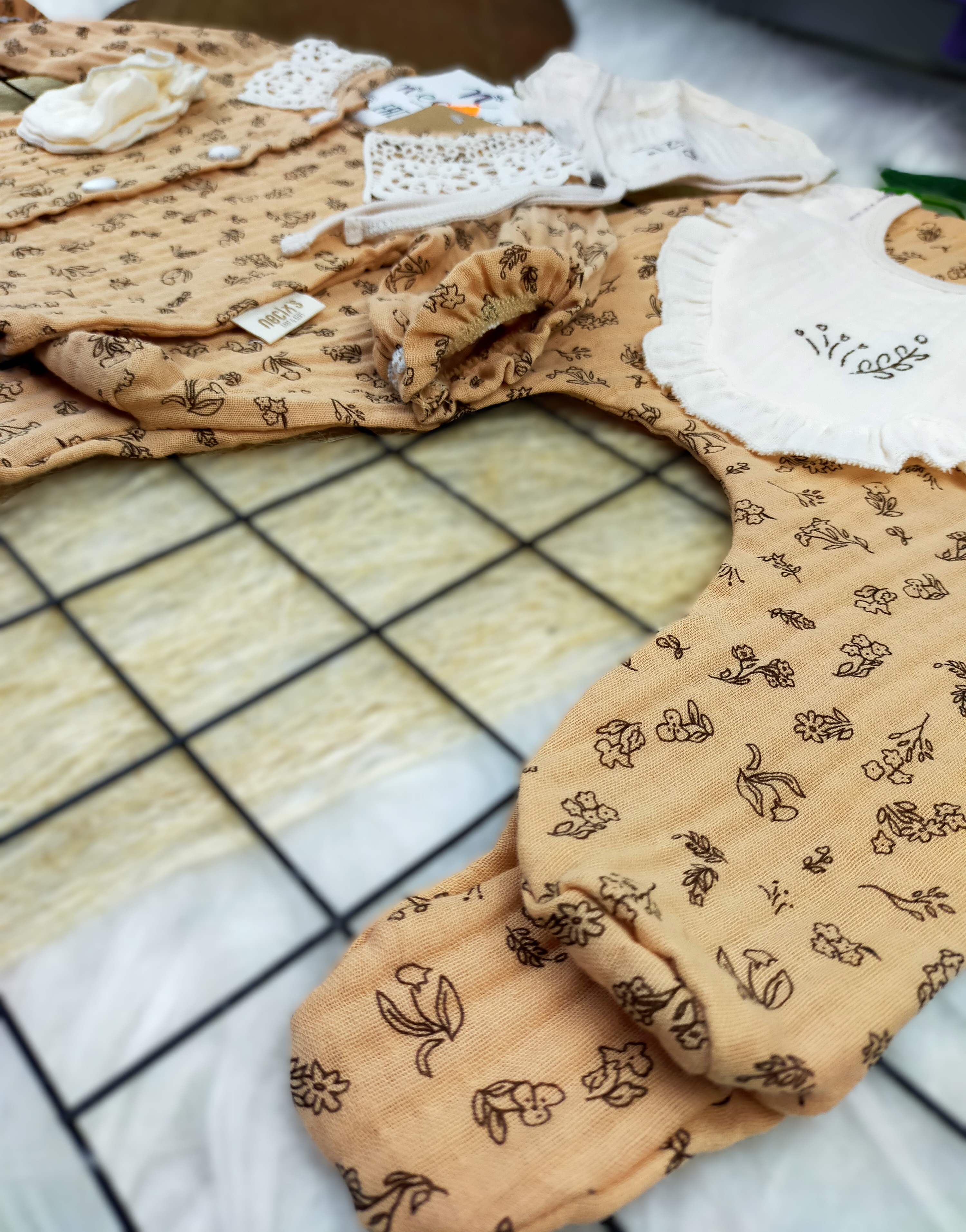 5 parça müslin kumaş yaka detaylı zıbın takımı, hem estetik hem de fonksiyonel bir üründür. Ürün, bebeğinizin her anını özel kılacak detaylarla doludur. Kalite, konfor ve şıklığı bir arada sunan bu zıbın takımı, bebeklerinize en iyi başlangıcı sağlamak için mükemmel bir tercihtir. Şimdi sipariş verin ve bebeğinizin gardırobuna zarif bir dokunuş ekleyin!
