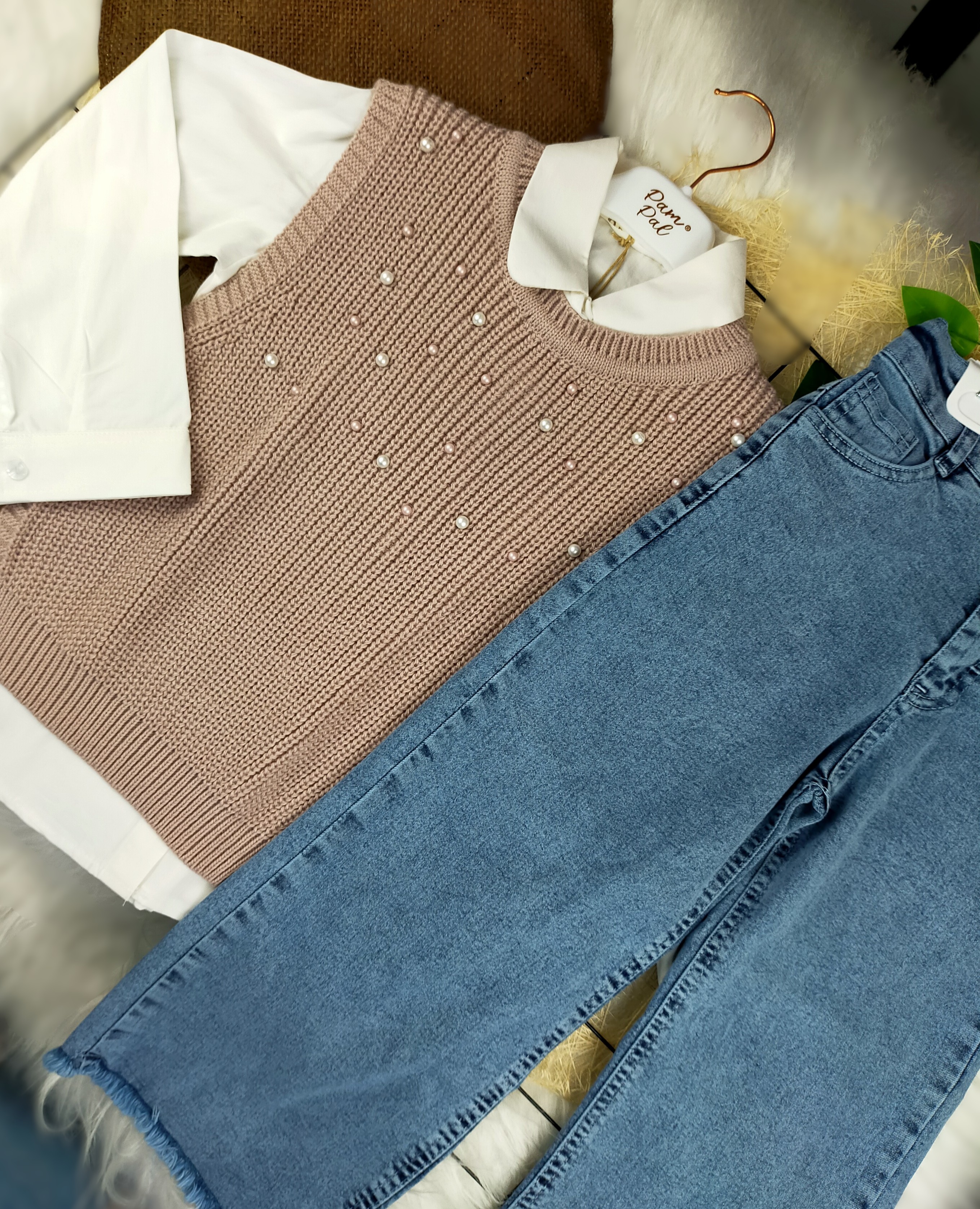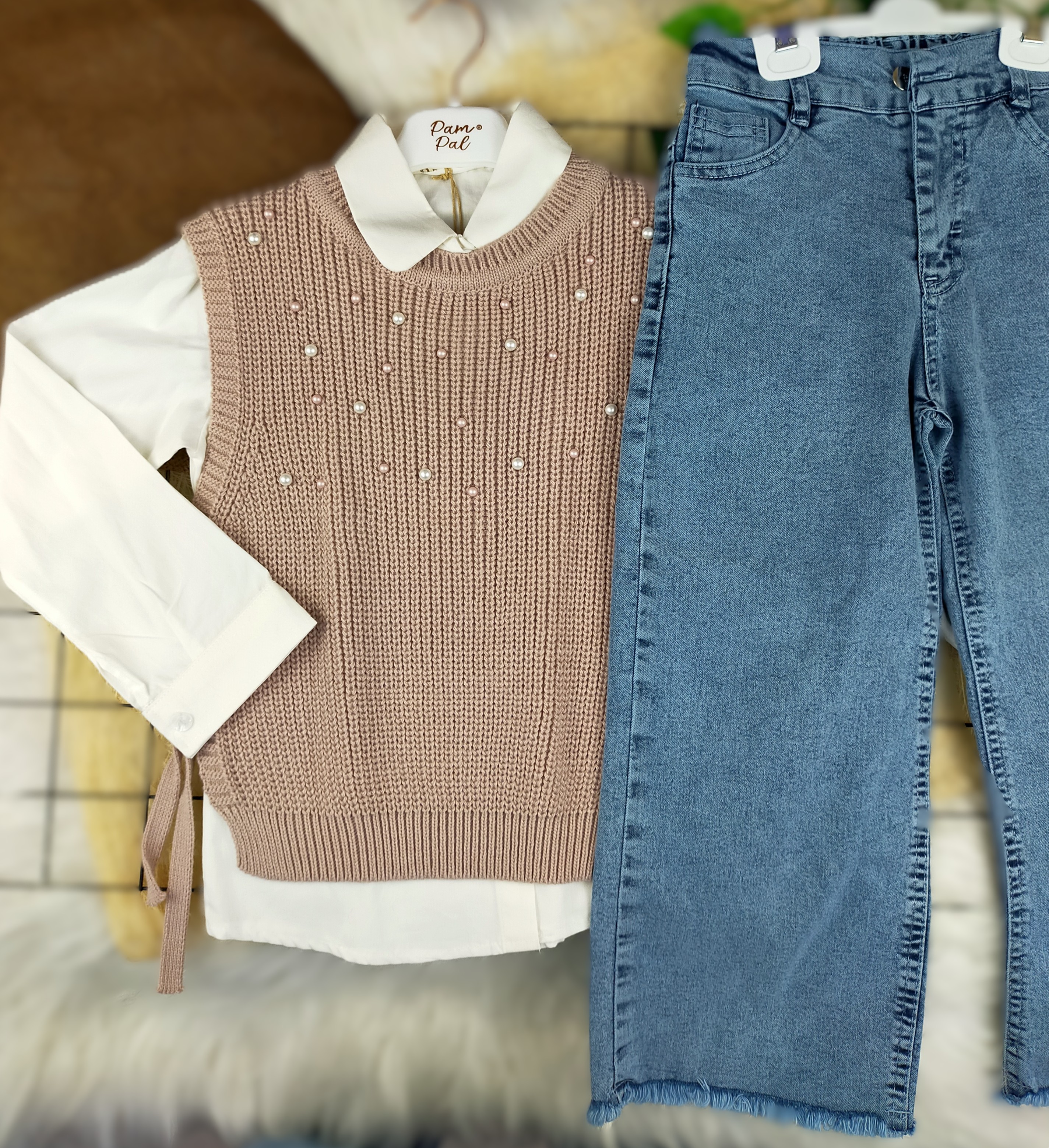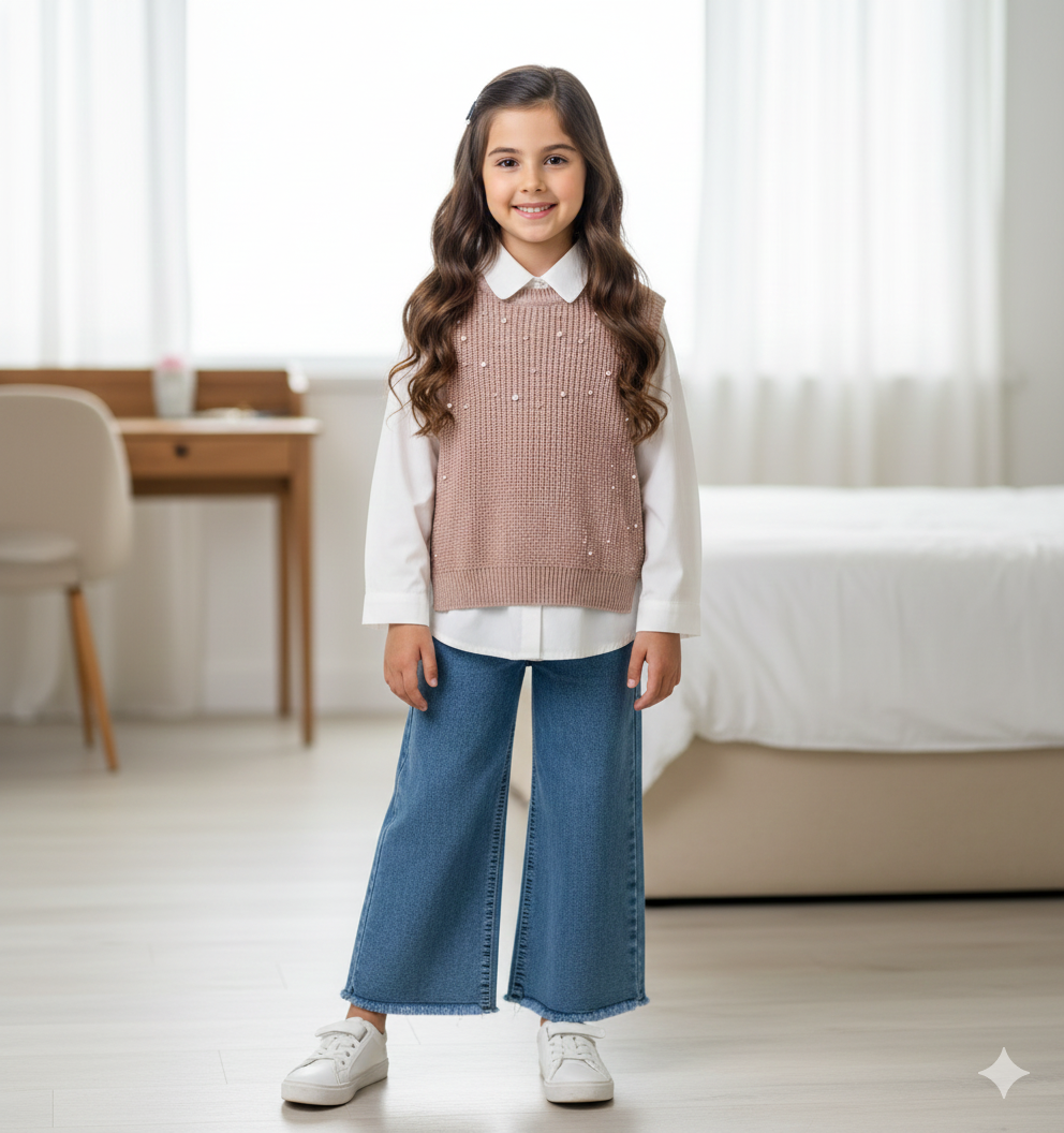 Çocuklarınızın zarif ve şık görünümünü tamamlayacak 6 - 9 yaş arası İncili Süveter, Gömlek ve Bol Paça Kotlu Dörtlü Takım, stil sahibi minikler için özel olarak tasarlanmıştır. Hem rahat hem de şık bir görünüm sunan bu takım, hem günlük kullanıma hem de özel günlere uygun bir seçenek oluşturuyor.