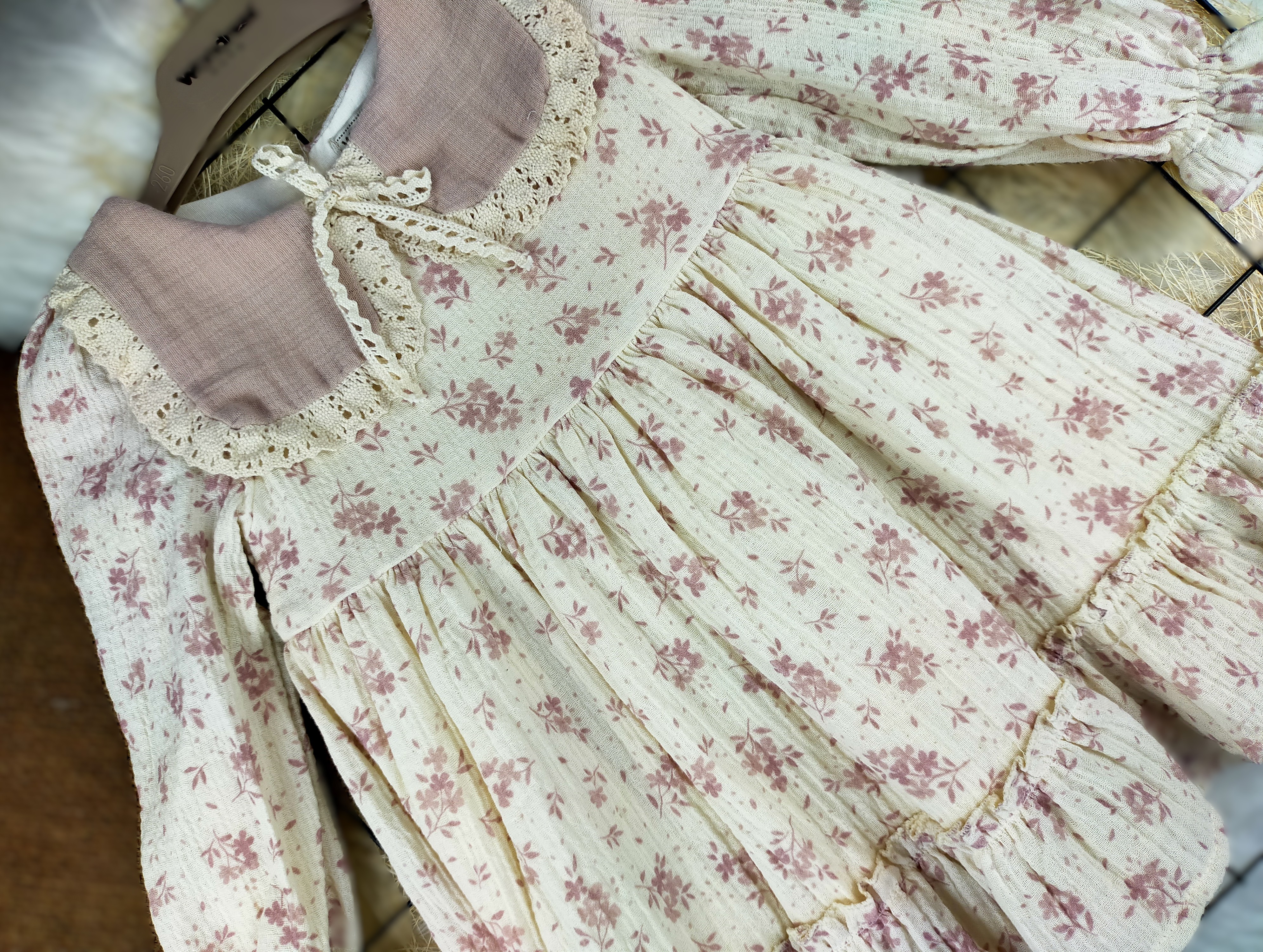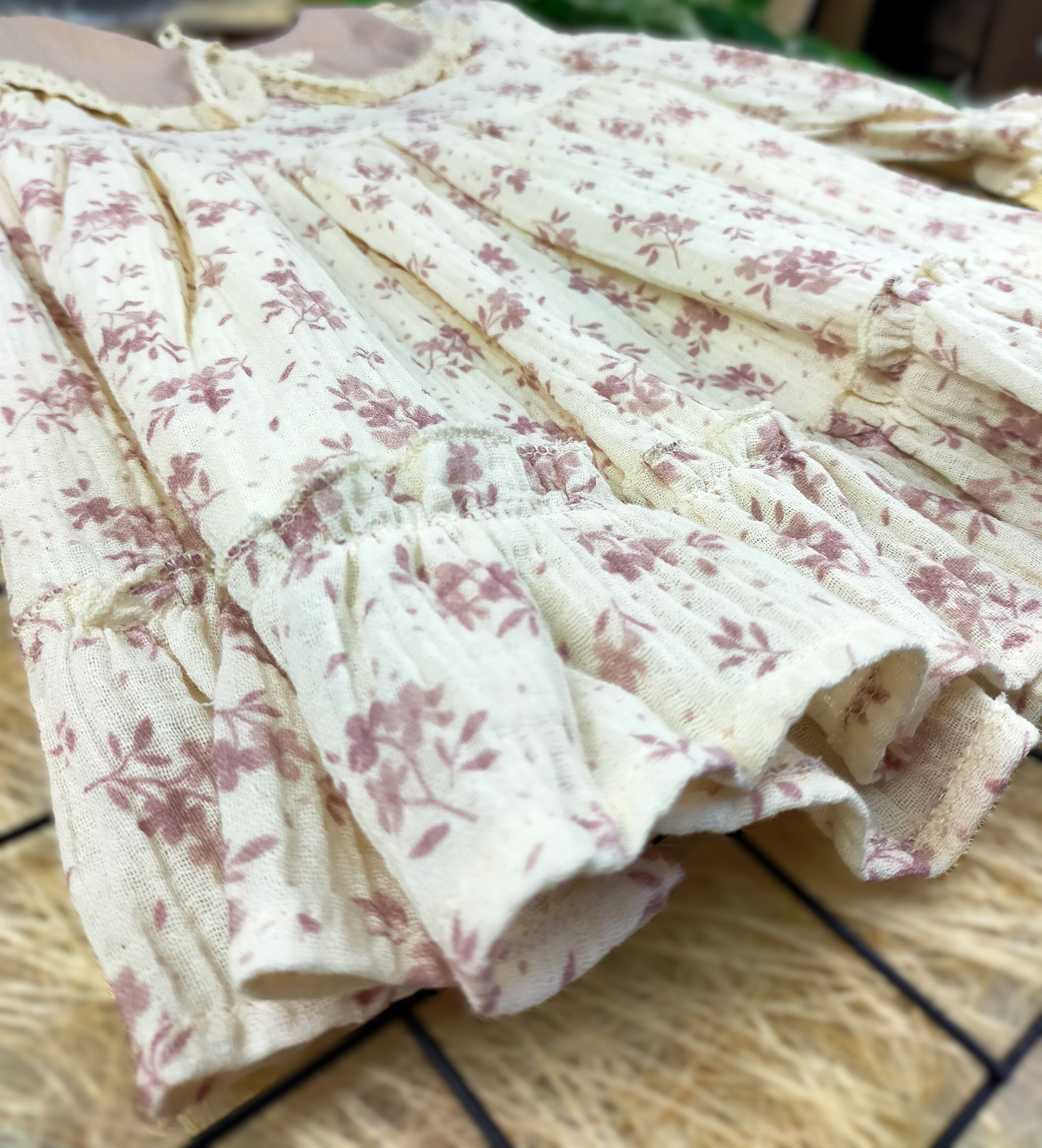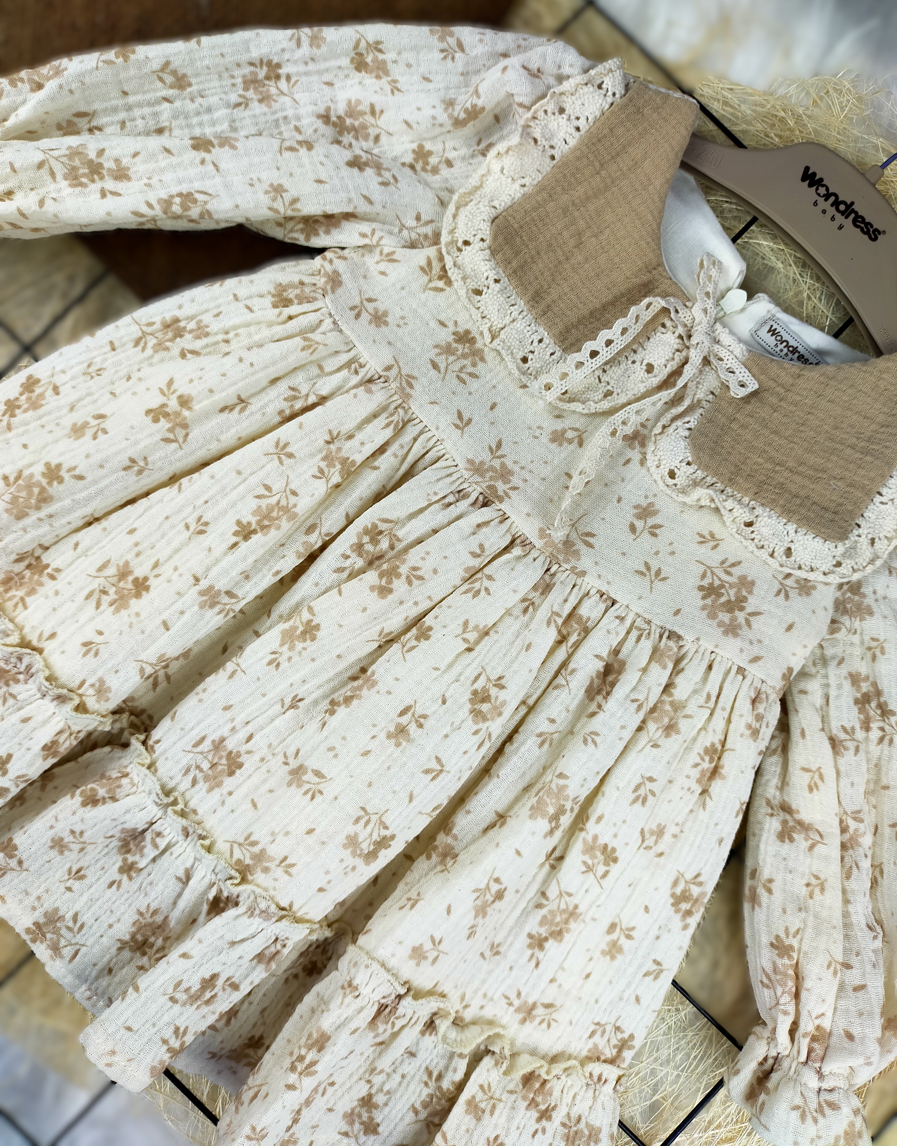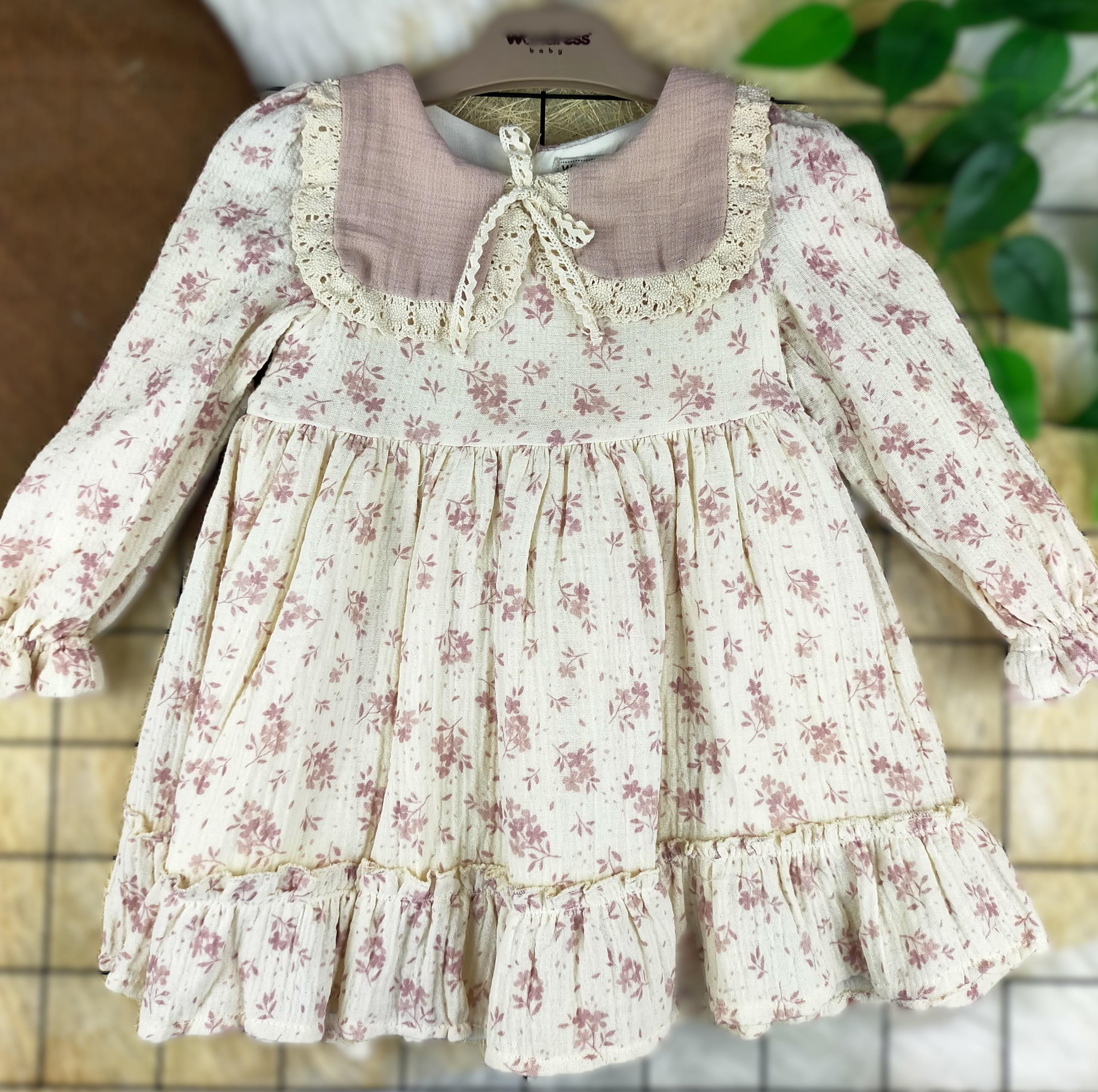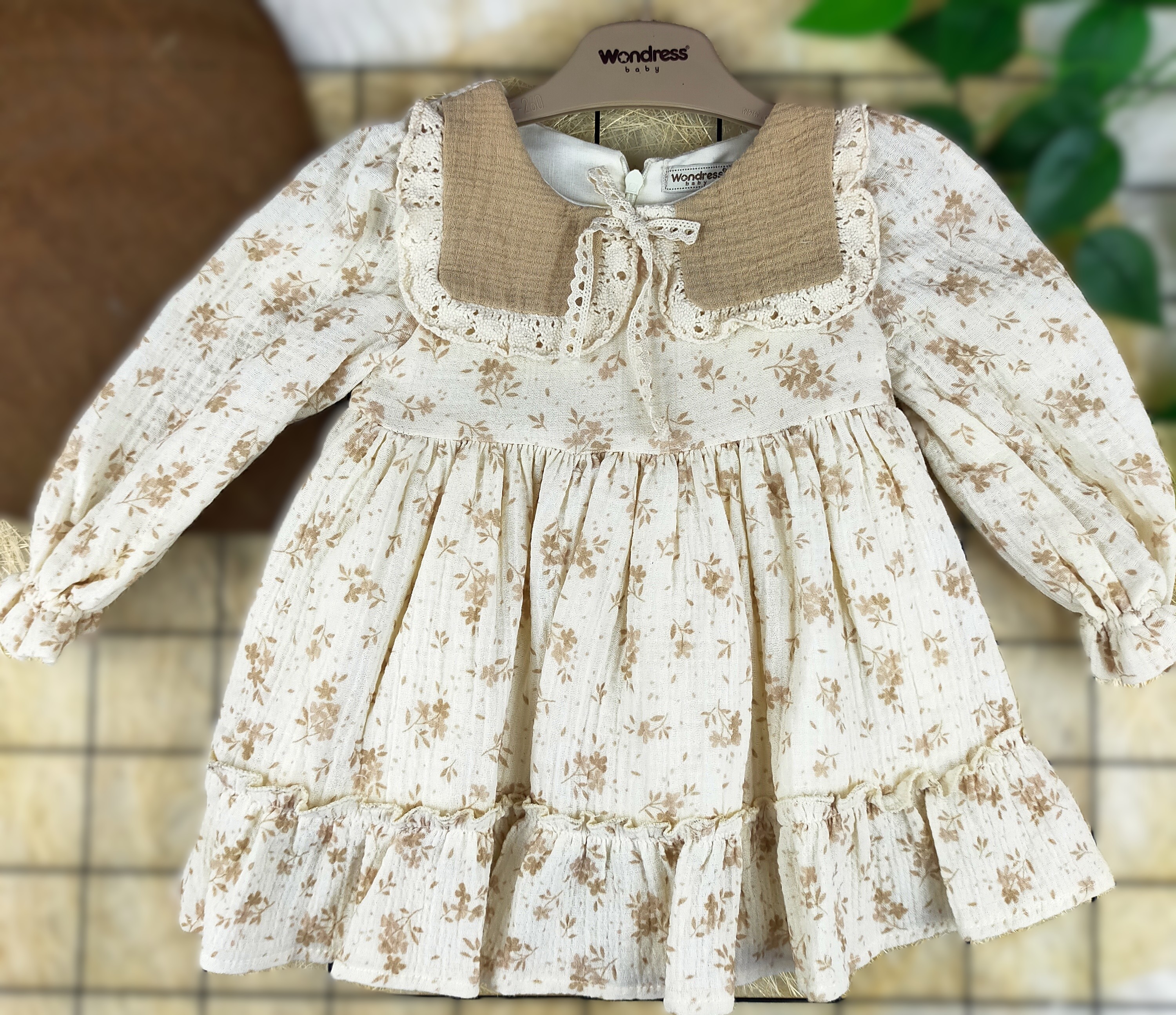 Bu elbise, hem günlük kullanımda hem de özel günlerde rahatça giyilebilir. Müslin kumaş, bebeklerin hassas cildine nazik davranırken, hareket özgürlüğü sağlar. Ayrıca, elbisenin yaka detayı, klasik ve şık bir görünüm sunarak, bebeğinizin en güzel anlarını ölümsüzleştiren anlarda parlamasına yardımcı olur.