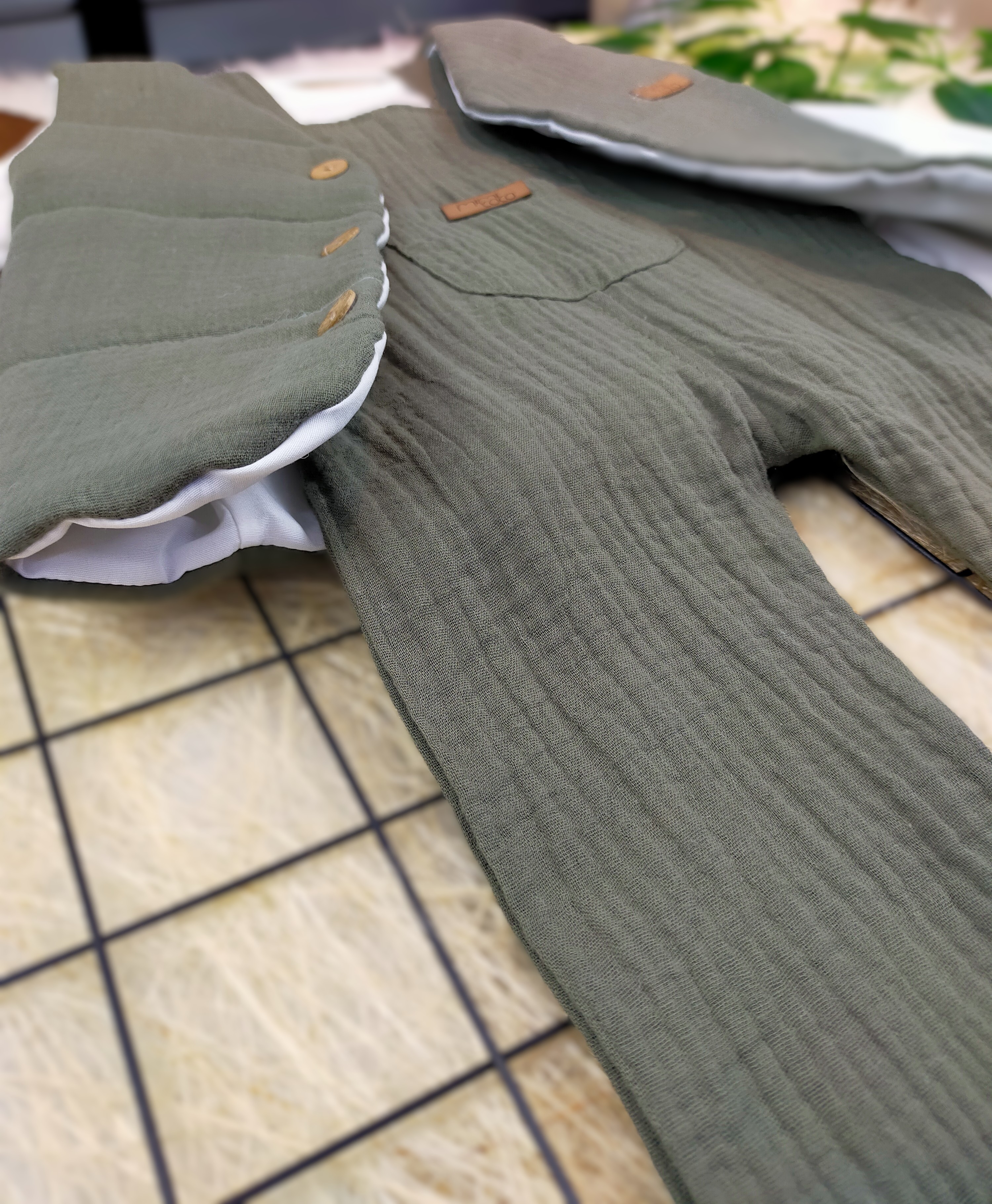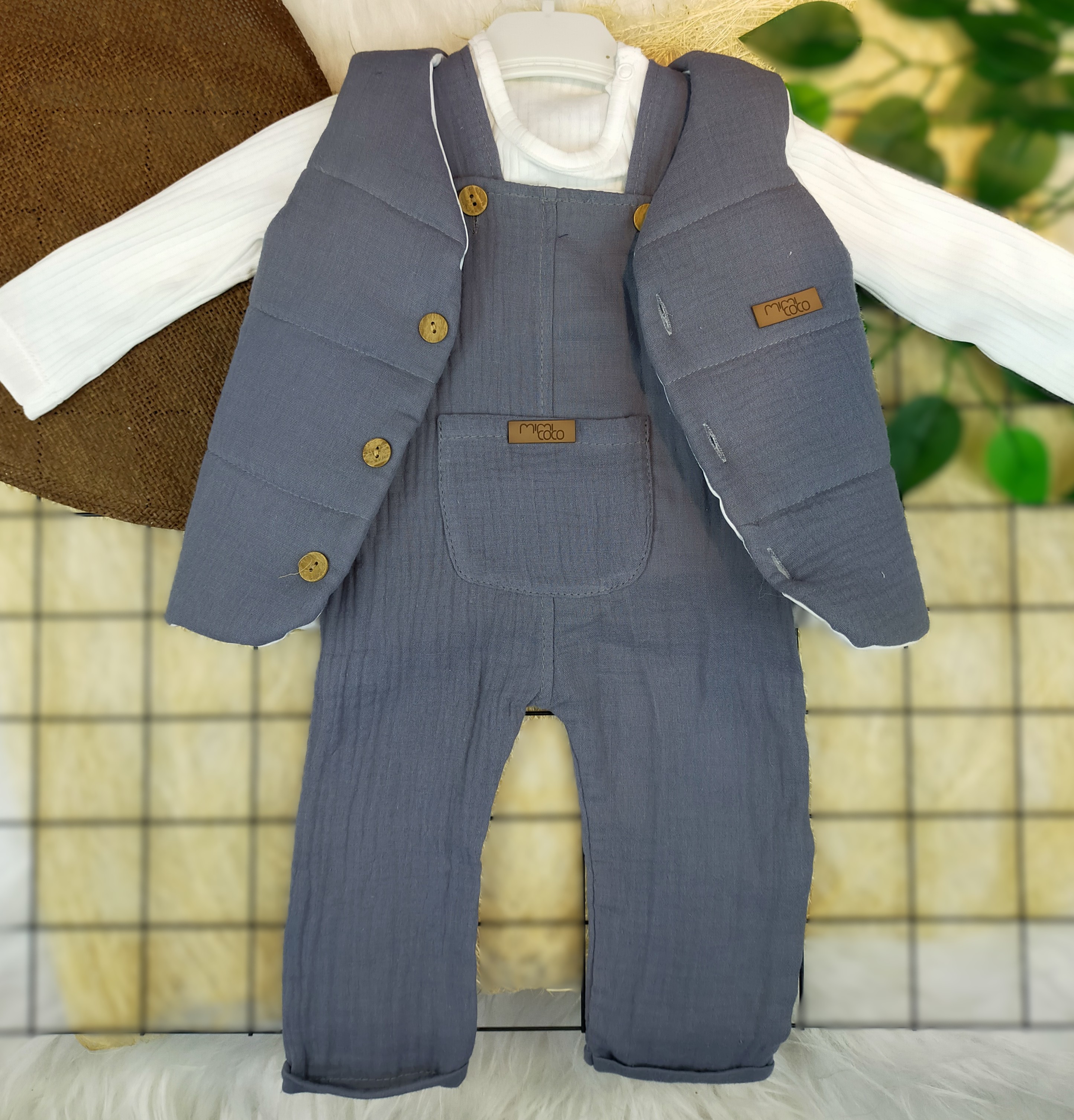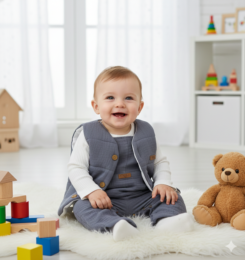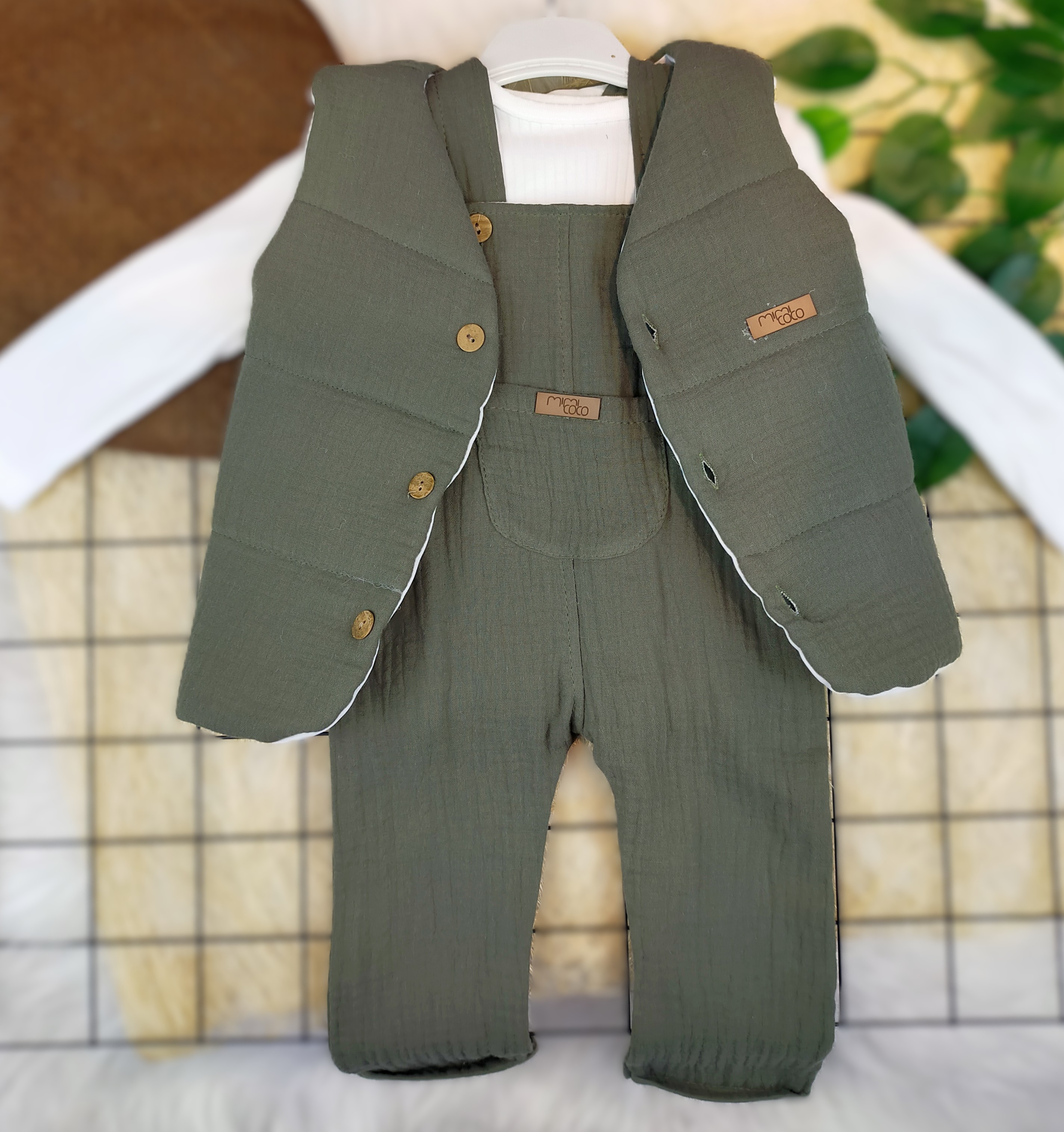 Çocuklar için hazırlanan 6 ay - 2 yaş arası müslin tulum, yelek ve badili şık takım, küçüklerin rahatlığını ve şıklığını bir araya getiriyor. Bu üçlü set, hem günlük kullanıma hem de özel günlere uygun tasarımıyla miniklerin stiline zarafet katıyor.