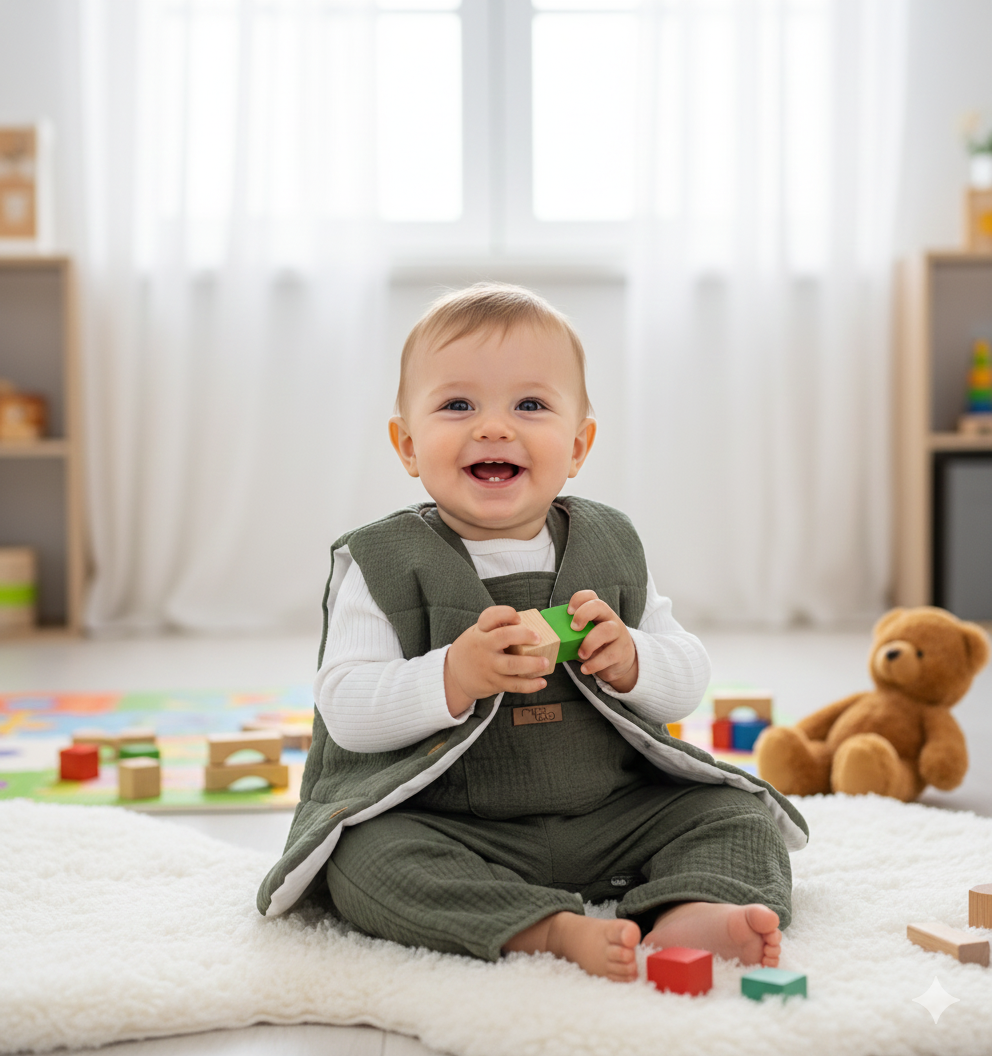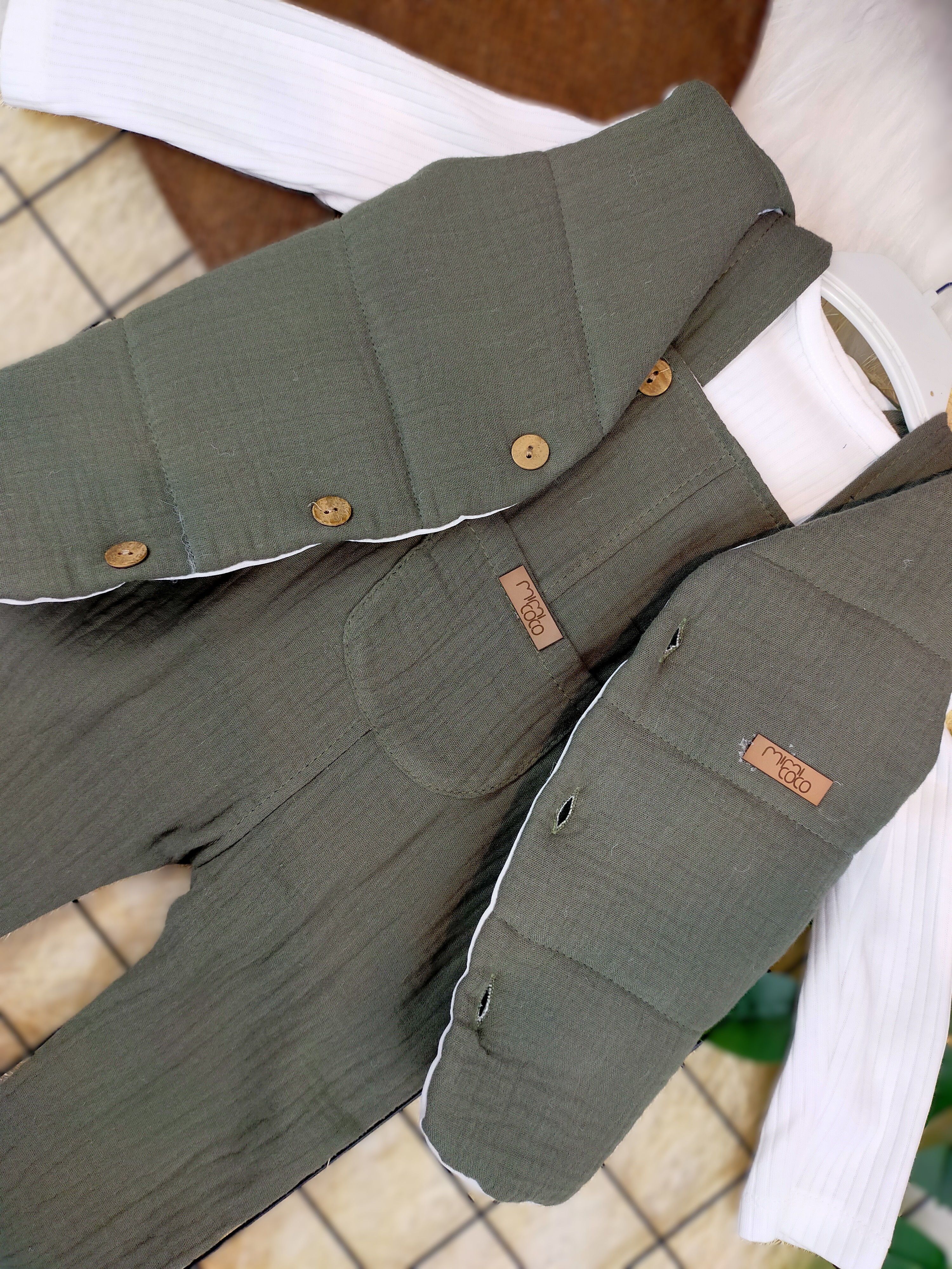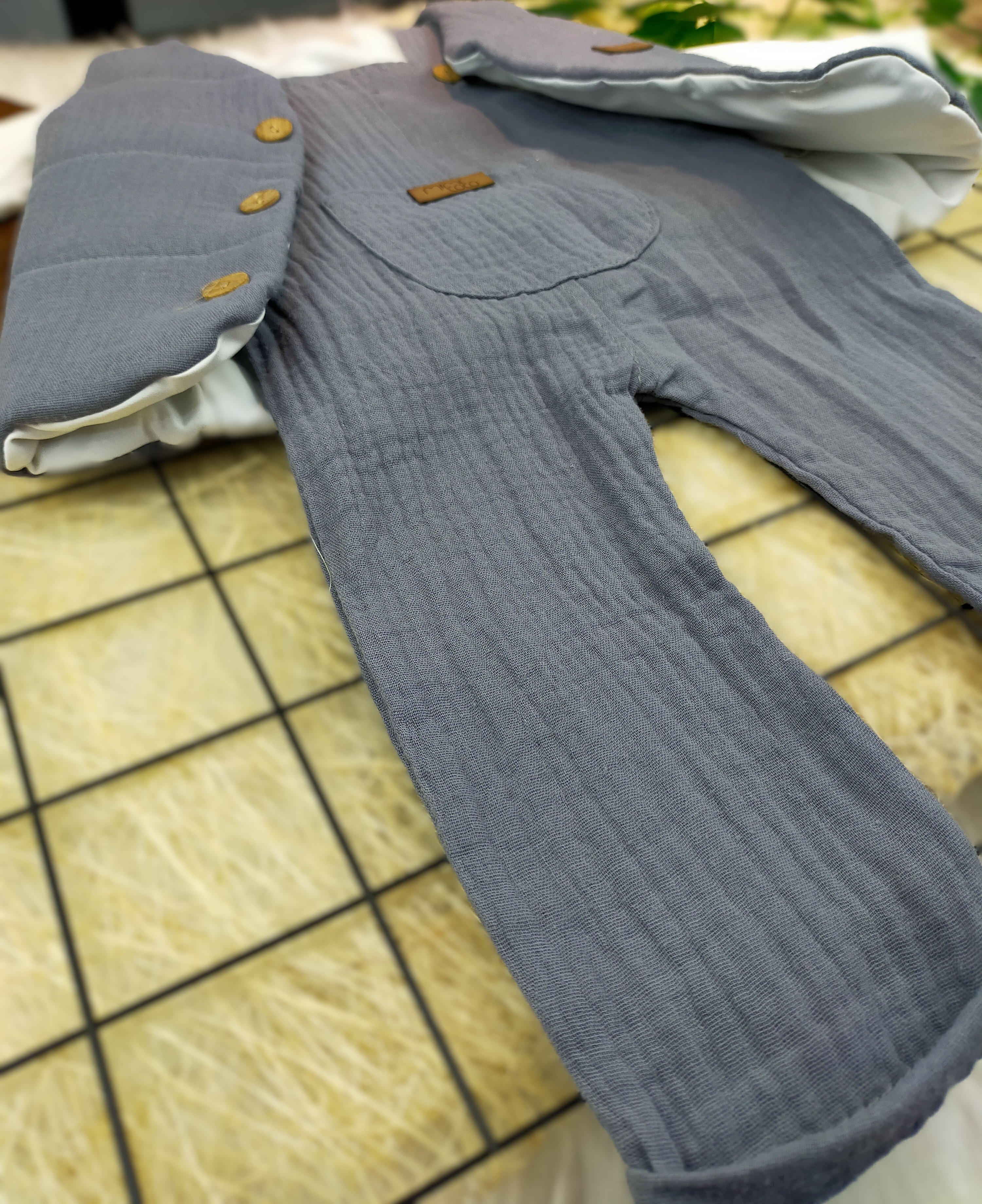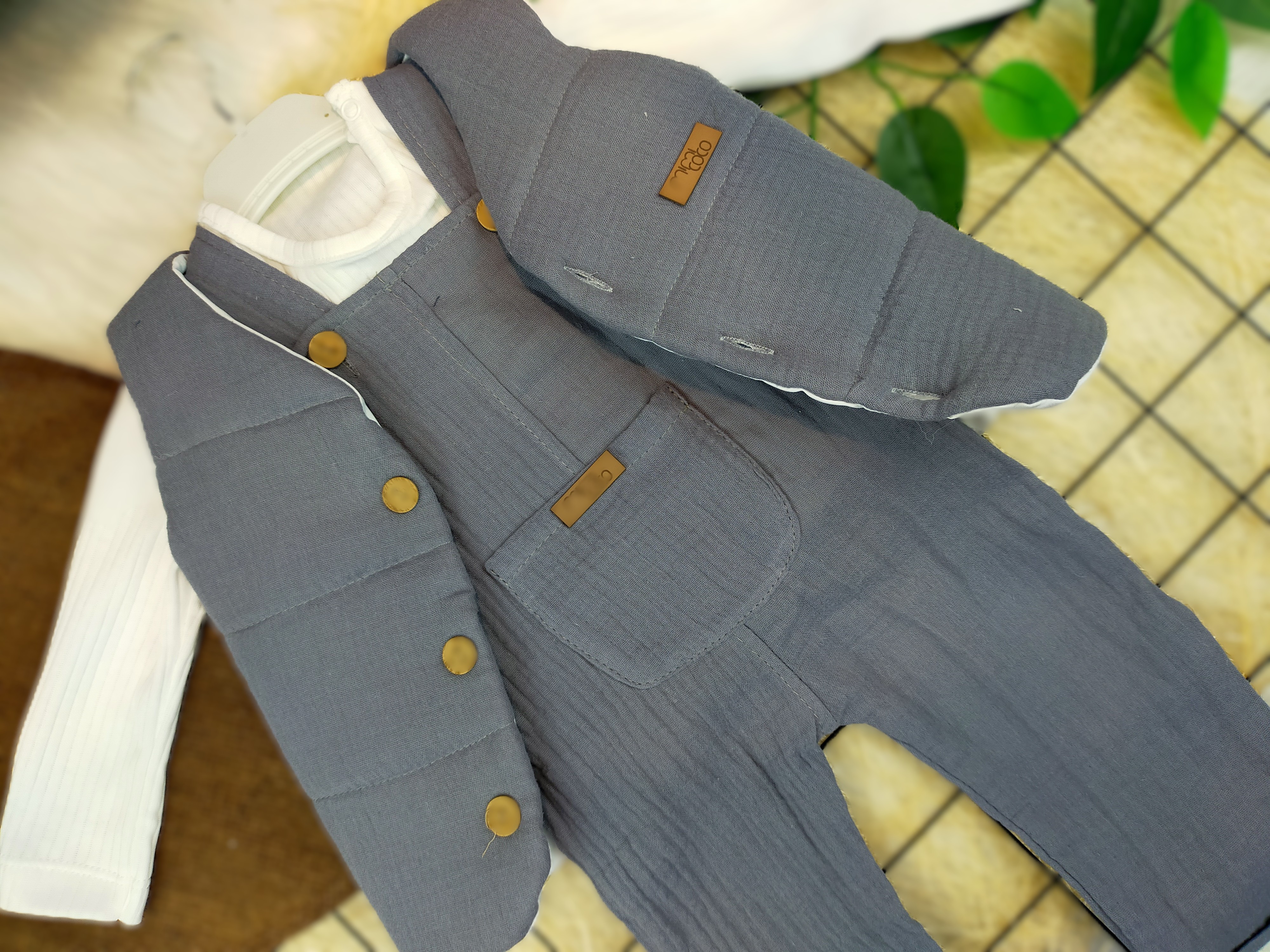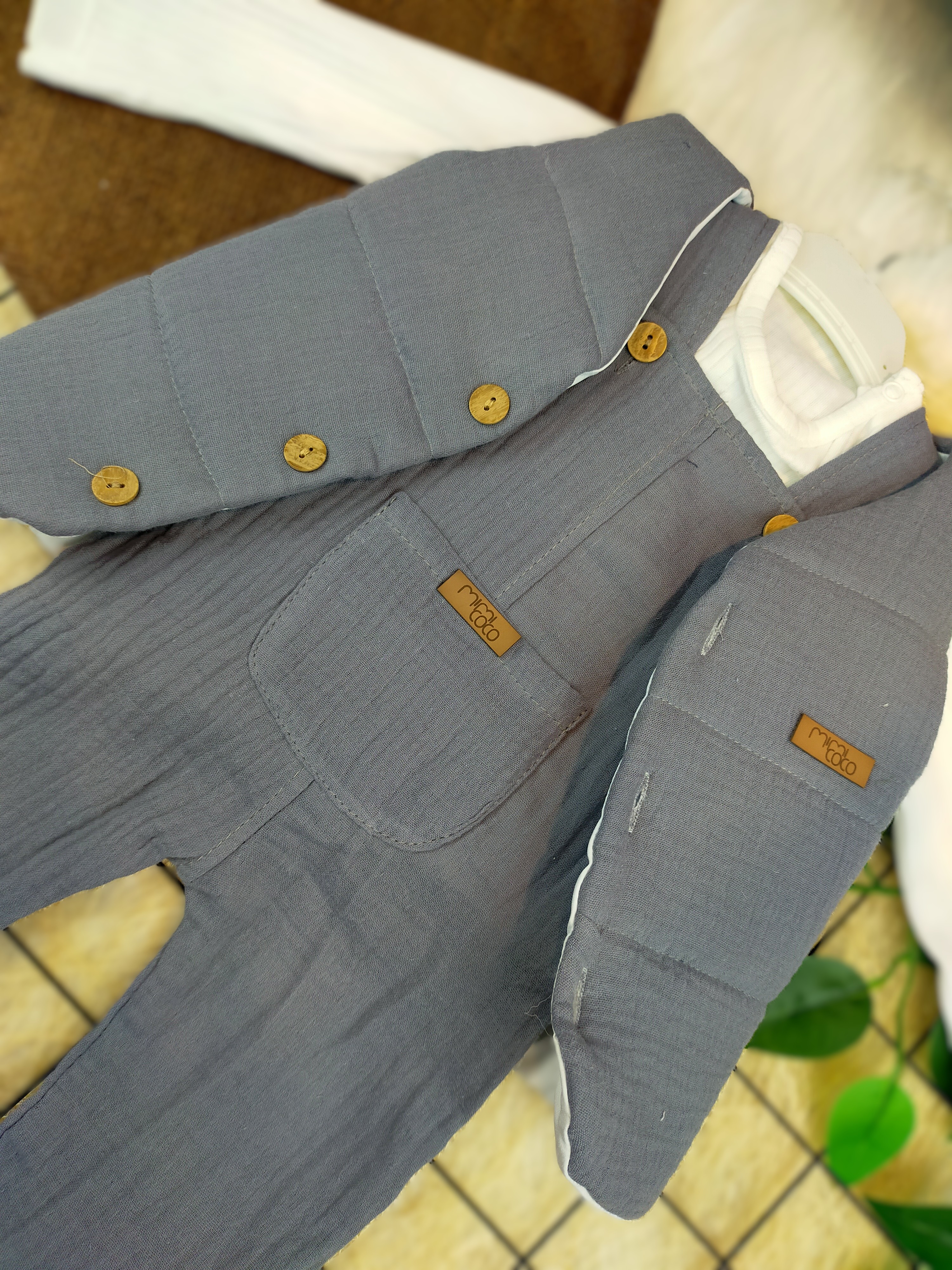 Çocuklar için hazırlanan 6 ay - 2 yaş arası müslin tulum, yelek ve badili şık takım, küçüklerin rahatlığını ve şıklığını bir araya getiriyor. Bu üçlü set, hem günlük kullanıma hem de özel günlere uygun tasarımıyla miniklerin stiline zarafet katıyor.