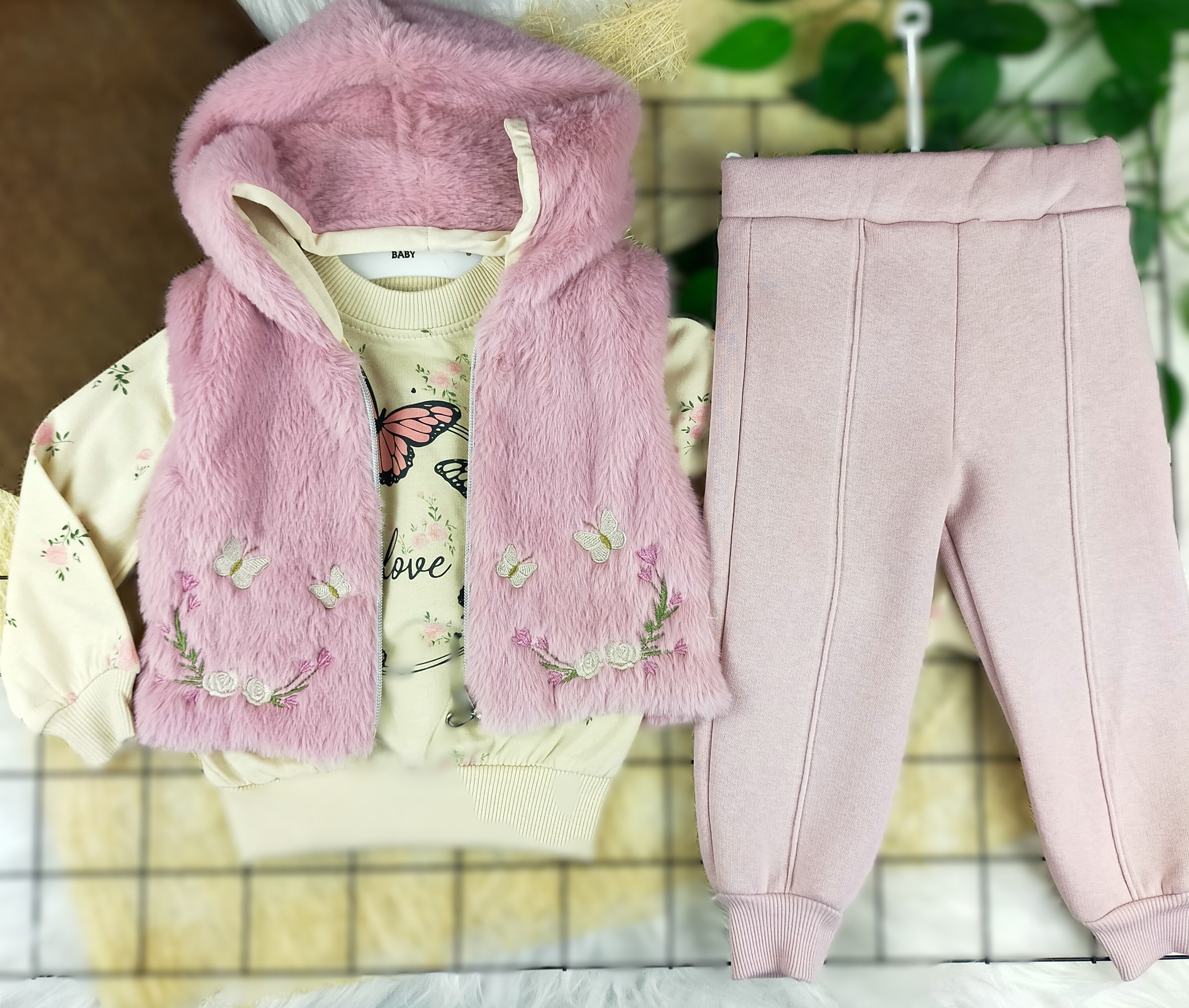 - Üç parça takımdır: yelek, tişört ve pantolon.
