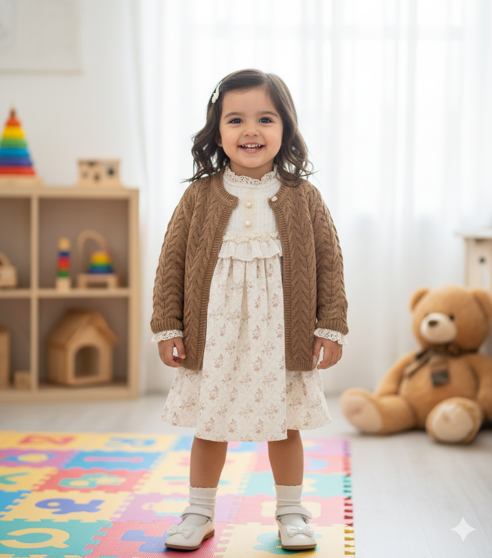 Çocuk modasında şıklık ve rahatlık arayan ebeveynler için tasarlanmış 6 Ay - 2 Yaş Arası Triko Hırkalı Müslin Elbise, miniklerin stilini tamamlamanın yanı sıra konforlu bir kullanım sunar. Bu elbise, her zaman dikkat çekici ve trendy olmak isteyen küçüklerin gardırobunun vazgeçilmez bir parçasıdır.