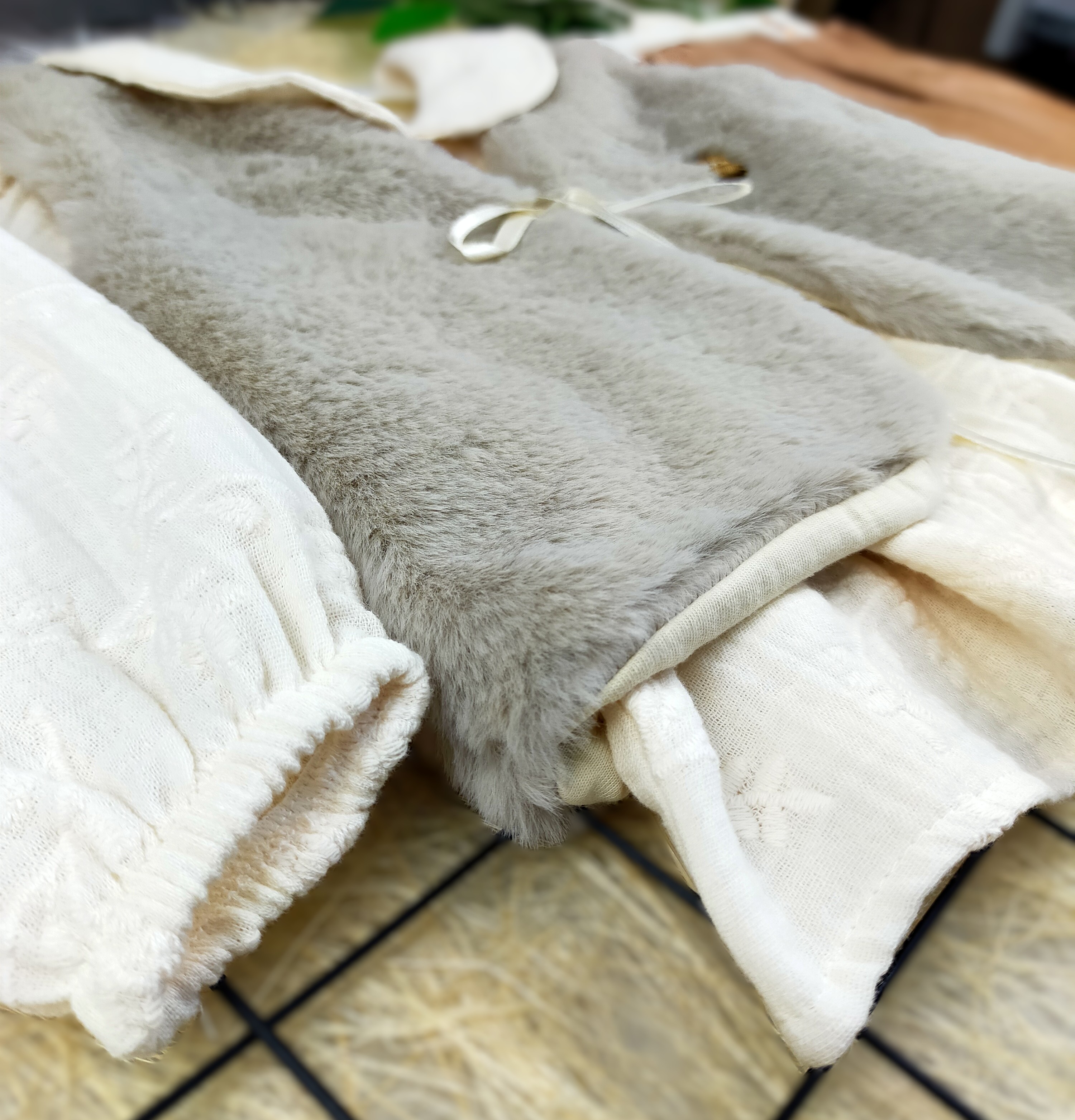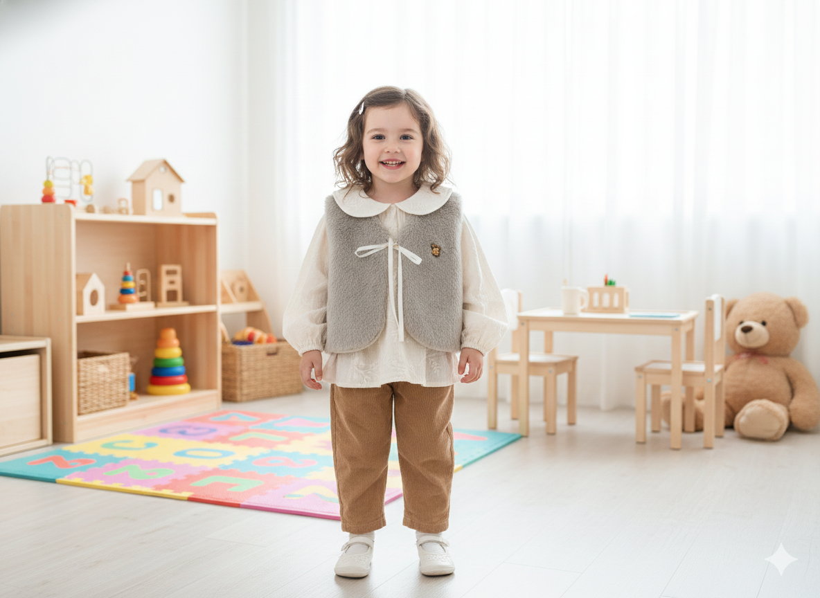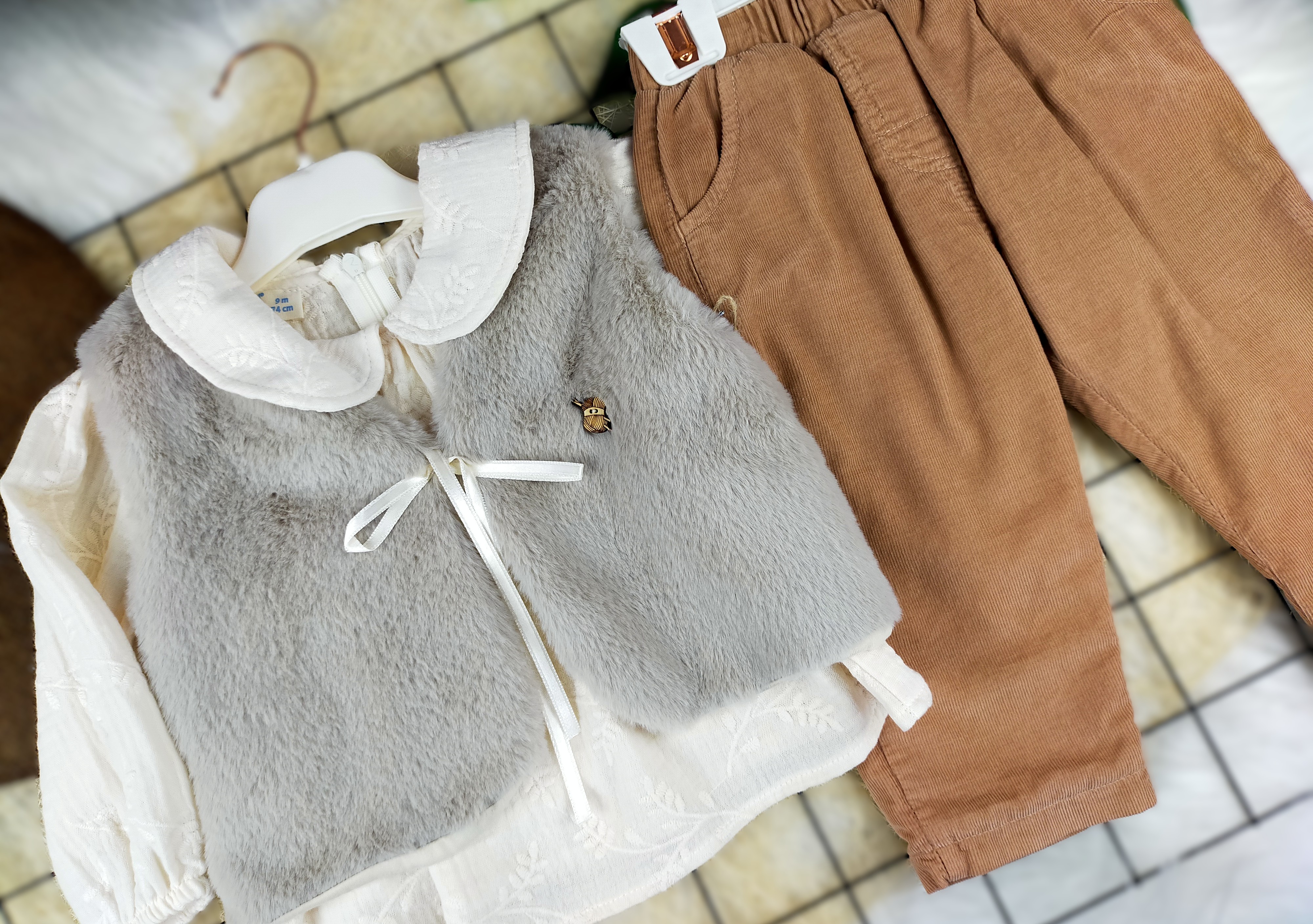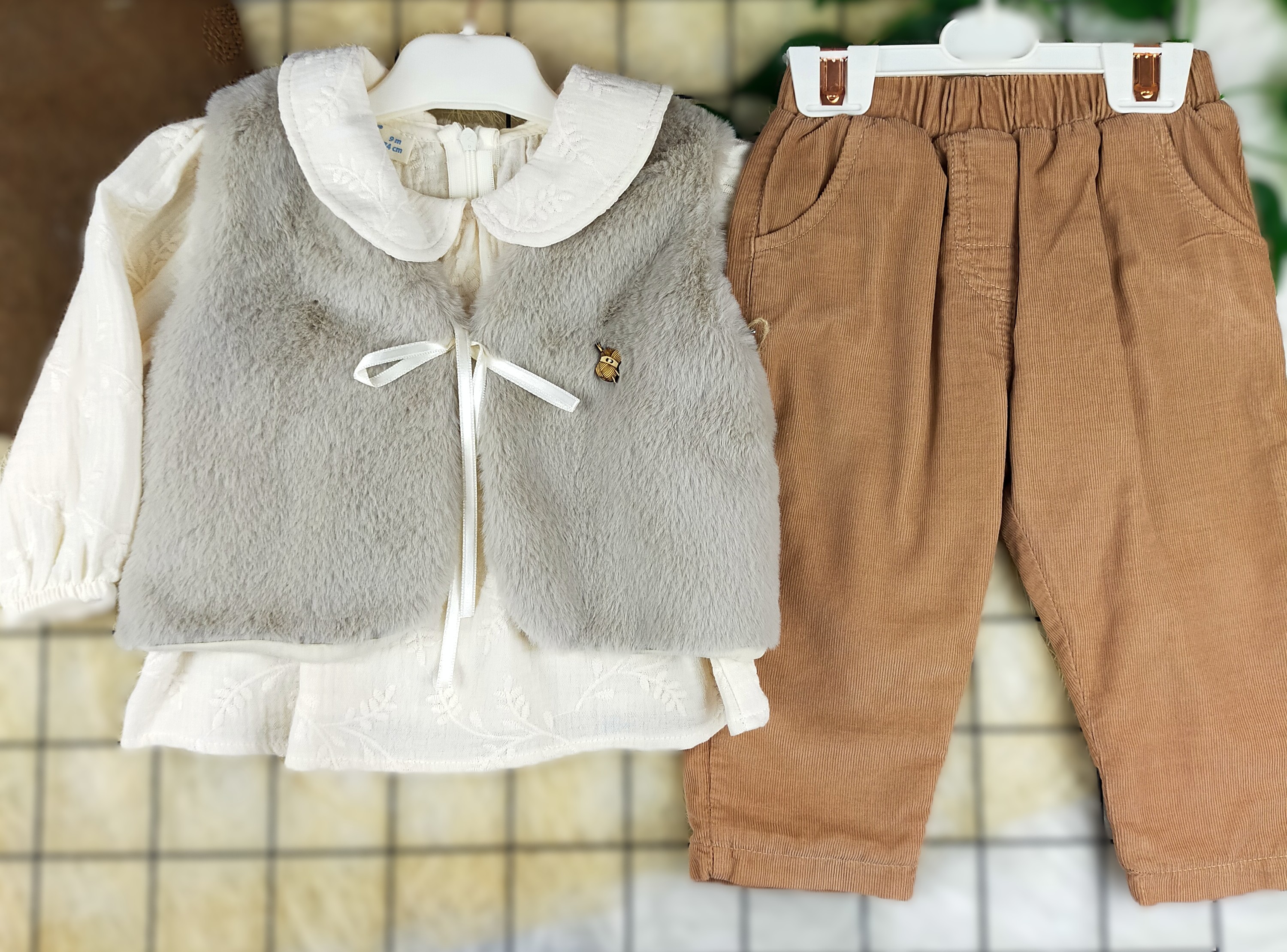 Bu takım, modern tasarımı ve seçkin renk seçenekleri ile dikkat çekiyor. Gömlek üzerindeki sevimli desenler ve peluş yeleğin zarif dokusu, miniklerin giyinme zevkini artırırken, kadife pantolonun şıklığıyla uyum içerisinde bir bütünlük oluşturur. Her parça, çocukların tarzına hitap eden bir estetik anlayışıyla hazırlanmıştır.