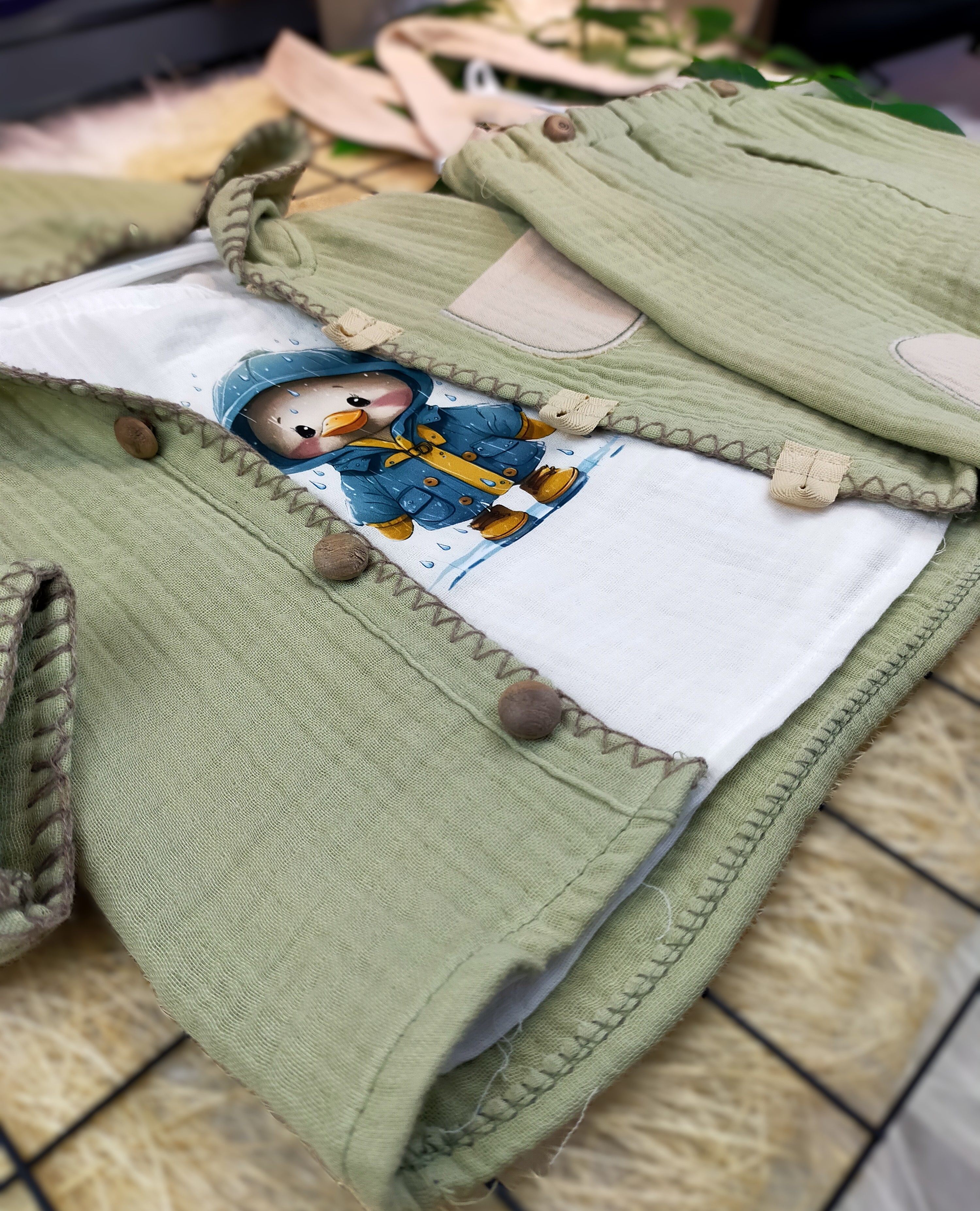 Takımın tamamlayıcı parçası olan askılı pantolon, hem şık hem de fonksiyonel bir tasarıma sahiptir. Ayarlanabilir askıları sayesinde, çocuğunuzun bedenine uygun bir şekilde giydirilebilir. Rahat kesimi, miniklerin özgürce hareket etmesini sağlar. Pantolonun üst kısmında bulunan civciv desenleri, takıma uyumlu bir şekilde tasarlandığı için sevimlilik katmaktadır.