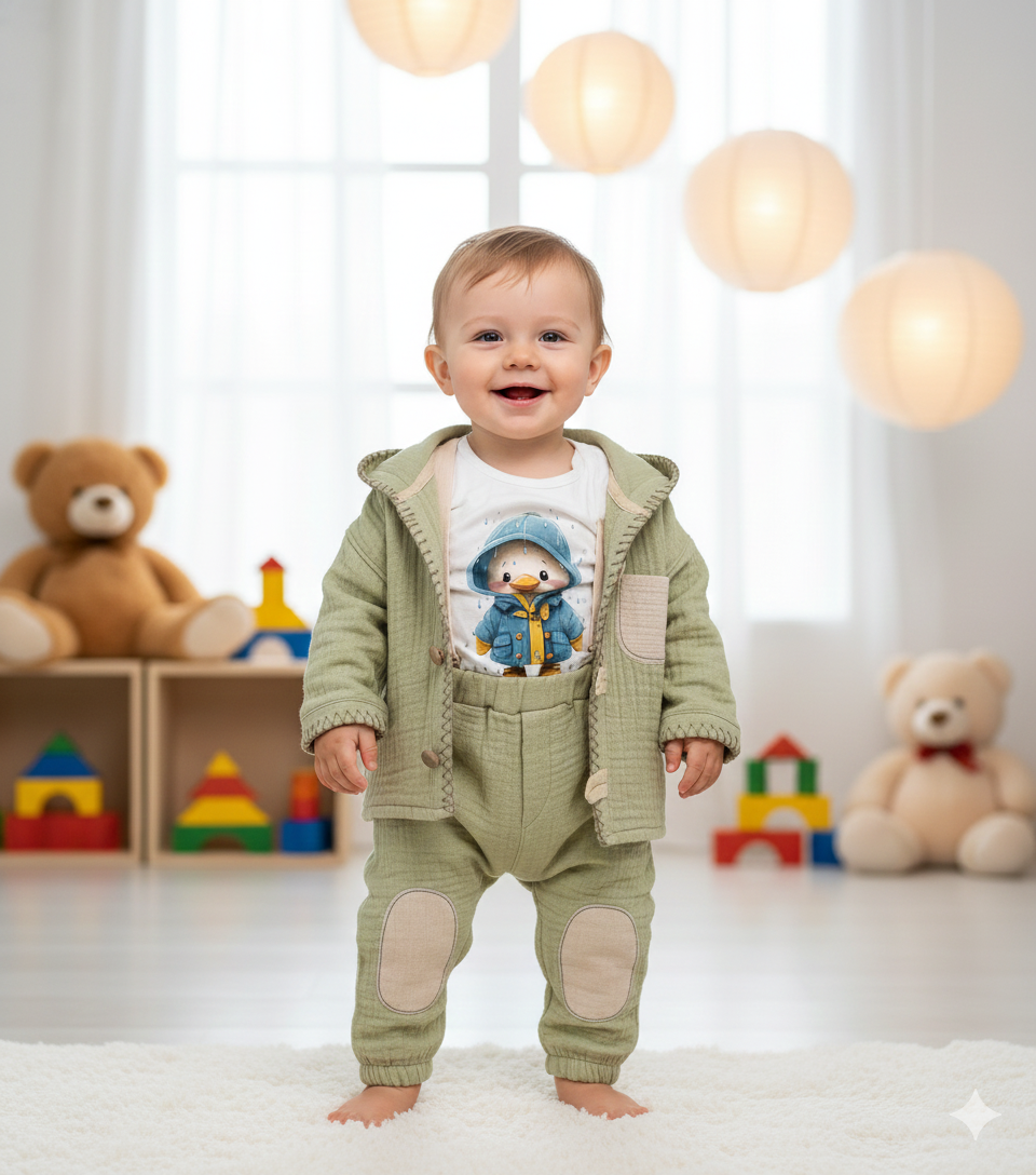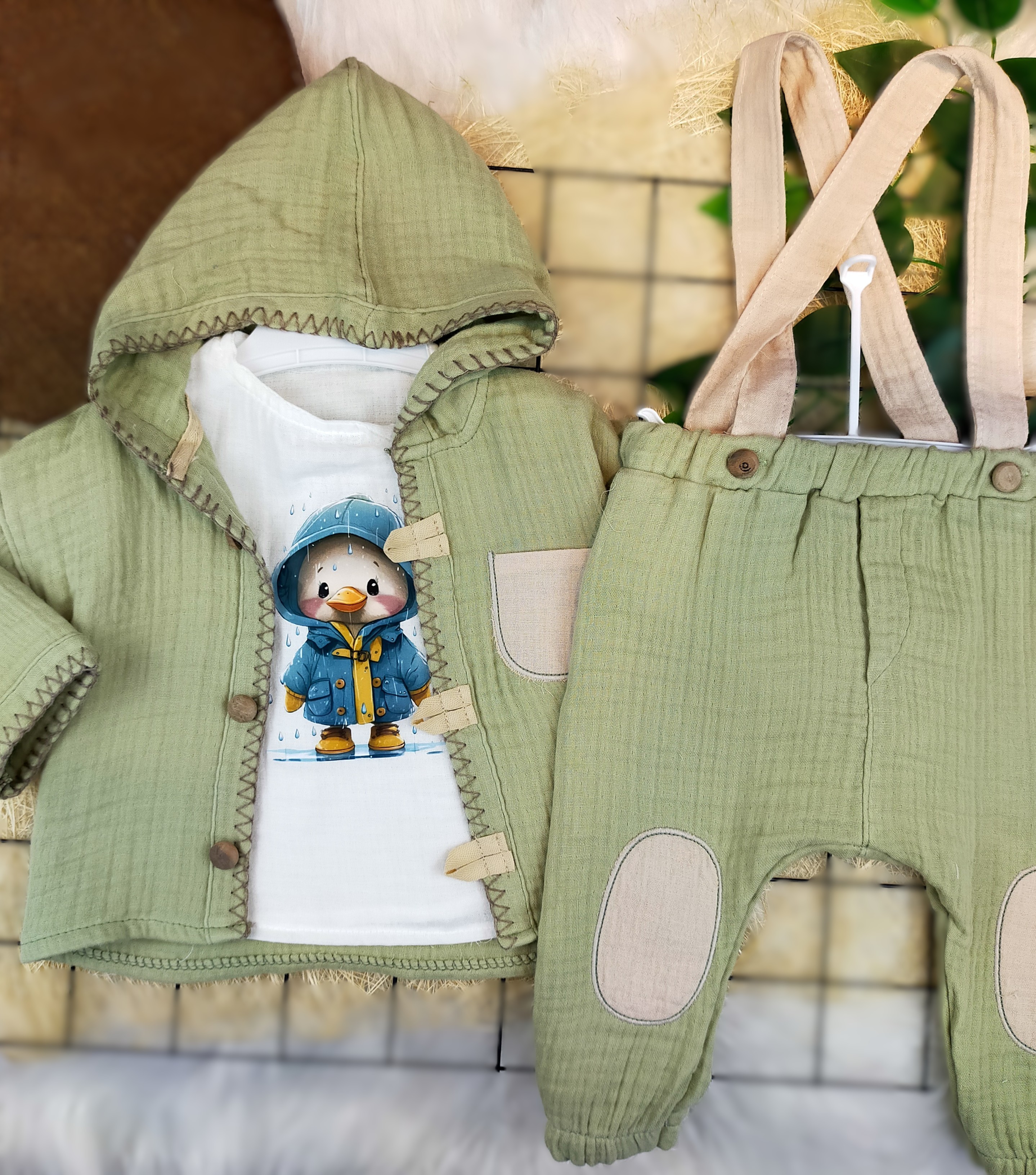 Miniklerin rahatlığını ve şıklığını ön planda tutarak tasarlanmış bu sevimli üçlü müslin takım, 9 ay ile 2 yaş arası çocuklar için idealdir. İçerisinde bulunan kapşunlu hırka, sweatshirt ve askılı pantolon ile kombinlenerek, hem günlük kullanımda hem de özel anlarda rahatça tercih edilebilir.