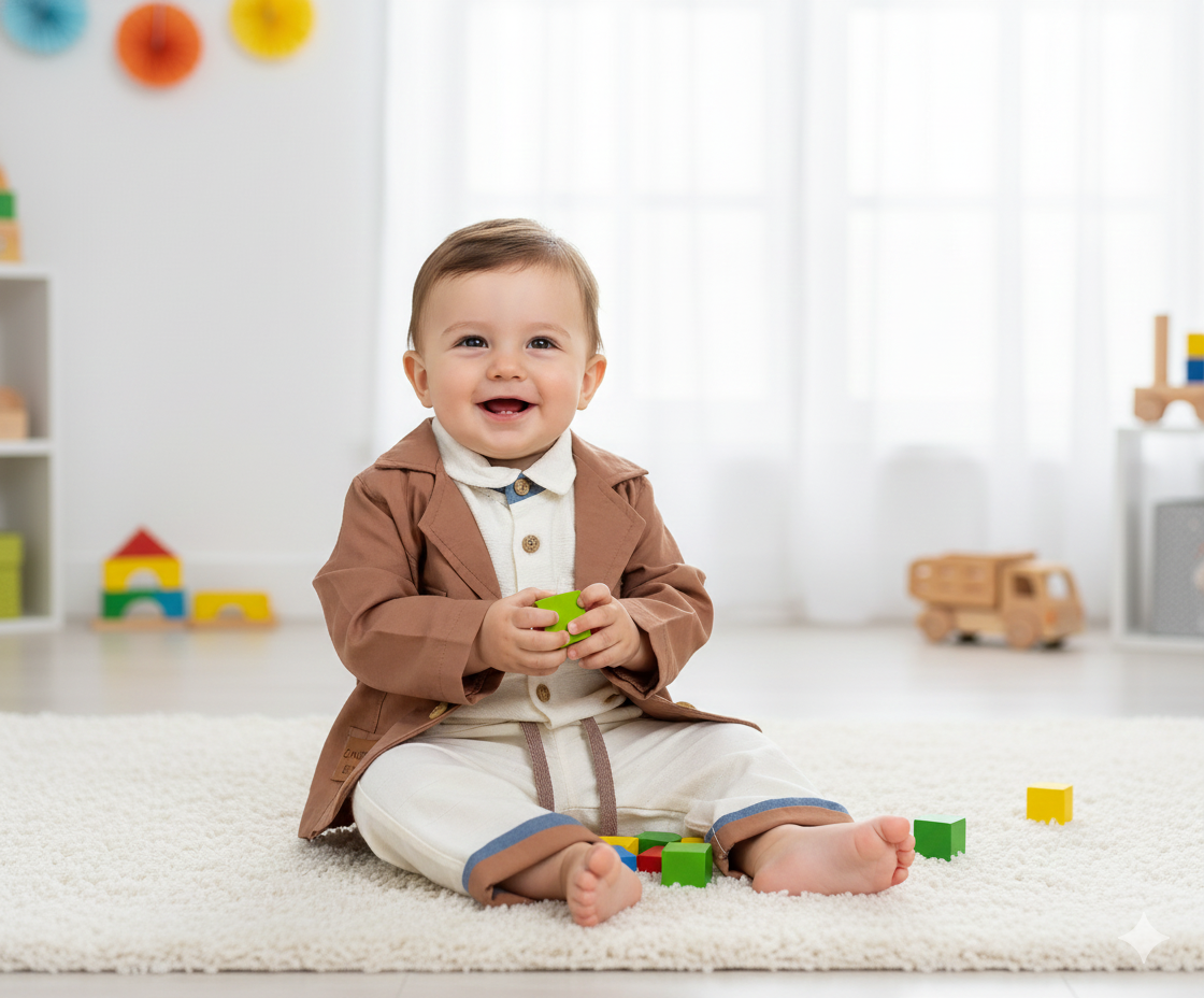 Bebeklerimiz için tasarlanmış olan bu üçlü takım, şıklık ile konforu bir arada sunmaktadır. 9 ay ile 2 yaş arasındaki küçük beyler için mükemmel bir seçenek olan bu kombin, özel günlerde, aile buluşmalarında veya günlük kullanımda rahatlıkla tercih edilebilir.