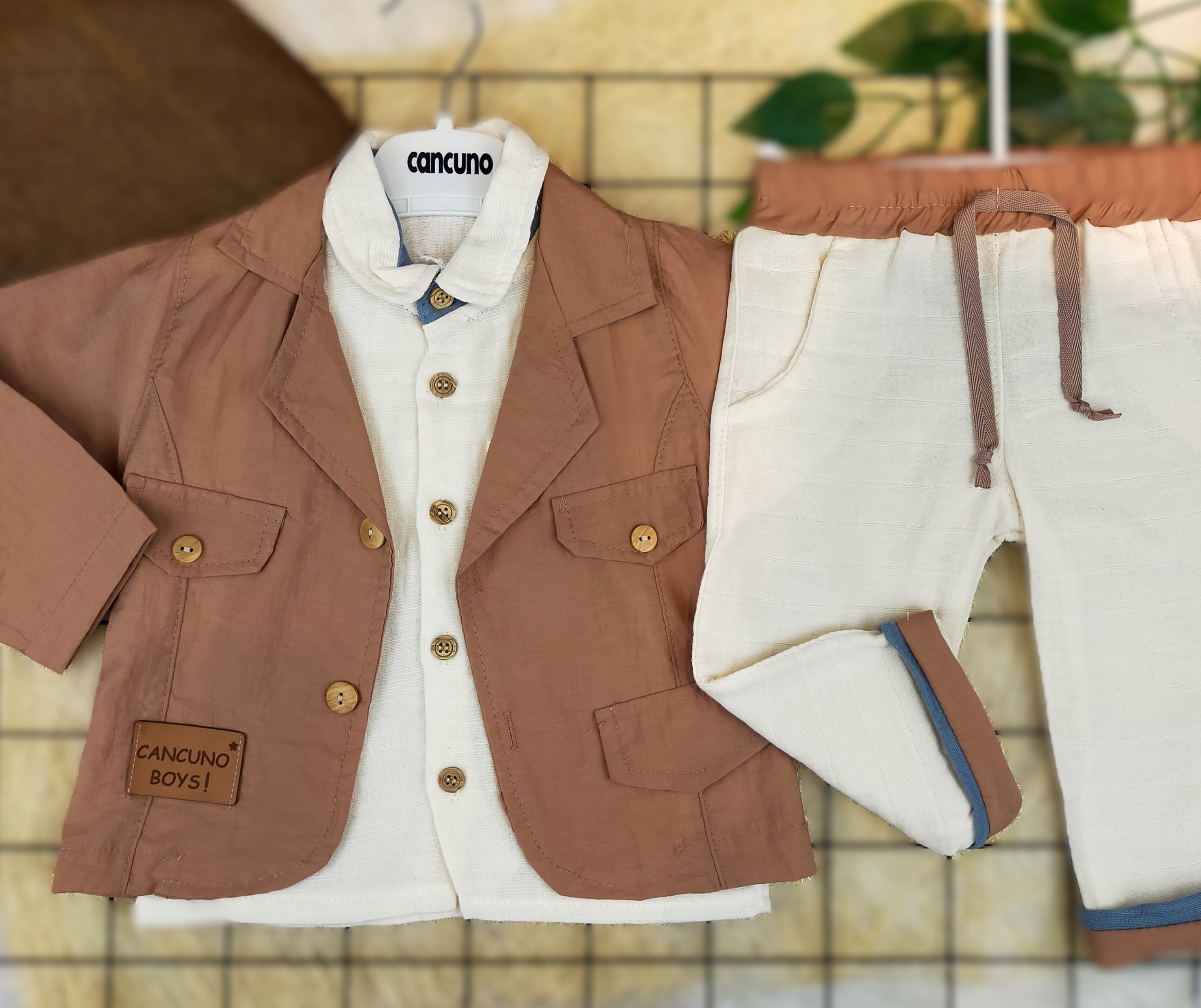 9 Ay - 2 Yaş Arası Keten Ceket, Müslin Gömlek ve Müslin Pantolonlu Üçlü Erkek Bebek Takımı