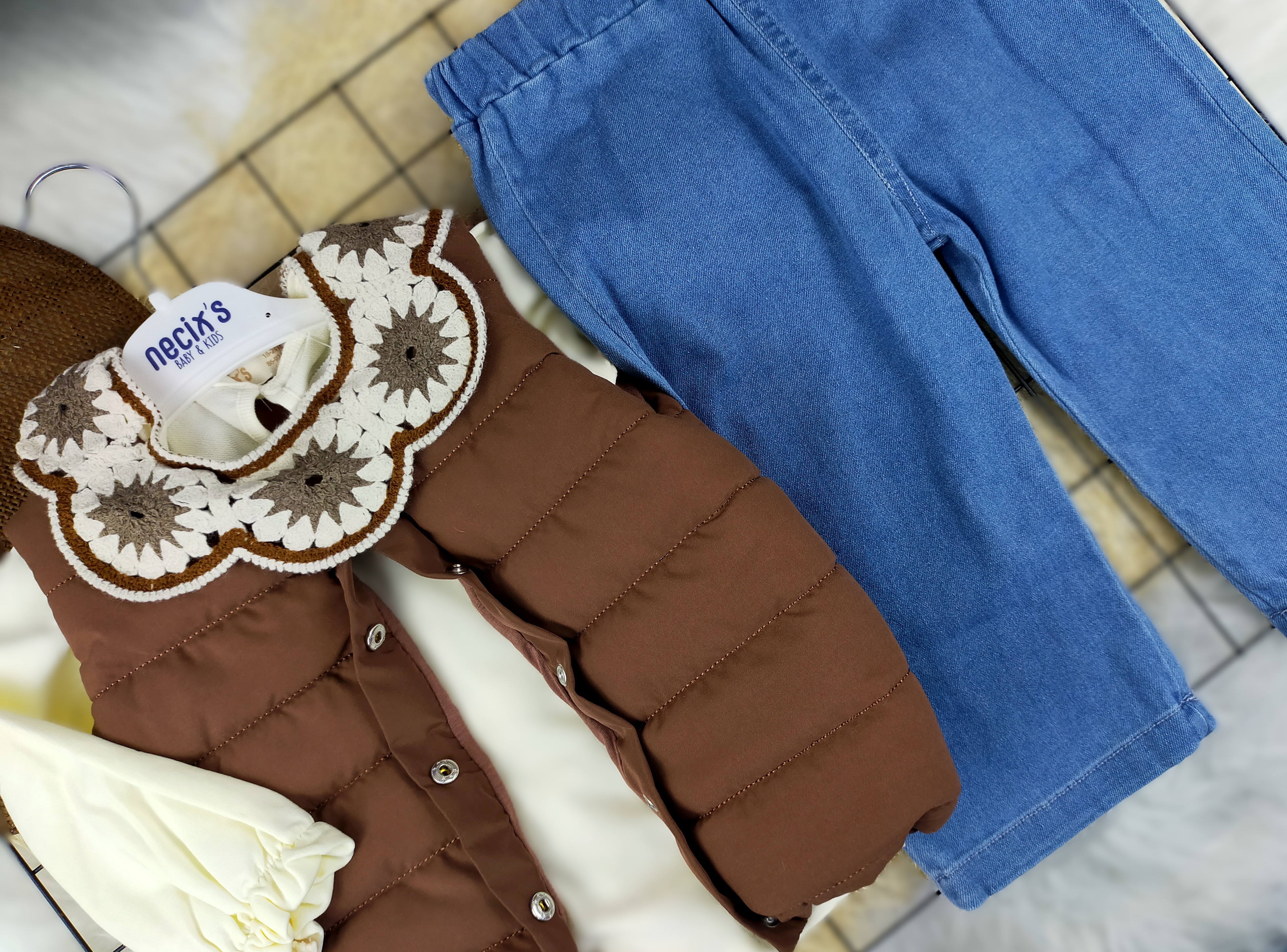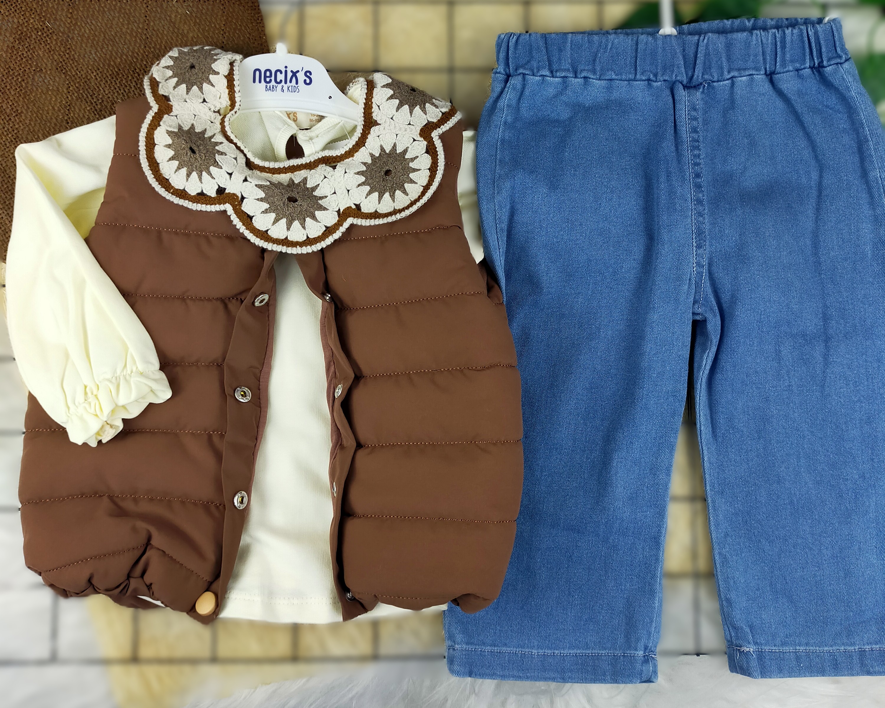 Küçük prensesler için tasarlanmış olan bu şık ve konforlu şişme yelek bol paça kot ve yaka işlemeli kız bebek takımı, hem yaz hem de kış aylarında rahatlıkla kullanılabilir. 9 ay ile 2 yaş arasındaki bebekler için ideal bir seçenektir ve hem günlük hem özel günlerde mükemmel bir kombin sunar.