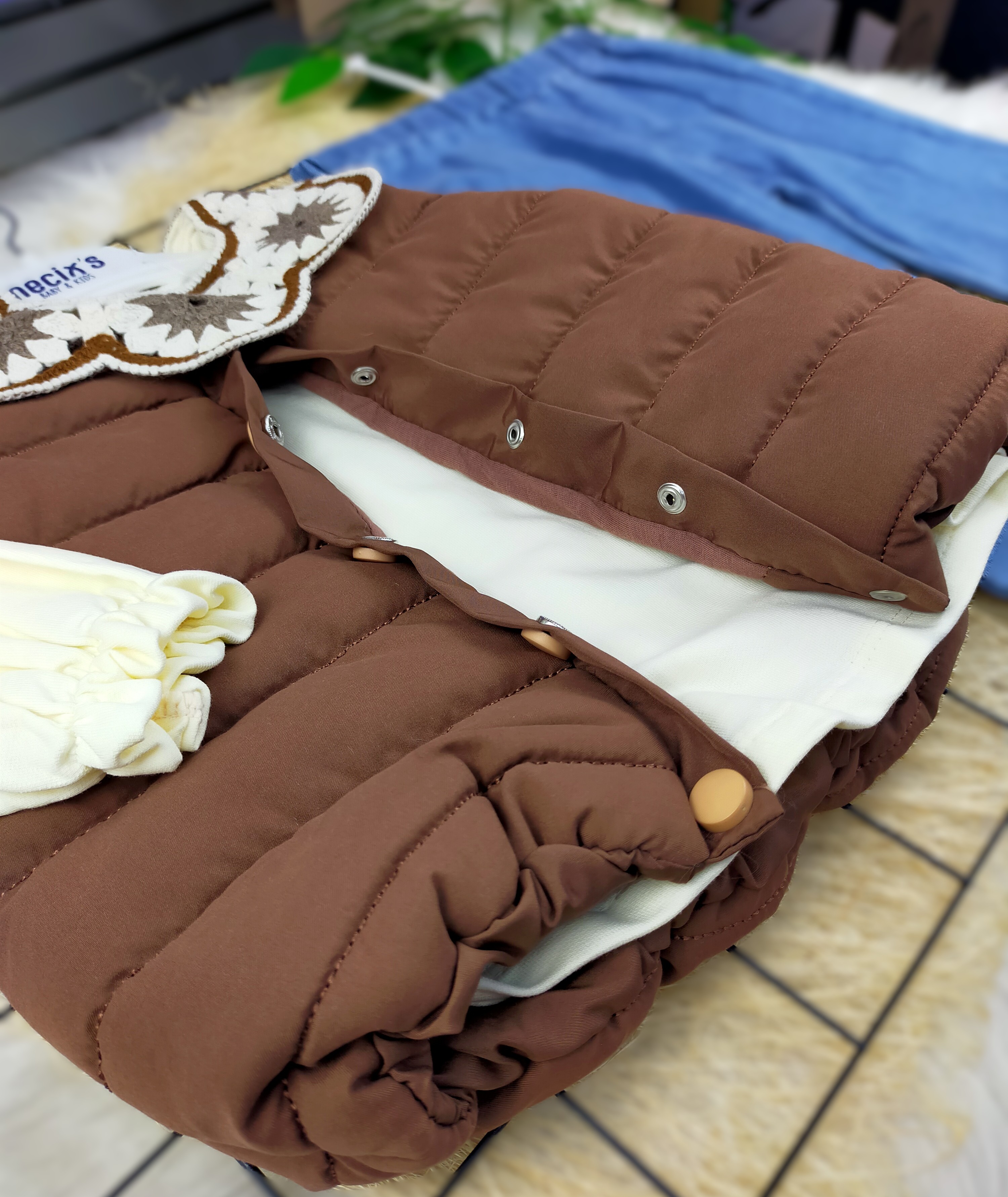 Bebeğinizin rahatlığı her zaman önceliğimizdir. Bu takım, geniş kesimi ve esnek hatları sayesinde bebeğinizin hareket etmesini kolaylaştırır. Şişme yeleği, soğuk havalarda ekstra koruma sağlarken, bol paça pantolon hem şık görünüm hem de hareket özgürlüğü sunar. Yaka işlemeler ise zarif bir dokunuş katarak, giydirirken şıklığı asla unutturmaz.